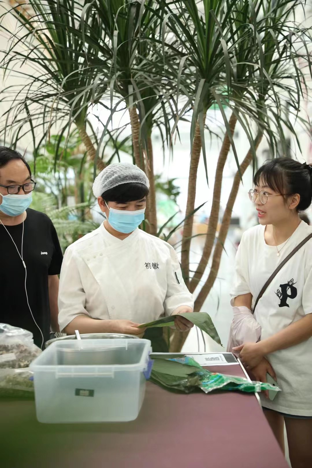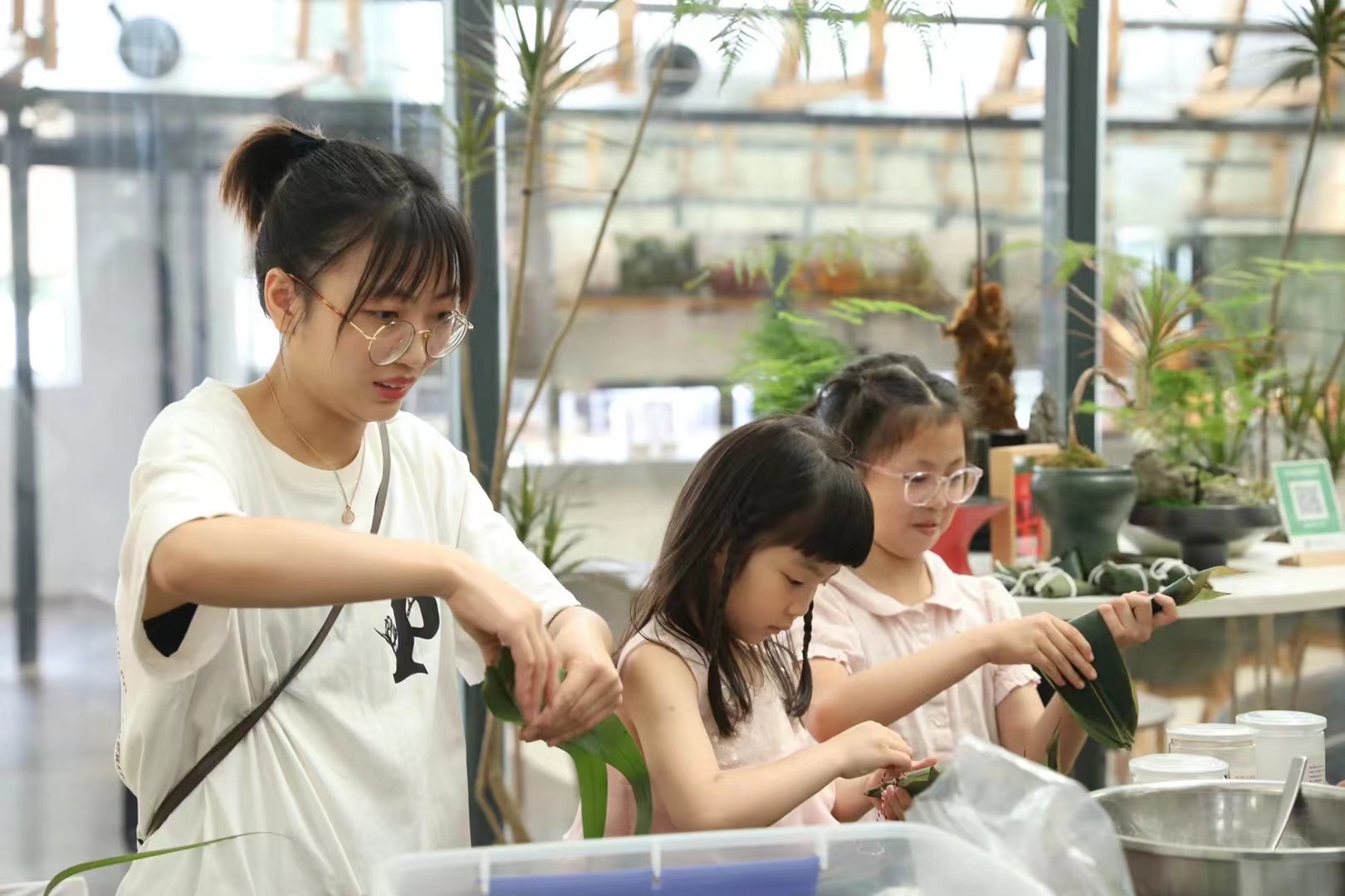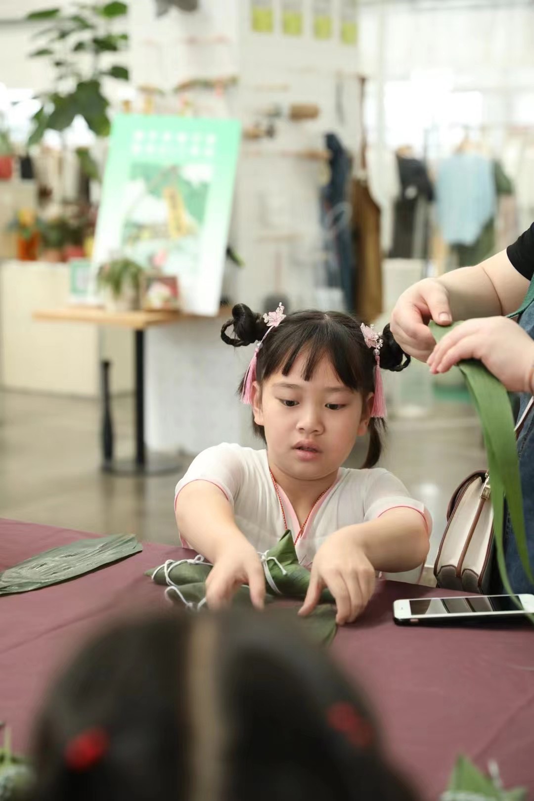 小朋友们领取一份包粽子材料,跟着现场有着丰富经验的阿姨学习包粽子的顺序,包出一个完整的粽子~