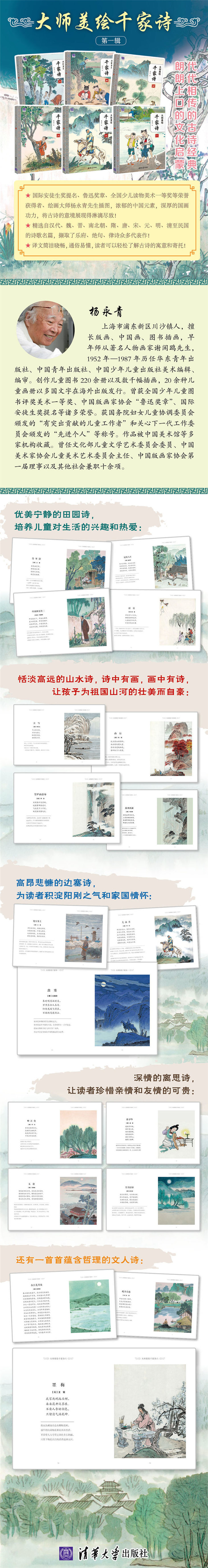 | 《大师美绘千家诗一》选取了汉代至唐代的古诗代表作,如《观沧海》《归园田居》《春江花月夜》《春晓》《过故人庄》等。 |