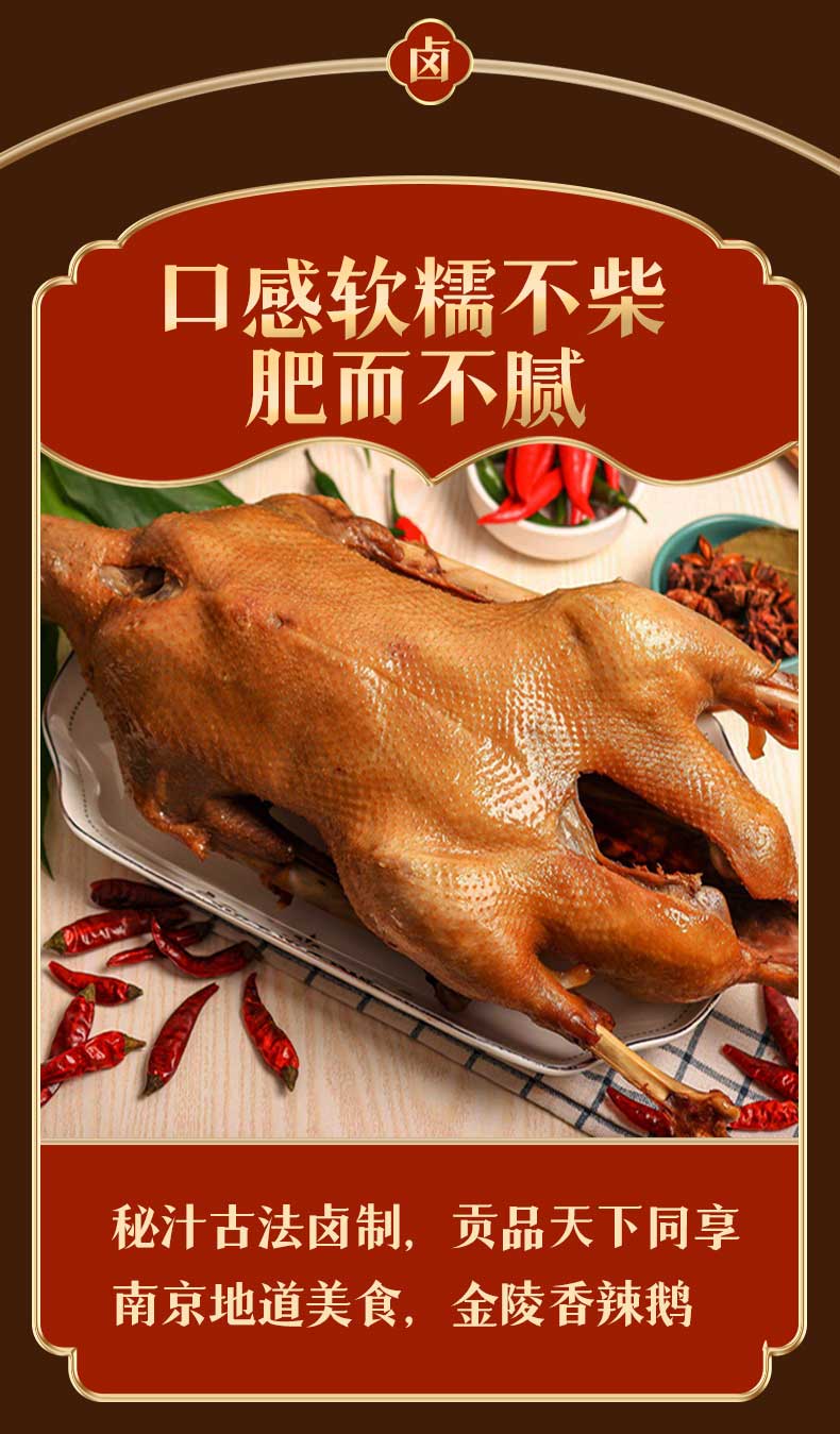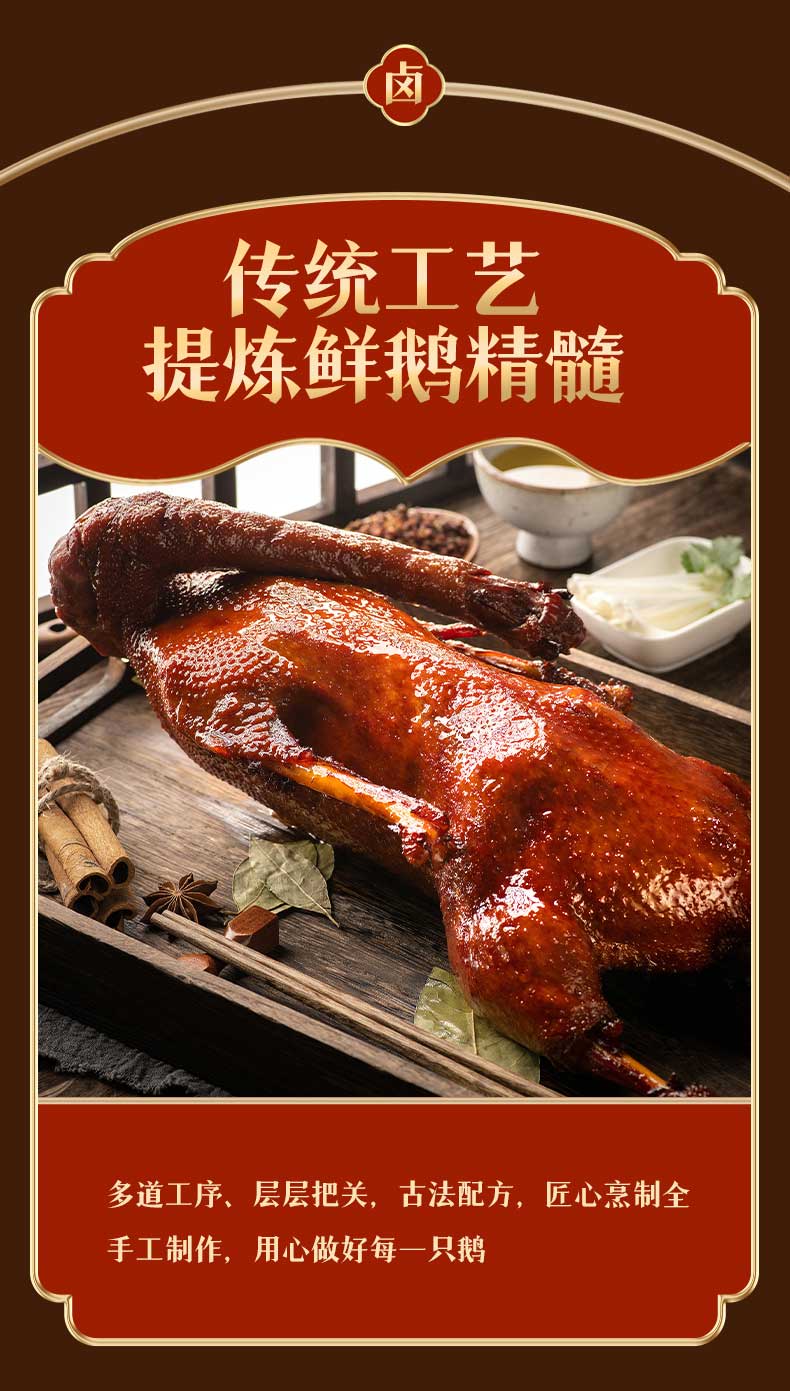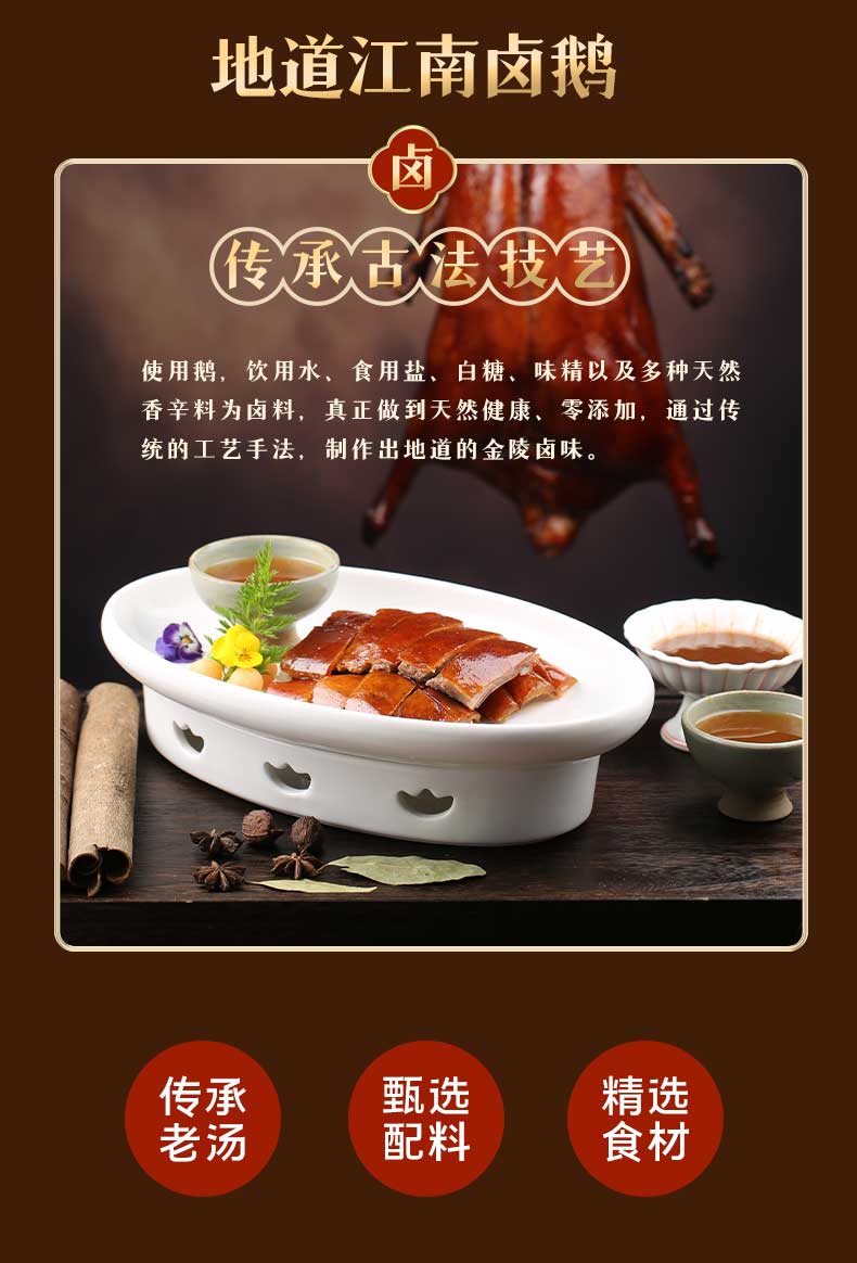 非南京本地的人可能不知道……这道金陵酱卤鹅,是江苏老字号,有着百年传承历史,甚至被当地人称之为“南京十绝之最”。每逢假期周末,总有人等着师傅切好鹅买回家,剁鹅师傅在鹅身刷上一层肥润的鹅油,手起刀落间,丰富滋润的肉汁从鹅肉中迸发出来。只可惜,出了南京就很难吃到了。为此,我们可没少费心思,从手艺,到保鲜,只为尽量还原这只卤鹅的神仙口感。前后谈了一年,终于有了这款地道金陵酱卤鹅。百年传承古卤法,鹅的鲜和卤的香,一起在你舌尖上澎湃。选取川椒、陈皮、八角、丁香、小茴香、大茴香、桂皮、豆蔻、甘草等,按独有的方子精确配比,再把所有香料研磨成粉末,这样熬煮的过程就更容易出味。把鹅放入熬制好的卤汤后,反复将鹅挂起离汤四次,每次约相隔30分钟,这样才能使卤汁完全封锁在鹅肉中。在百年传承的古法卤制之下,难以烹饪入味的鹅肉,被卤汁彻底征服。打开真空包装,稍微复热下,竟能吃到跟当地一样美味的肉质。撕下一块咬下,卤水醇厚的滋味早已渗入鹅身,柔韧的鹅皮,一层薄薄的鹅脂,还有紧实的鹅肉,口感丰富。食材是一道美食的根基。为确保培育出优质生态大白鹅,厂家在安徽定远与多家农户、养殖专业基地合作。为什么是定远?定远古有“境连八邑,衢通九省”之誉,尤其是距离南京非常近,这让鹅肉的供应十分方便。更重要的是,定远是农业大省。这里池河、窑河、高塘湖流经,水资源丰富,对食草动物白鹅的繁衍和发展,更是提供了得天独厚的自然条件。养殖过程中,也极其讲究。每只鹅都需要100-120天的放养时间,吃到100公斤以上的天然牧草。要在丘陵区域,进行300公里以上的小跑运动,还要在活水湖中达到1000小时以上的游泳运动。最终体重在4.5kg左右,体态适中,不过瘦或过胖的鹅,才会成为“天选之鹅”。因为只有用这样的生态白鹅,才能做到肉质饱满,紧致不柴,为后续制作成酱卤鹅,最大限度发挥出鹅肉的美味奠定基础。说完产地,我们再来细说它的烧鹅工艺,这也是它好吃的关键。金陵酱卤鹅,融合了咸、鲜、辣三味。最大的不同就是它的制作工艺,洗、腌、醒、烹、熬,每一道工艺都是环环相扣。制作的第一步,就是清洗。他们家的洗鹅可以说是精洗,脖子上的淋巴去的干干净净,鹅的后部也处理的清清爽爽。第二步是腌制。在腌制时,必须选用海盐,加上适当的香辛料,均匀地全部涂抹一遍。使用都是家常的调料,酱油、白糖、八角、桂皮之类,激发出它原始的肉质的本味,同时也大限度的除去异味。第三步,醒。让腌制好的鹅以自然状态停留两个小时,这样做可以让肉质更收缩。第四步,烹。烧煮的环节,更多的是对火候的把控,开始时必须猛火快攻,让这锅酱鹅和一锅水、汤料全部烧彻底沸腾。这里有一个关键,一口锅最多只能烧7只鹅,烧多了以后口味就不一样了。煮开之后把这火候稍微压下来一点,使它的汤汁能正好翻滚在鹅上面。在火候和时间的作用下,让它一点一点慢慢入味。经过80-100分钟的烧煮,鹅就彻底熟了,但还有一个最漫长也是最重要的工序——熬汁。近三四十斤的一锅汤汁,需要由烧制工人不断地从锅里舀起来,一遍又一遍地淋在鹅身上,至少需要淋上三百遍,酱鹅表面才会变得浓稠,给人们一种酱香浓郁的感觉。烧制完成的酱卤鹅色泽红润,酱香浓郁,表皮鲜辣香滑,肉质饱满多汁。它是佐饭下酒的好菜。一碗米饭配上酱汁浓郁的鹅肉,满口脂香,酥而不腻,一口米饭一口肉,吭哧吭哧就吃完了,香,实在是香!下面条的时候也可以来上一点,浓郁的姜香、鹅肉的鲜香,令简简单单的一碗面都瞬间增色不少。相比于鸡、鸭,鹅的体型要大不少,这只酱卤鹅的重量在2.4~2.6斤的样子,能吃好几顿。