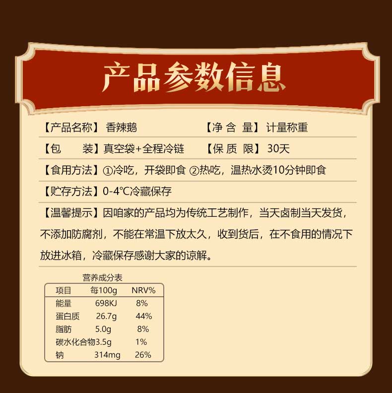 鹅肉紧实而不柴,鹅皮也不油腻。真的很好吃!日常不但作为快手菜,招待客人也很好哦。这么好吃的酱卤鹅,吃法也很简单。真空包装袋包装,拿到手后撕开包装,即可直接食用,很适合没时间做饭的上班一族。当然,也可以加热一下,味道会更好。无需解冻,微波炉中高火加热3~5分钟即可。或者直接连同内包装一起在沸水中加热15分钟,一道懒人快手版的家庭硬菜就完成了。会吃的人也可以讲究一点,将鹅肉切块,再调个酱料蘸着吃。这是灵魂吃法,不仅提鲜解腻,鹅肉也会更富有嚼劲,口感十分绝。