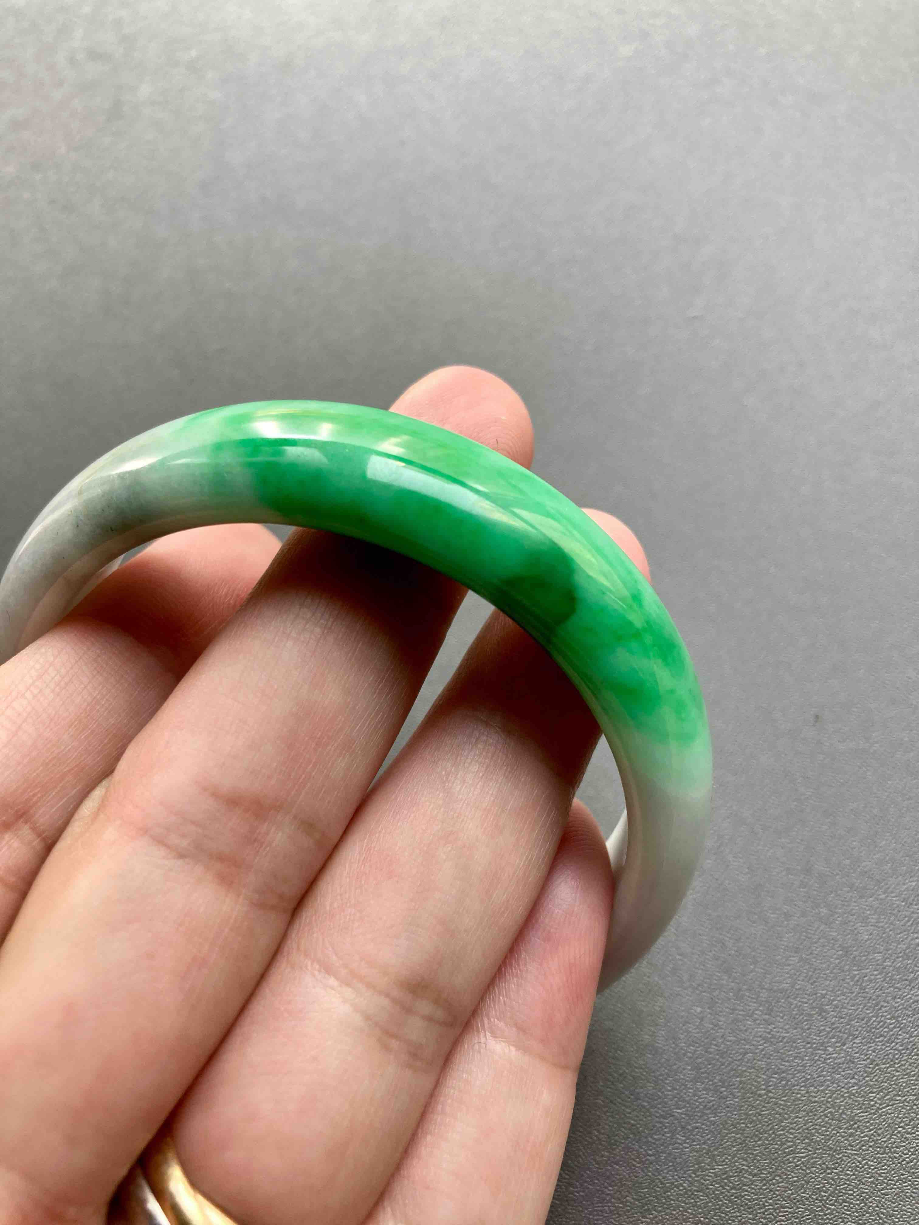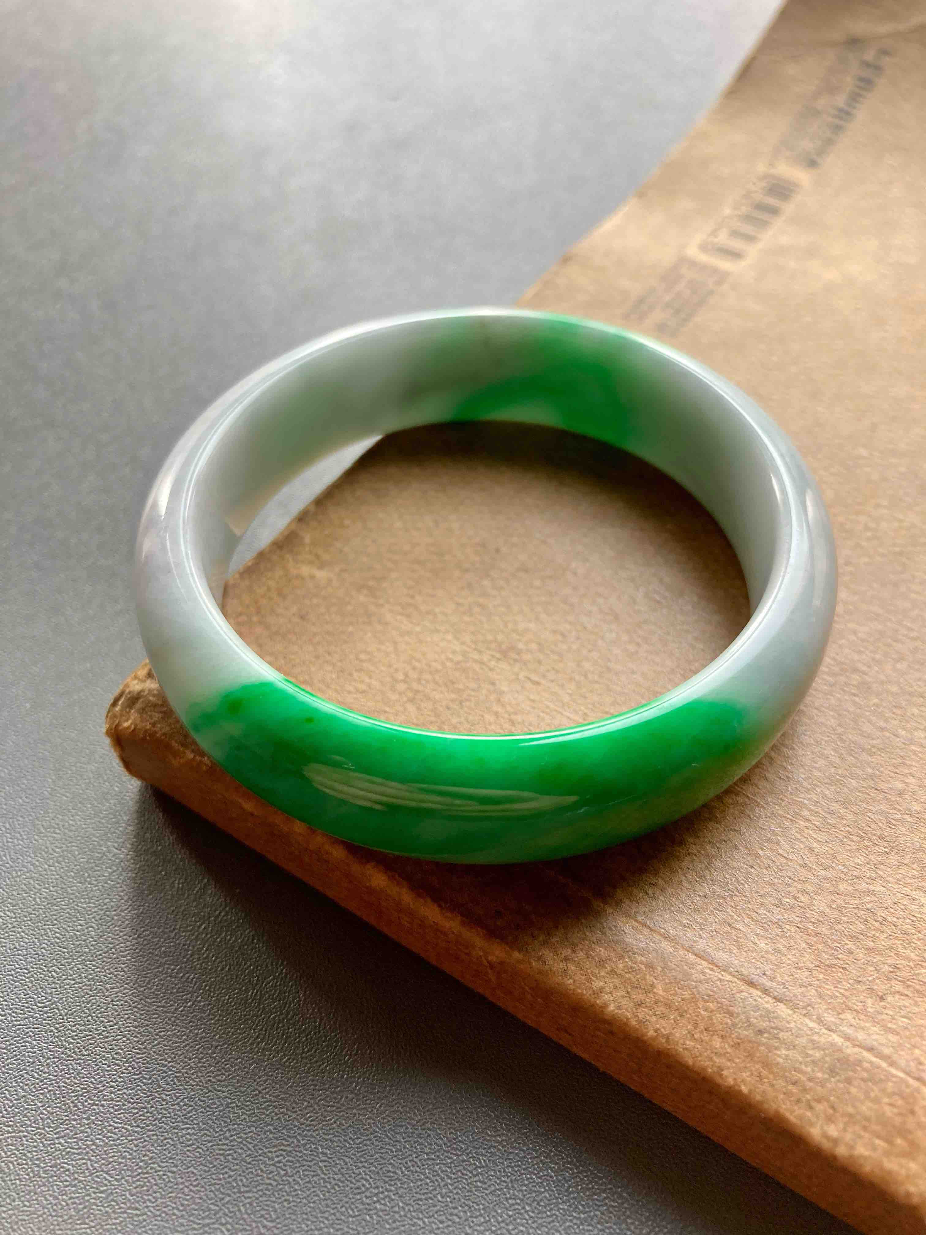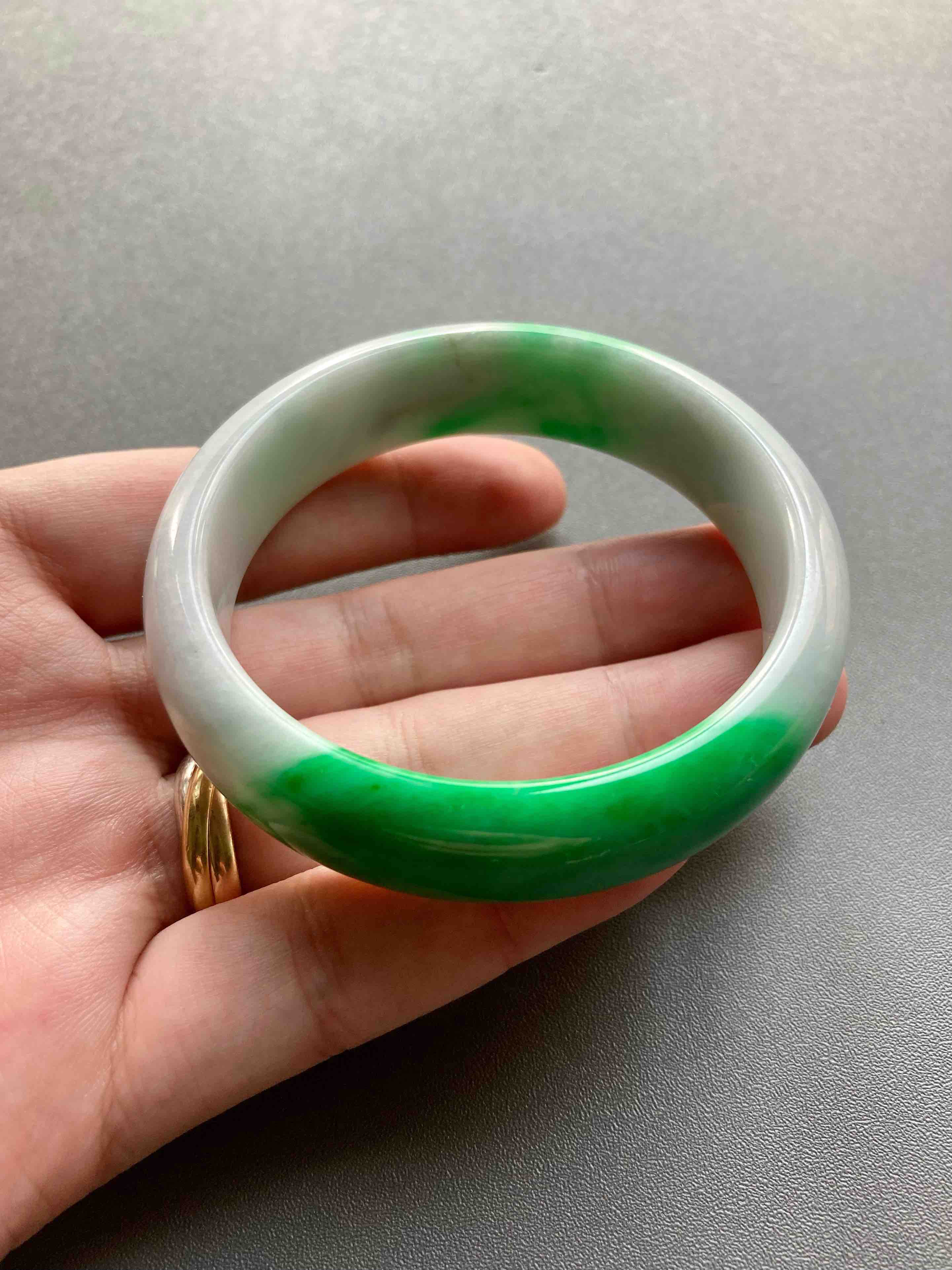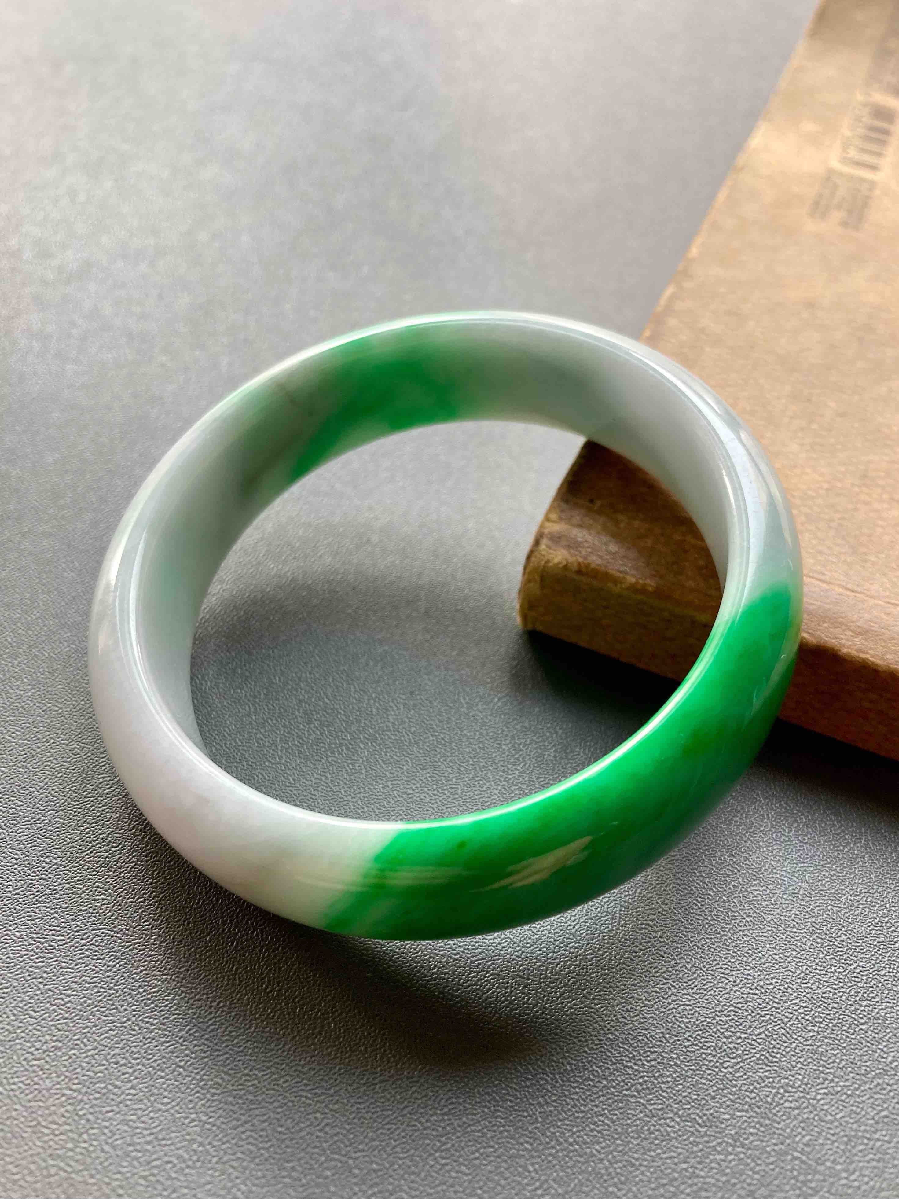 厉害的来了,见过这么绿的翡翠手镯吗?标杆级的,正阳绿辣色,底白肉细,没太多水头,但不重要,欣赏绿就可以了,浓郁,大面积,有些细小石纹,黄色棉一类的,在它无可比拟的阳绿和性价比面前都不是事了,我们卖过的大几十万的镯子绿色也不过如此,这个只要五位数,秒就对了,不会再有第二个机会可以这么便宜拥有这么绿的镯子了,内径56mm,适合手寸55到57佩戴