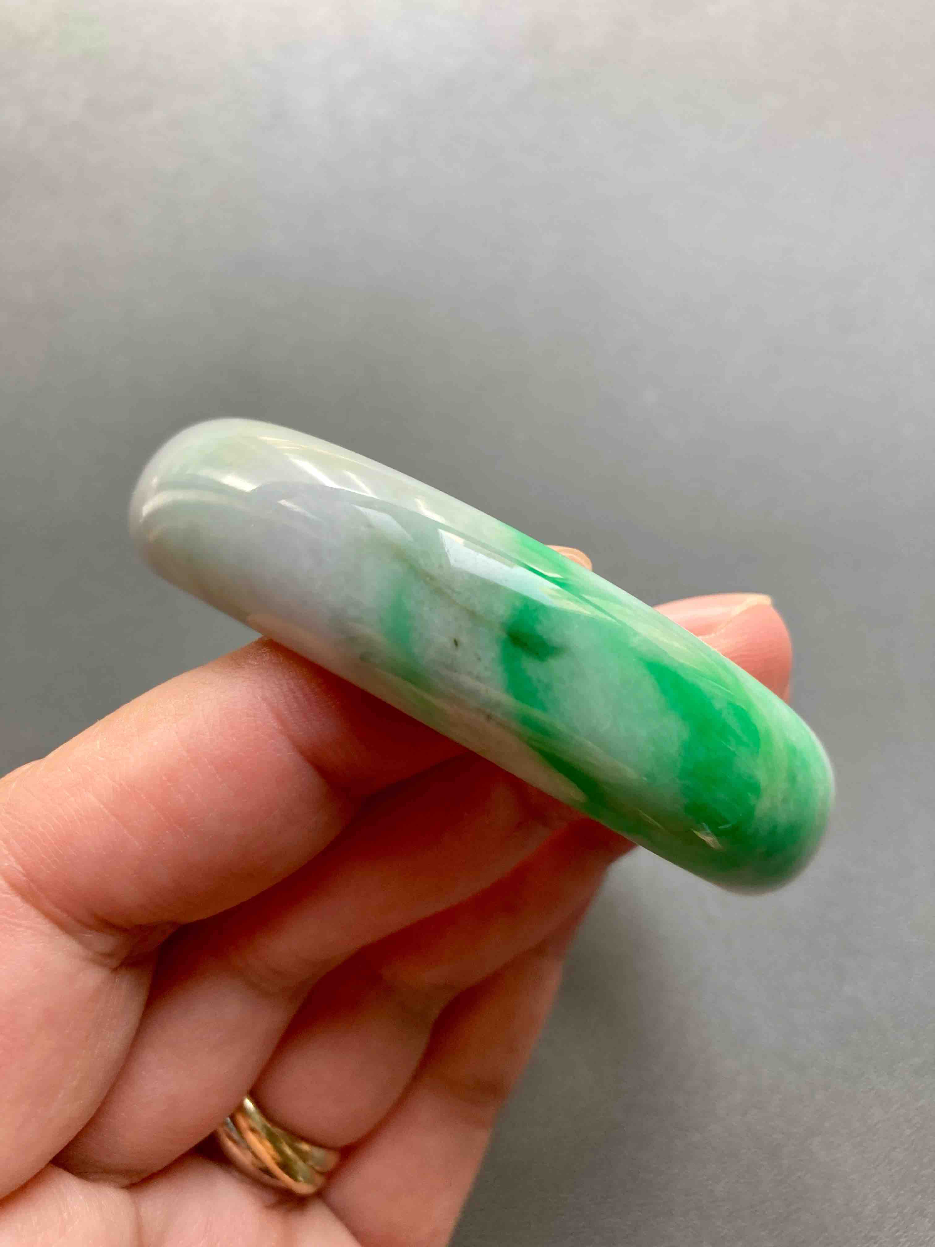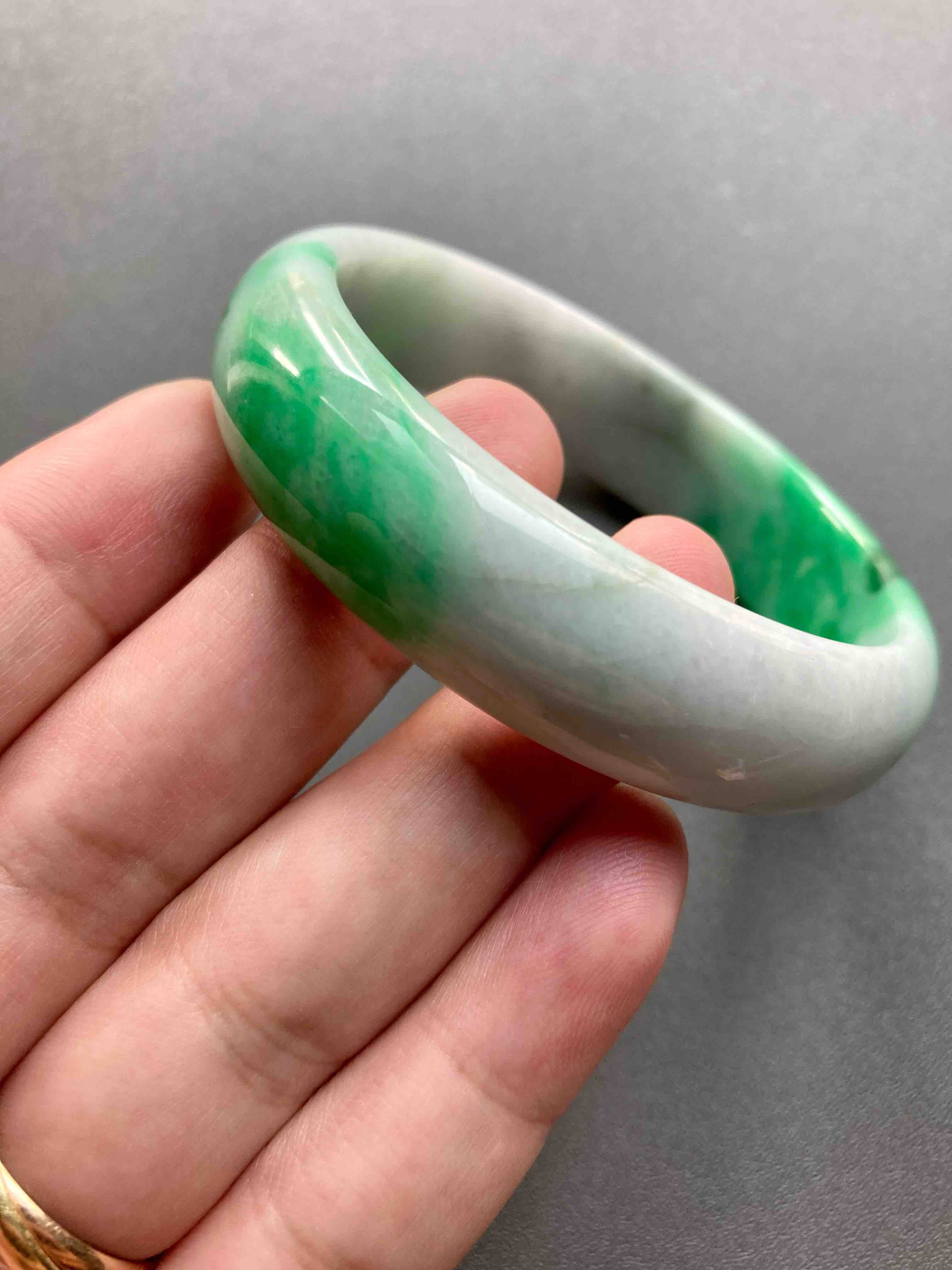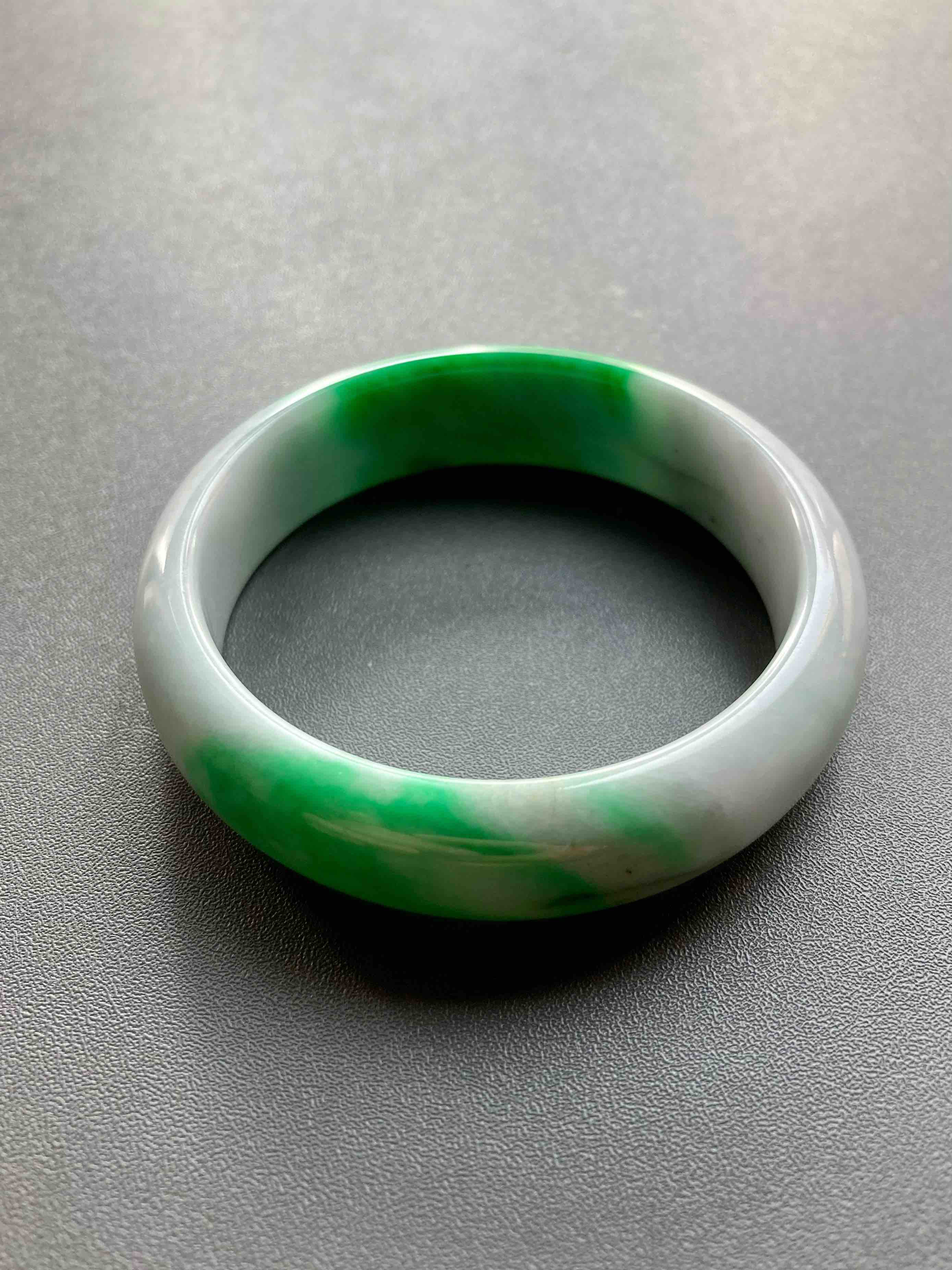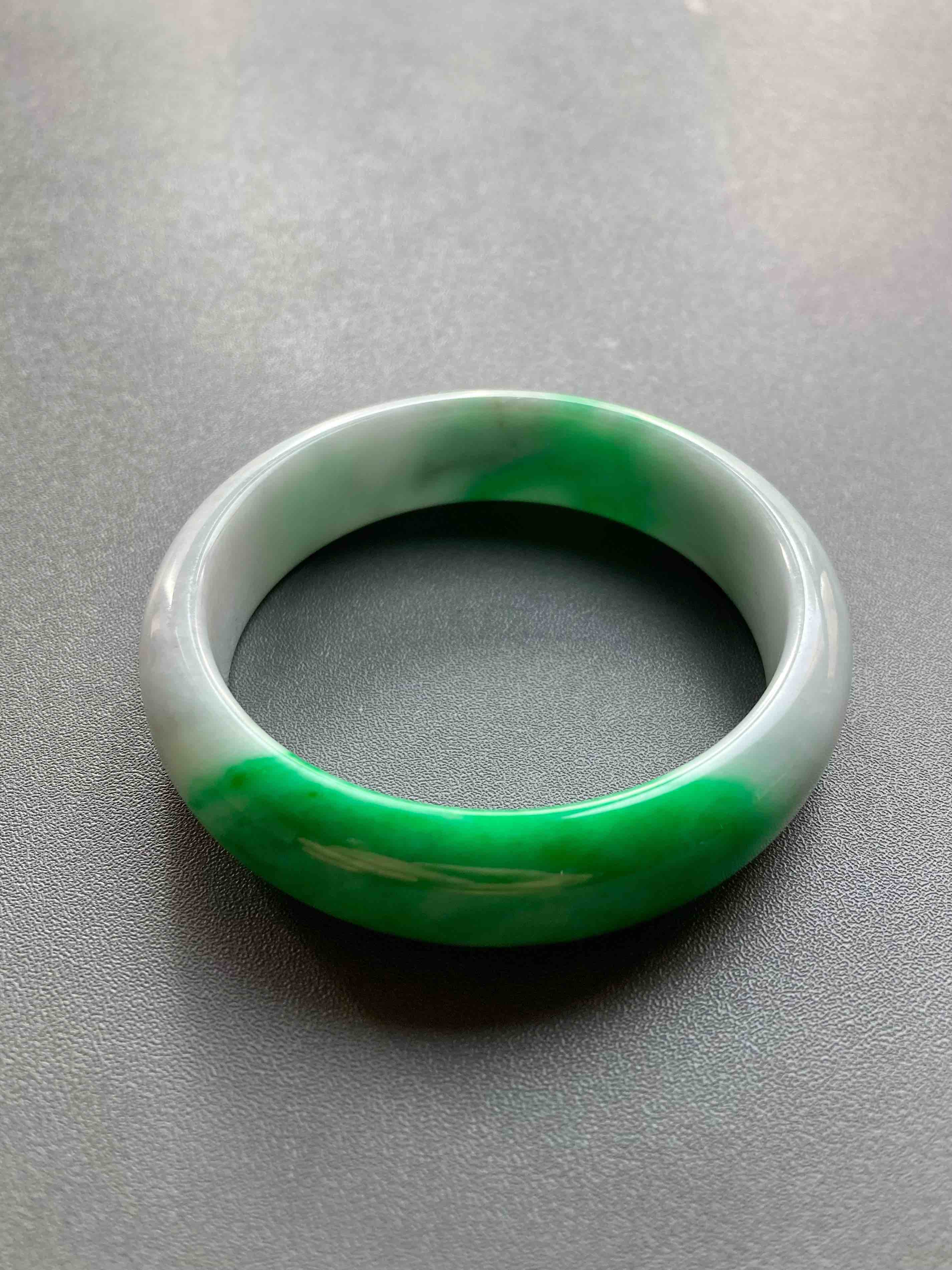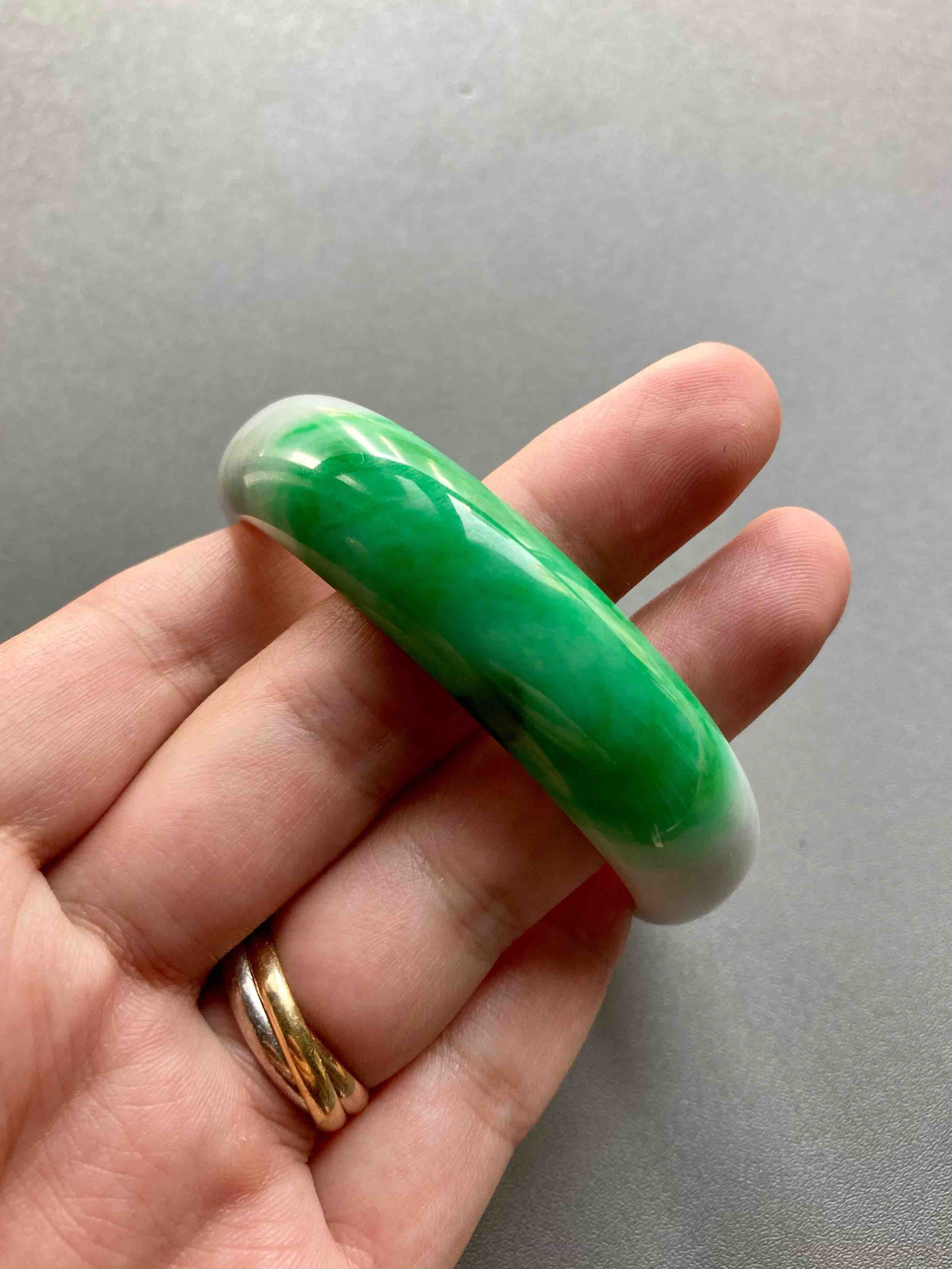 厉害的来了,见过这么绿的翡翠手镯吗?标杆级的,正阳绿辣色,底白肉细,没太多水头,但不重要,欣赏绿就可以了,浓郁,大面积,有些细小石纹,黄色棉一类的,在它无可比拟的阳绿和性价比面前都不是事了,我们卖过的大几十万的镯子绿色也不过如此,这个只要五位数,秒就对了,不会再有第二个机会可以这么便宜拥有这么绿的镯子了,内径56mm,适合手寸55到57佩戴
