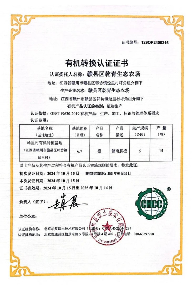 通过对声胜家脐橙种植基地的考察和走访,并现场采摘果子送检检测农残,还对接了有机认证的老师到现场检查,现已获得有机转换认证证书,295项农残无检出。