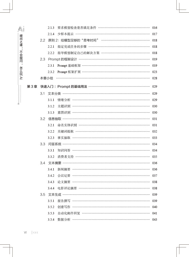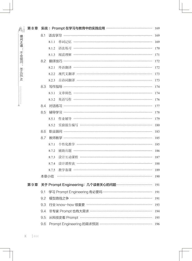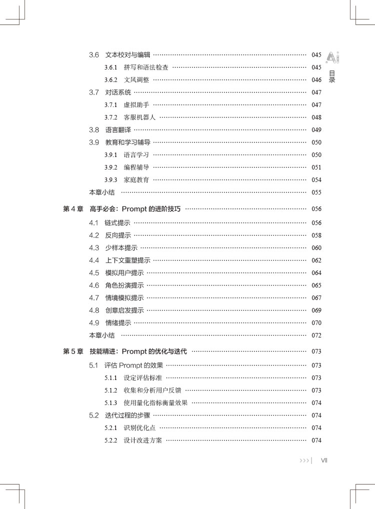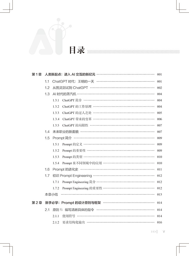 | 本书是一部全面介绍 Prompt Engineering(提示工程)的指南,旨在帮助读者零基础逐步掌握这一重要技能。本书首先介绍了AI和Prompt(提示词)的基本概念,解释了 Prompt 的重要性,通过详细的示例展示了如何设计和使用 Prompt,引导AI模型生成高质量的内容。通过这些基础知识,读者可以快速上手并将 AI 模型应用于各种实际任务中。然后,本书深入探讨了多种 Prompt 的进阶技巧,包括链式提示、反向提示、情绪提示等。每种技巧都配有具体的应用场景和操作示例,可以帮助读者更好地理解和实践这些技巧。这些技巧不仅可以提高 AI 模型的表现,还能显著地增强用户的互动体验和内容创作能力。最后,本书展示了Prompt在工作、生活和学习教育中的实践应用。通过真实的案例和实践经验,读者将学习如何利用Prompt优化工作流程、提升生活品质,在AI时代获得更多的创意和灵感。本书还特别强调了AI作为工具和伙伴的双重角色,激励读者不断探索和创新,成为更好的自己。本书内容系统、全面,实用性强,既适合AI零基础的读者学习,又适合有一定基础、想高效利用AI应用技能的读者学习,还可作为广大职业院校相关专业参考教材和AI提示工程培训用书。 |