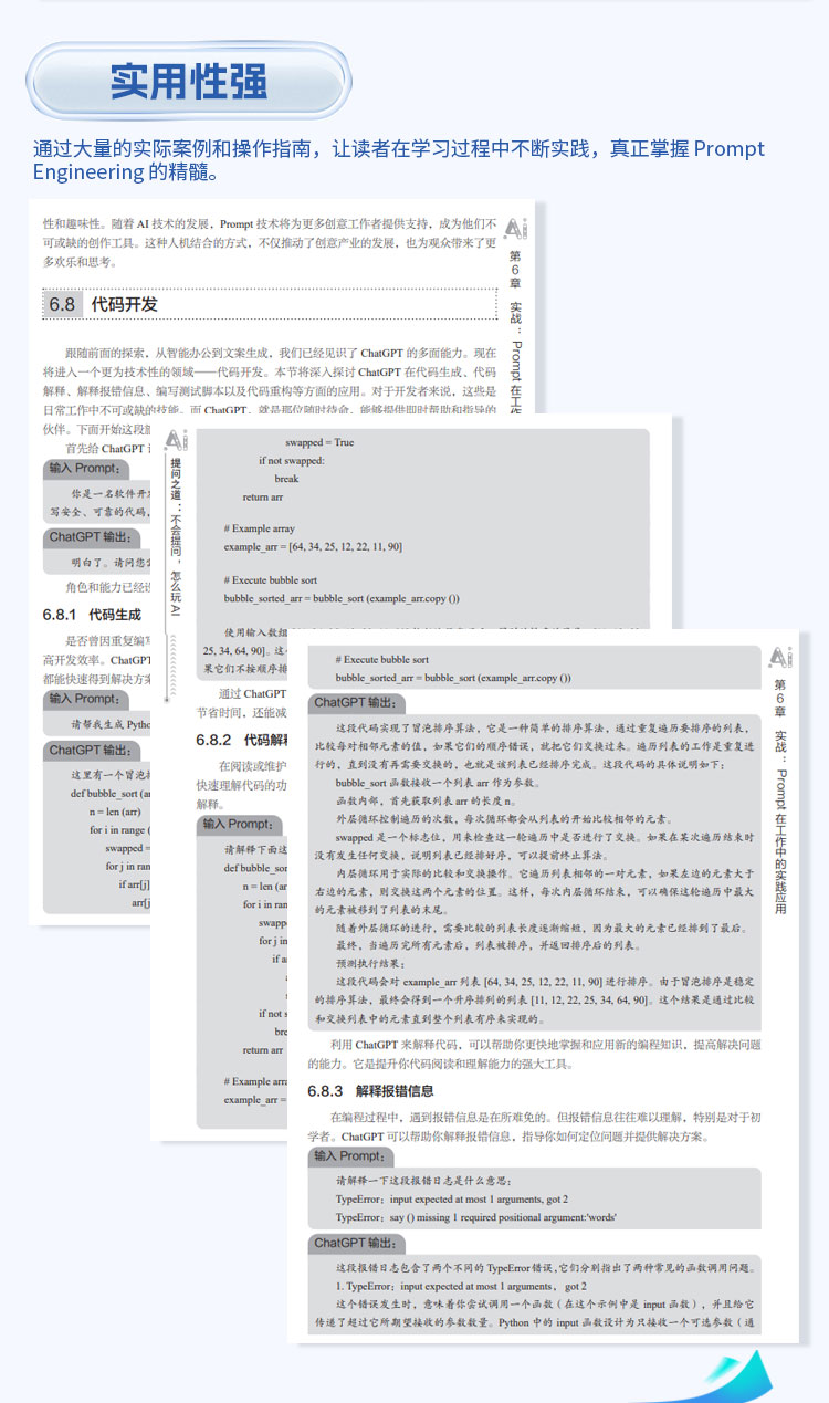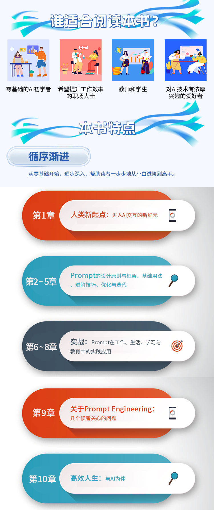 | 在 AI 迅猛发展的今天,AI 不再是实验室中的高科技,而是逐渐融入并成为我们日常生活的一部分。无论是智能手机上的语音助手,还是推荐系统中的个性化推送,AI 技术正在悄无声息地改变着我们的世界。然而,许多人仍对 AI 感到陌生甚至畏惧,认为它高深莫测、难以掌握。实际上,如果掌握一种称为 Prompt Engineering 的技能,每个人都可以轻松驾驭 AI,利用它来提升工作效率和生活质量。本书的目的是帮助读者打破对 AI 的神秘感,学会 AI 的提问之道,让普通读者也能轻松入门,掌握 AI 时代的新技能。本书是一部为普通读者量身打造的AI提问与应用的学习指南,旨在帮助读者从零基础开始,逐步掌握 Prompt Engineering 这一 AI 时代的新技能。无论读者是否有 AI 应用基础,本书都将带其轻松入门,并逐步提升至高手水平。本书具有以下几个特点:1、通俗易懂:本书采用轻松幽默的语言,避免使用复杂的专业术语,力求让每位读者都能读懂并掌握。2、循序渐进:从零基础开始,逐步深入,帮助读者一步步地从小白进阶到高手。3、实用性强:通过大量的实际案例和操作指南,让读者在学习过程中不断实践,真正掌握Prompt Engineering 的精髓。4、覆盖全面:从 AI 的基本概念,到 Prompt 的设计与应用,再到实际案例的分析,全面覆盖了 Prompt Engineering 的每个方面。 |