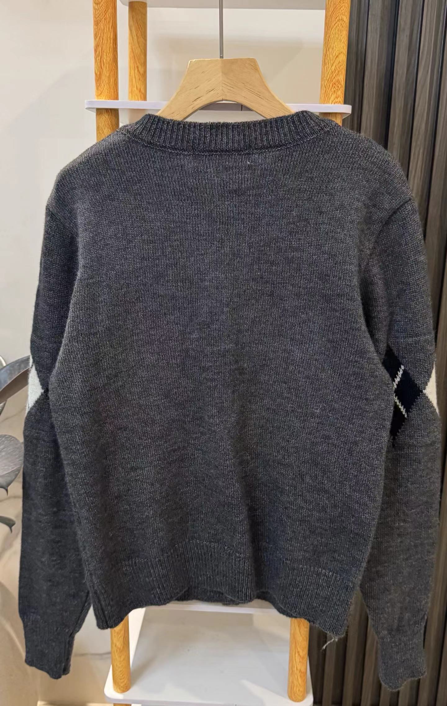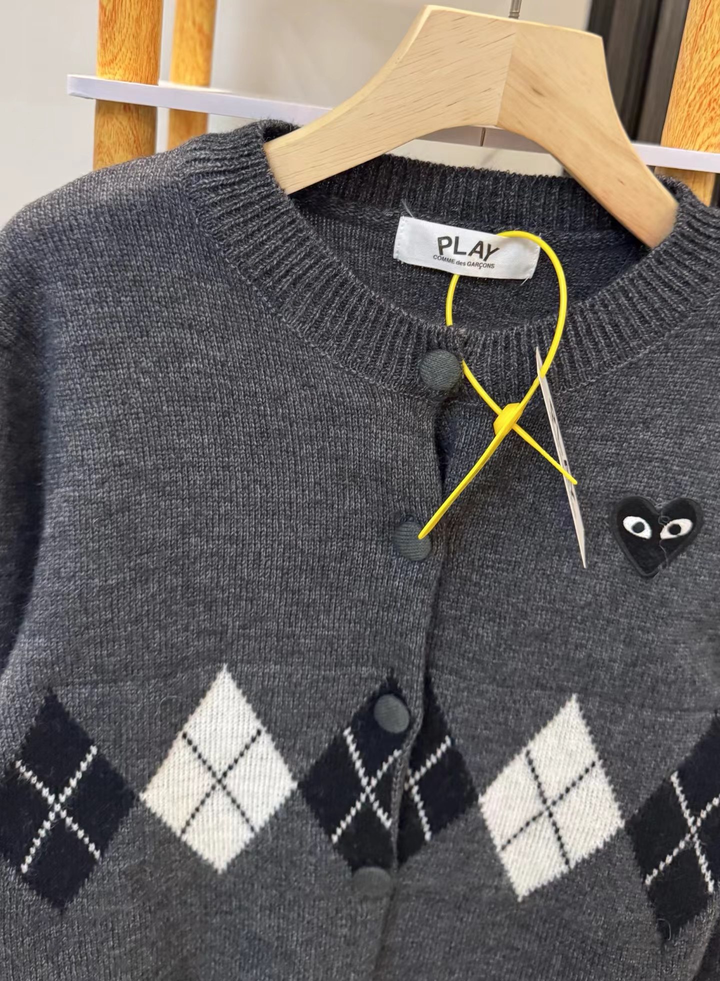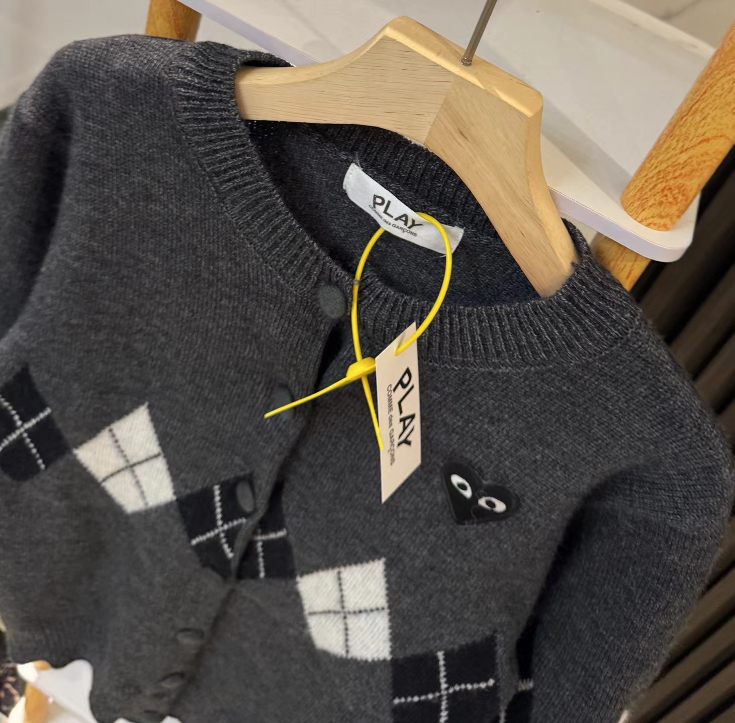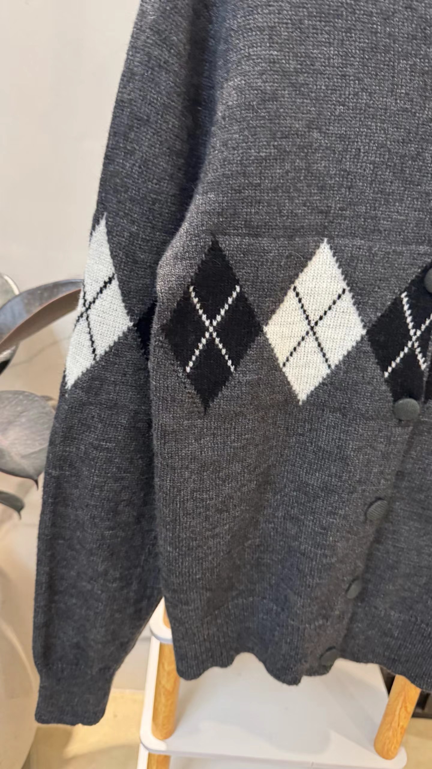 格纹针织开衫,搭配同色系百褶裙,整体风格复古减龄,兼具松弛感与jing致感。短款合身版型,能优化身材比例,视觉上显高显瘦。圆领+单排扣设计简约百搭,可内搭衬衫或T恤,适配多种穿搭场景。衣身采用精典的灰白菱格纹拼接,复古学院风浓厚;胸口点缀品牌标志性的爱心小Logo,低调中带有辨识度针织面料柔软亲肤,保暖性较好,适合春秋季单穿或作为冬季内搭。袖口的撞色条纹设计增加了细节层次,提升整体jing致度。内搭的白色翻领衬衫与开衫的格纹元素相呼应,下身的同色系百褶裙延续了学院风调性,整套搭配色彩统一、风格和谐,既适合日常通勤,也能打造出甜美的校园感。