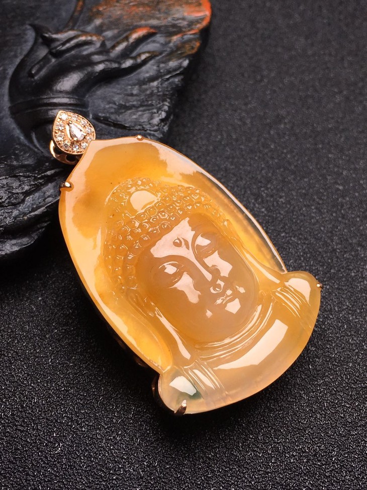【W0261】翡翠冰黄翡佛祖头,色泽鲜艳,质地细腻,水润完美,裸石尺寸:41.4*28.2*4mm,结缘价25000