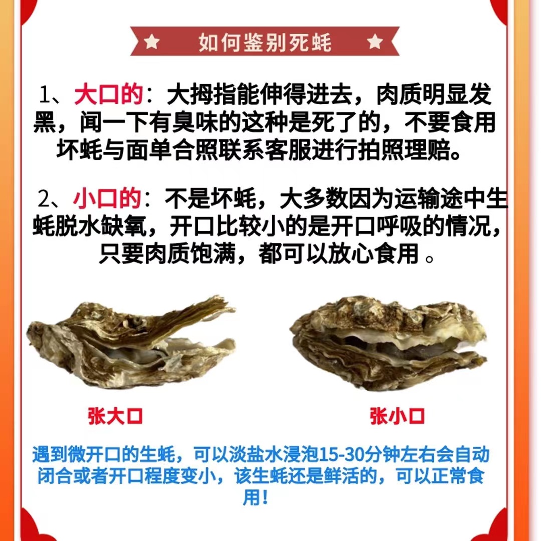 基地直发,坏蚝包赔,如生蚝泥壳、空壳、开大口、变质等无法食用情况,请带订单信息+售后图片,于签收后24h内拍照验证,将坏蚝与快递面单一起拍照,联系客服售后,我们将第一时间核实并处理理赔。