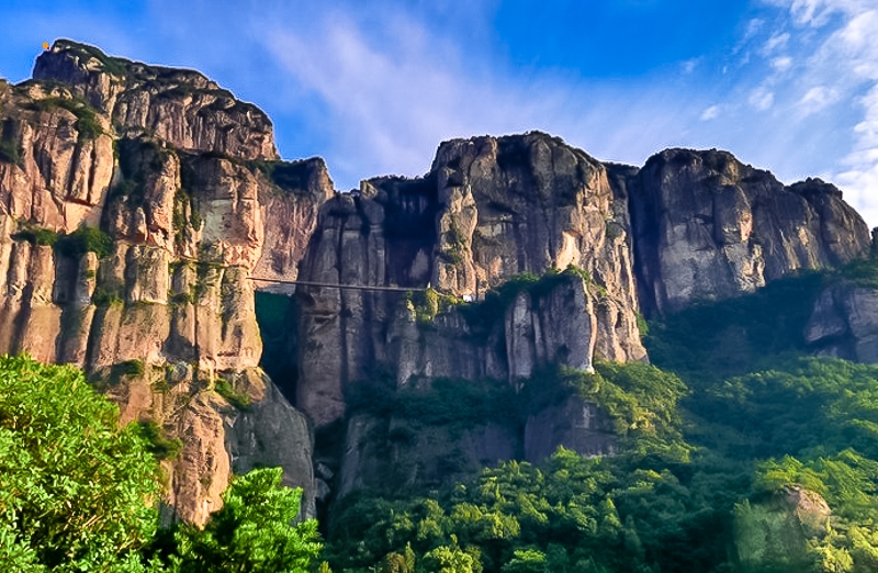 - 之后游览【灵岩景区】,“雁荡冠天下,灵岩尤绝奇”,在此可以观赏精彩的【飞渡表演】。表演舞台不在平地,而在海拔200米的空中,世界罕见。很难想象,在天柱峰和展旗峰的峰顶拉上一条钢索,艺人们会给我们展现一场怎样的表演?看完演出,步行进入灵岩深处的卧龙谷,探小龙湫瀑布。寻找金庸名作《神雕侠侣》小龙女纵身一跃的断肠崖,体验百米玻璃栈道。