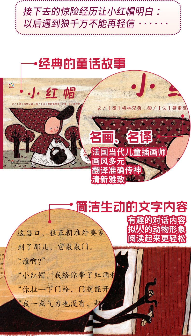 一样的经典,不一样的绘图。法国当代最顶尖的儿童插画师,近千幅精美手绘插图,唯美浪漫、童趣盎然、清新自然、古朴细腻……画风多元,无限想象越纸而出;关注细节,连发丝都清晰可见;色彩鲜明,对应不同情境心理。提高审美、艺术熏陶,这里的图片自己会说话哦!