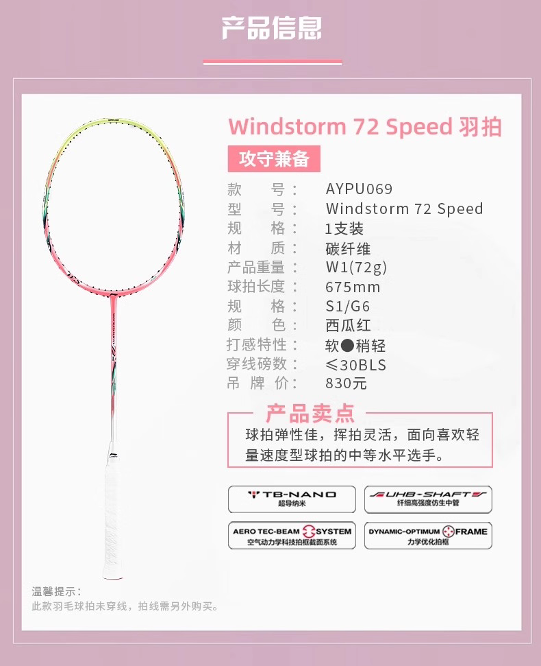 李宁 羽球拍 WindStorm 超轻72Speed W72 AYPU069