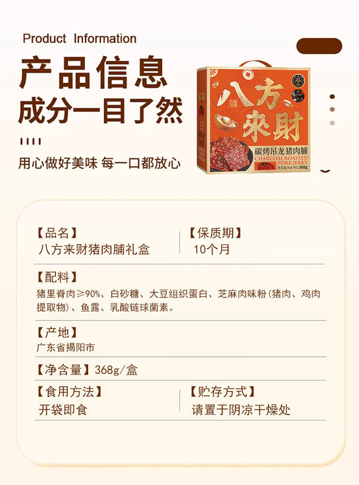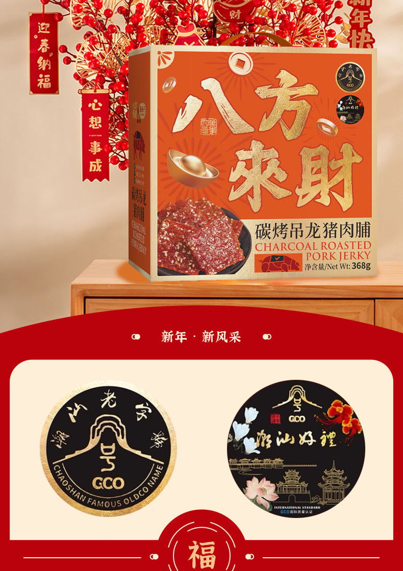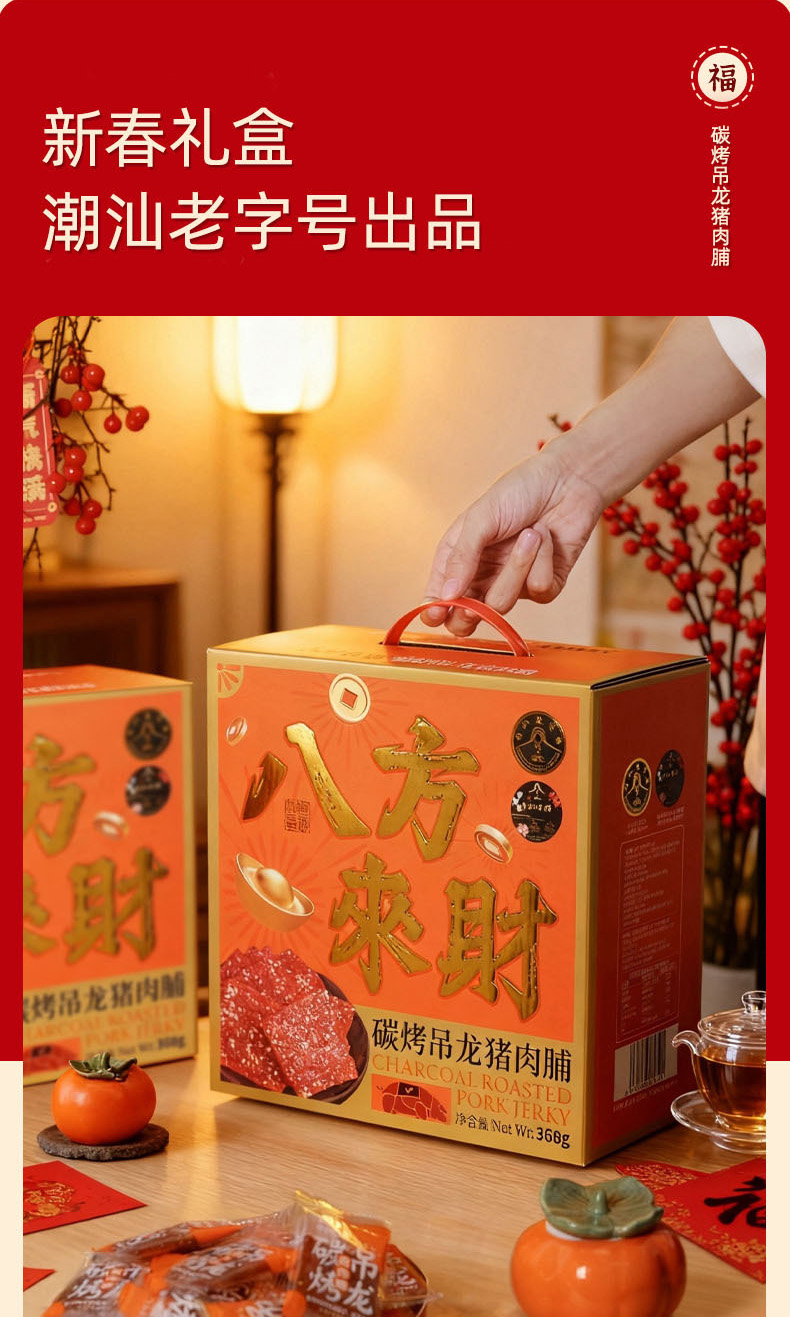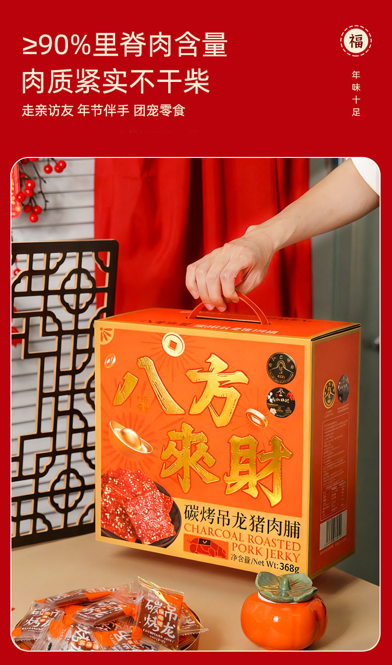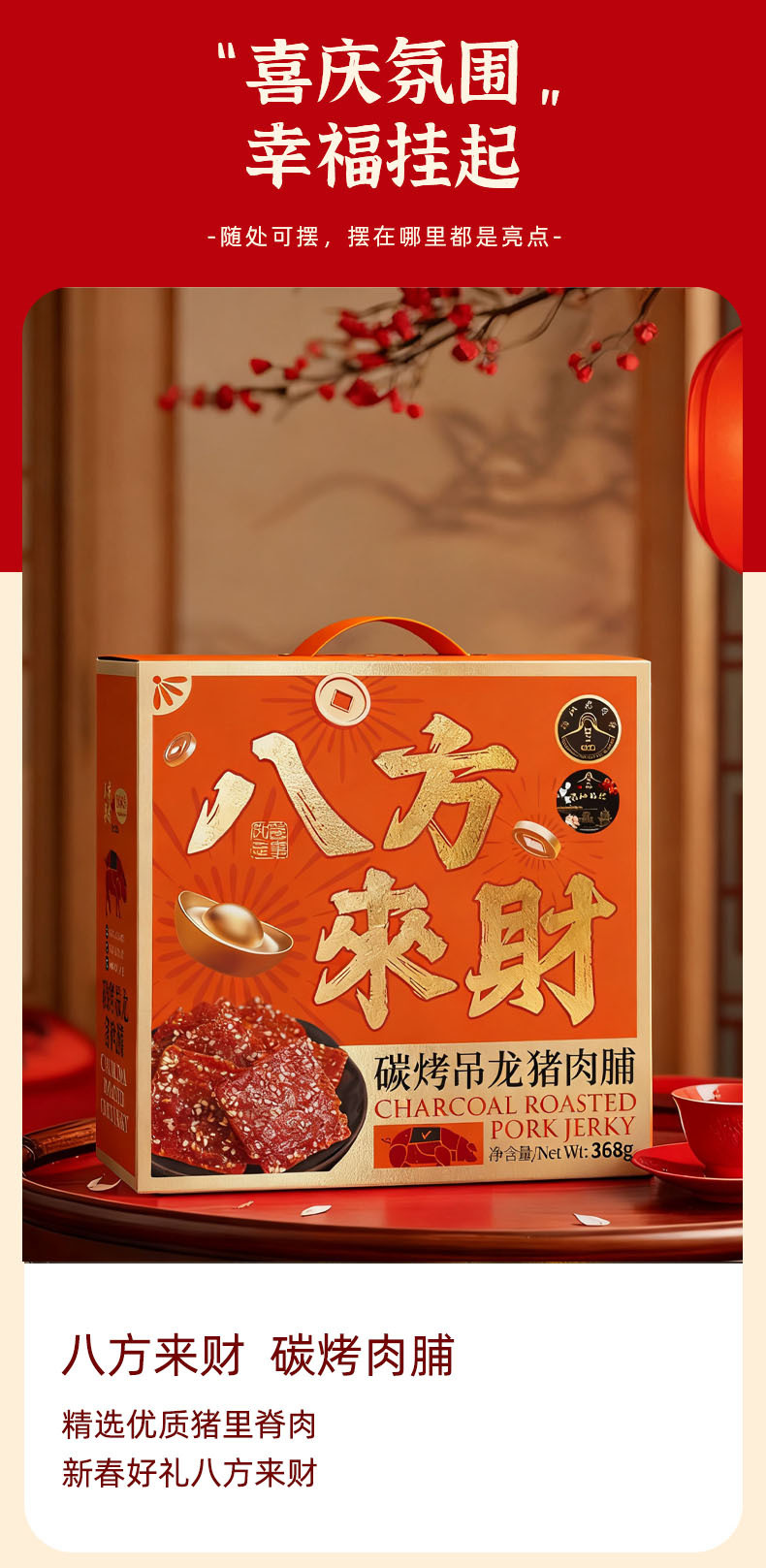 (春节预售:2.2号-2.26号停发)疯抢中!!【送新年手提礼盒】【八方来财·炭烤吊龙猪肉脯礼盒】好吃不腻 口感软糯焦香 不硬不柴 古法炭烤 配料干净 368g/箱