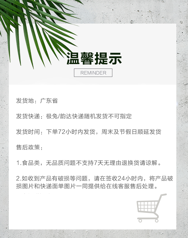 | 售后标准 | 1.食品类,无品质问题不支持7天无理由退换货请谅解。 2.如收到产品有破损等问题,请在签收24小时内,将产品破损图片和快递面单图片一同提供给在线客服售后处理。 |