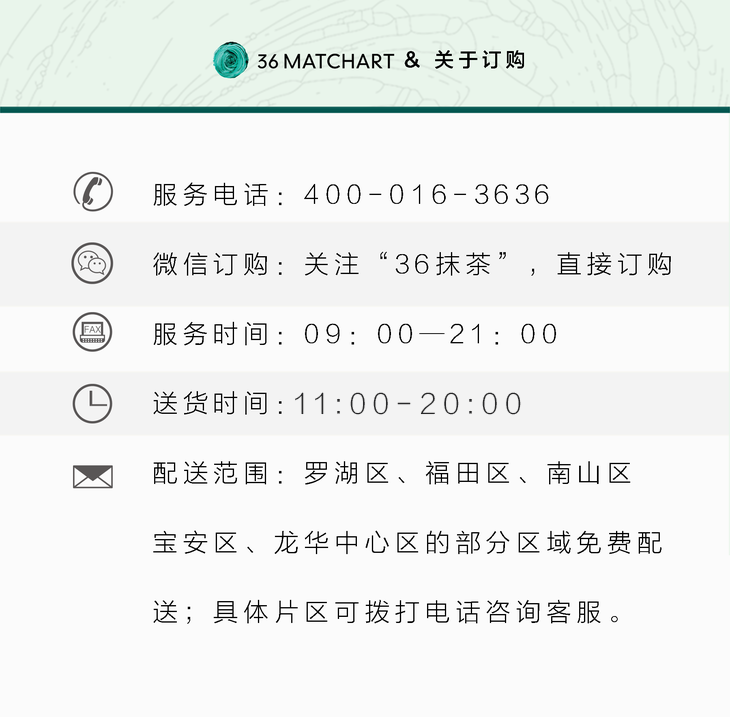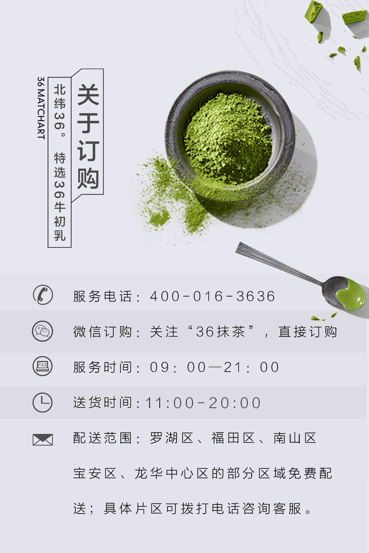 我们目前拥有36MATCHART和36cake两个品牌,主营抹茶甜品与新鲜蛋糕,深受数百万抹茶控和甜品控的拥趸。好吃安心,奶油只选法国铁塔。全城3小时免 费速达。客服热线400-016-3636