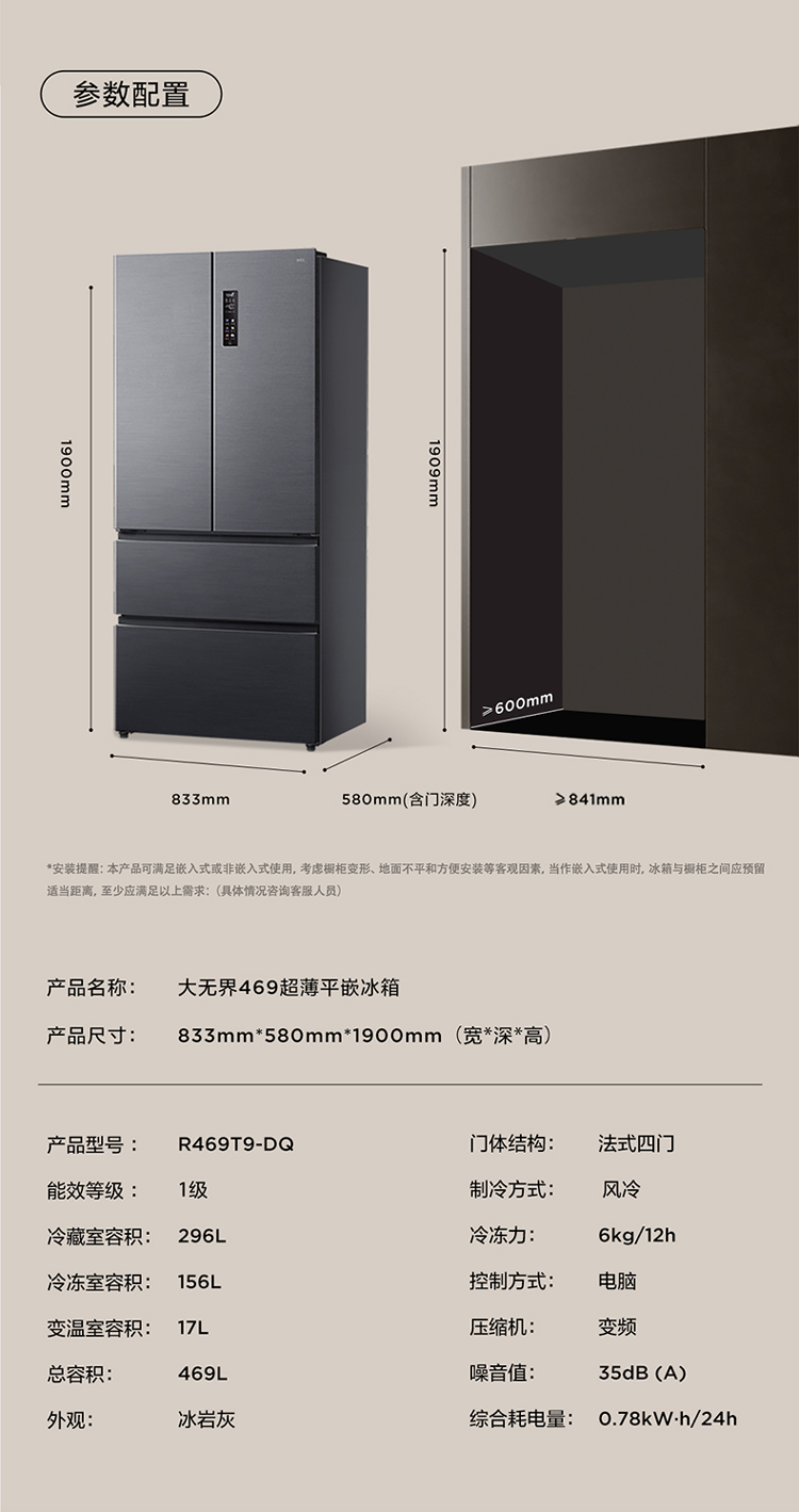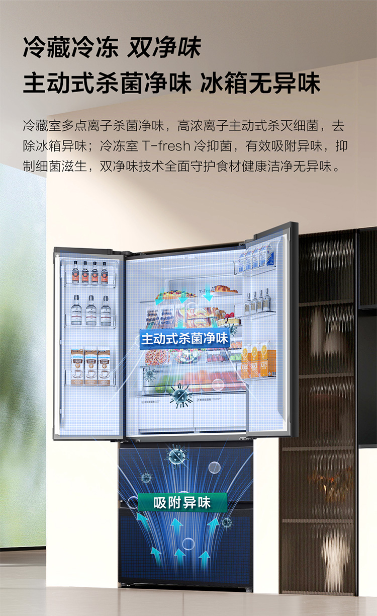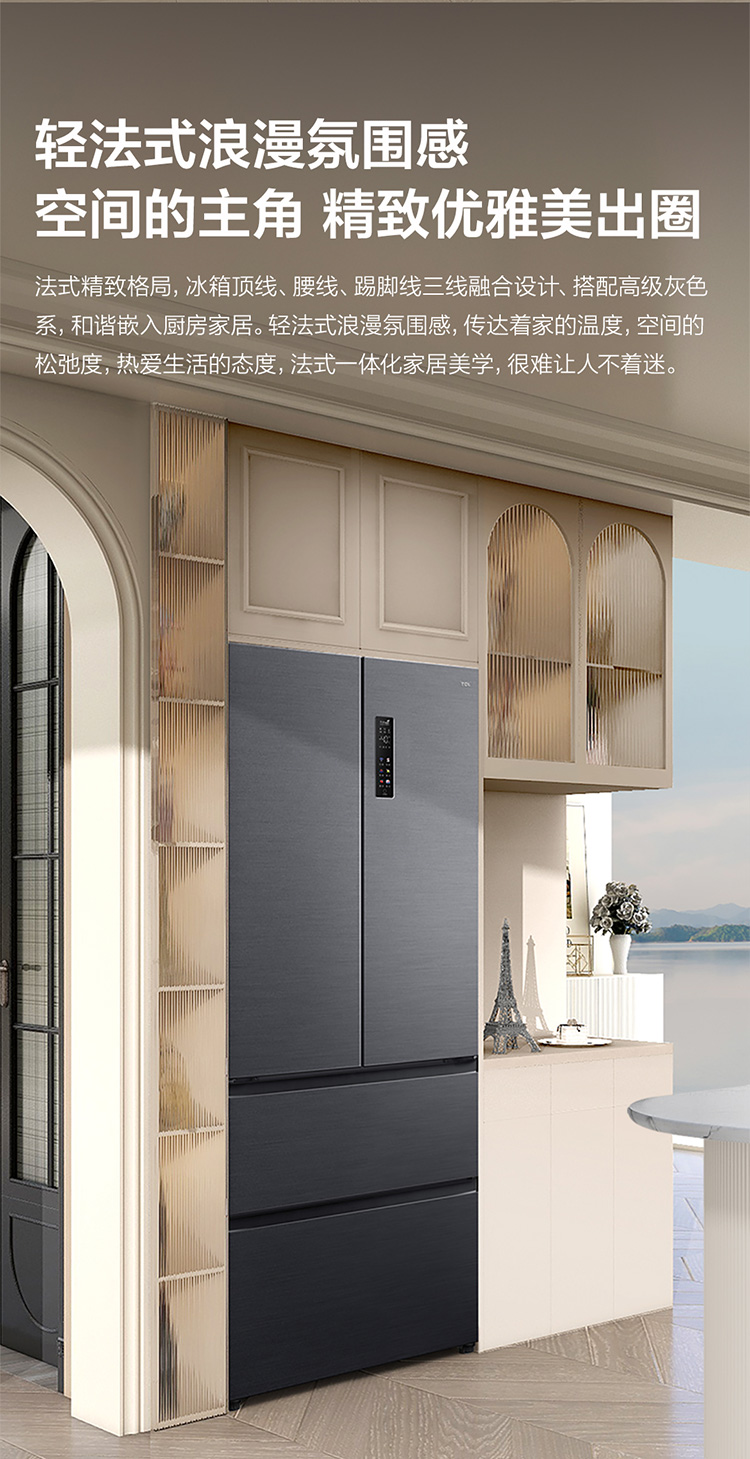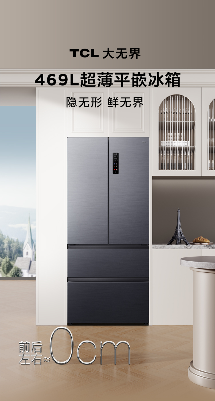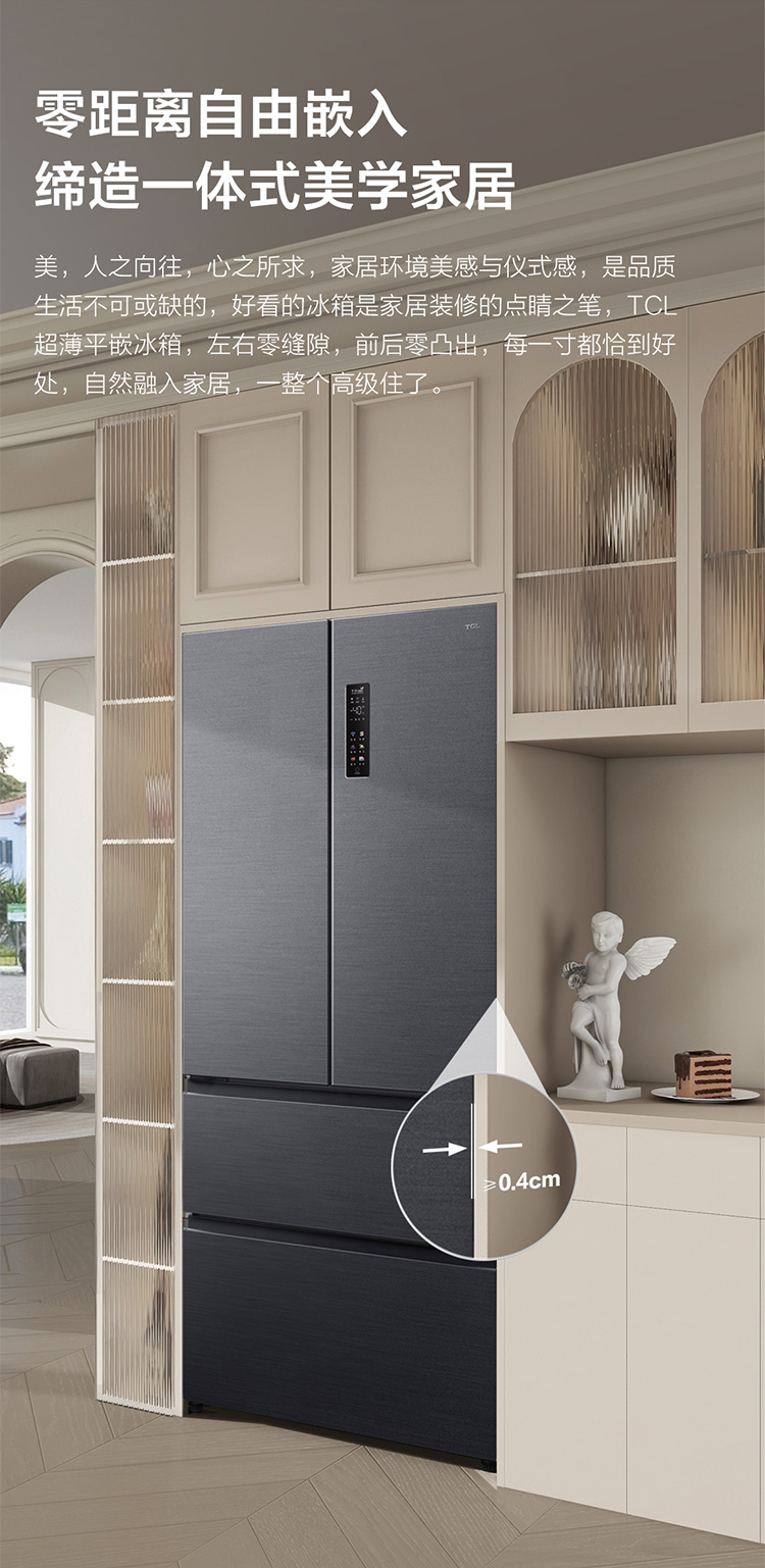 TCL大无界469升T9法式多门四开门58cm超薄零嵌入式底部散热双净味冰箱 R469T9-DQ