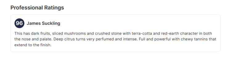 “黄色水果、切片蘑菇和燧石气息,伴随陶土和红土特征。浓郁的柑橘芳香强烈,饱满强劲,余味丝滑。”