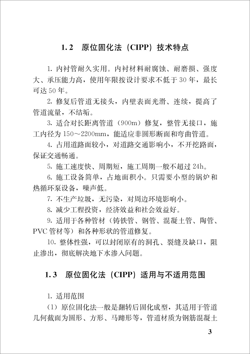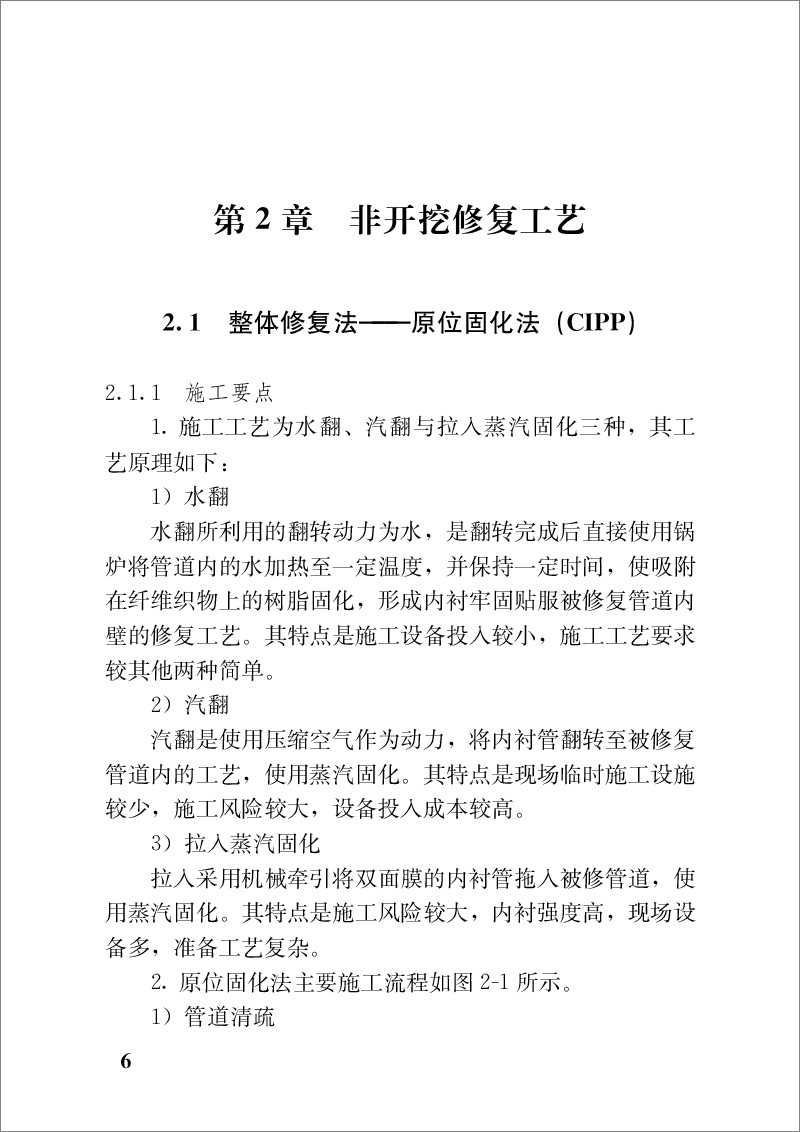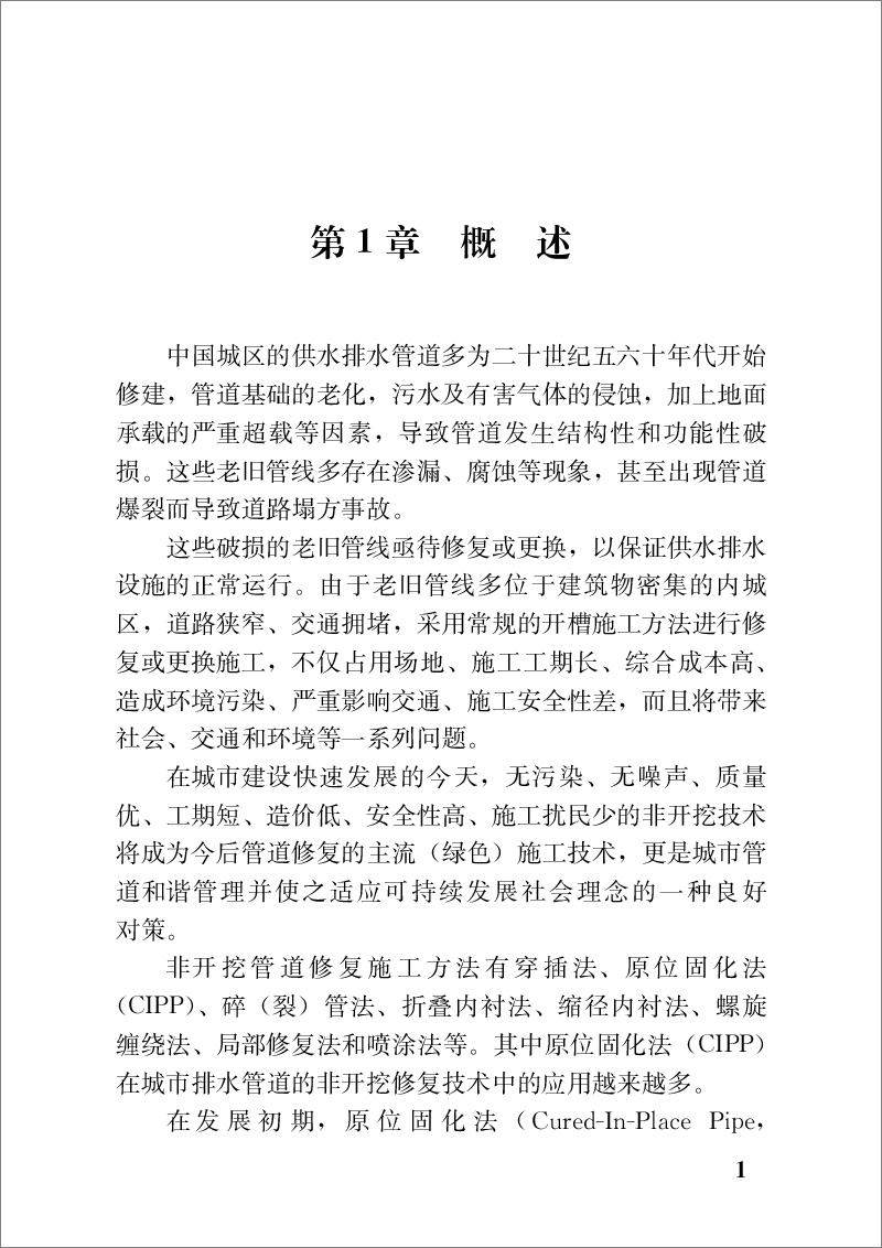 目 录 第1章 概述1 1.1 原位固化法(CIPP)原理2 1.2 原位固化法(CIPP)技术特点3 1.3 原位固化法(CIPP)适用与不适用范围3 1.4 原位固化法(CIPP)与传统开挖换管法比较工法比较4 第2章 非开挖修复工艺6 2.1 整体修复法——原位固化法(CIPP)6 2.2 局部修复法——不锈钢发泡筒法22 2.3 局部修复法——点状原位固化法24 第3章 CIPP工法施工中常见的质量问题及措施27 3.1 针孔与缺口27 3.2 起皱27 3.3 起泡28 3.4 软弱带29 3.5 隆起29 3.6 白斑30 3.7 内衬管开裂30 3.8 内衬管与旧管分离30 第4章 质量检查与验收32 4.1 工程实体验收和竣工档案的验收32 4.2 工程施工质量验收33 4.3 验收文件和记录34 4.4 竣工验收35 第5章 季节性施工36 5.1 雨期施工36 5.2 冬期施工37 5.3 高温期施工38 第6章 安全控制40 6.1 施工准备阶段安全技术措施40 6.2 施工阶段安全技术措施42 第7章 环境保护44 7.1 施工现场空气污染的防治措施44 7.2 施工过程水污染的防治措施45 7.3 施工现场噪声的控制措施46 7.4 固体废物的处理47 第8章 材料49 8.1 材料49 8.2 材料贮运54 参考文献56