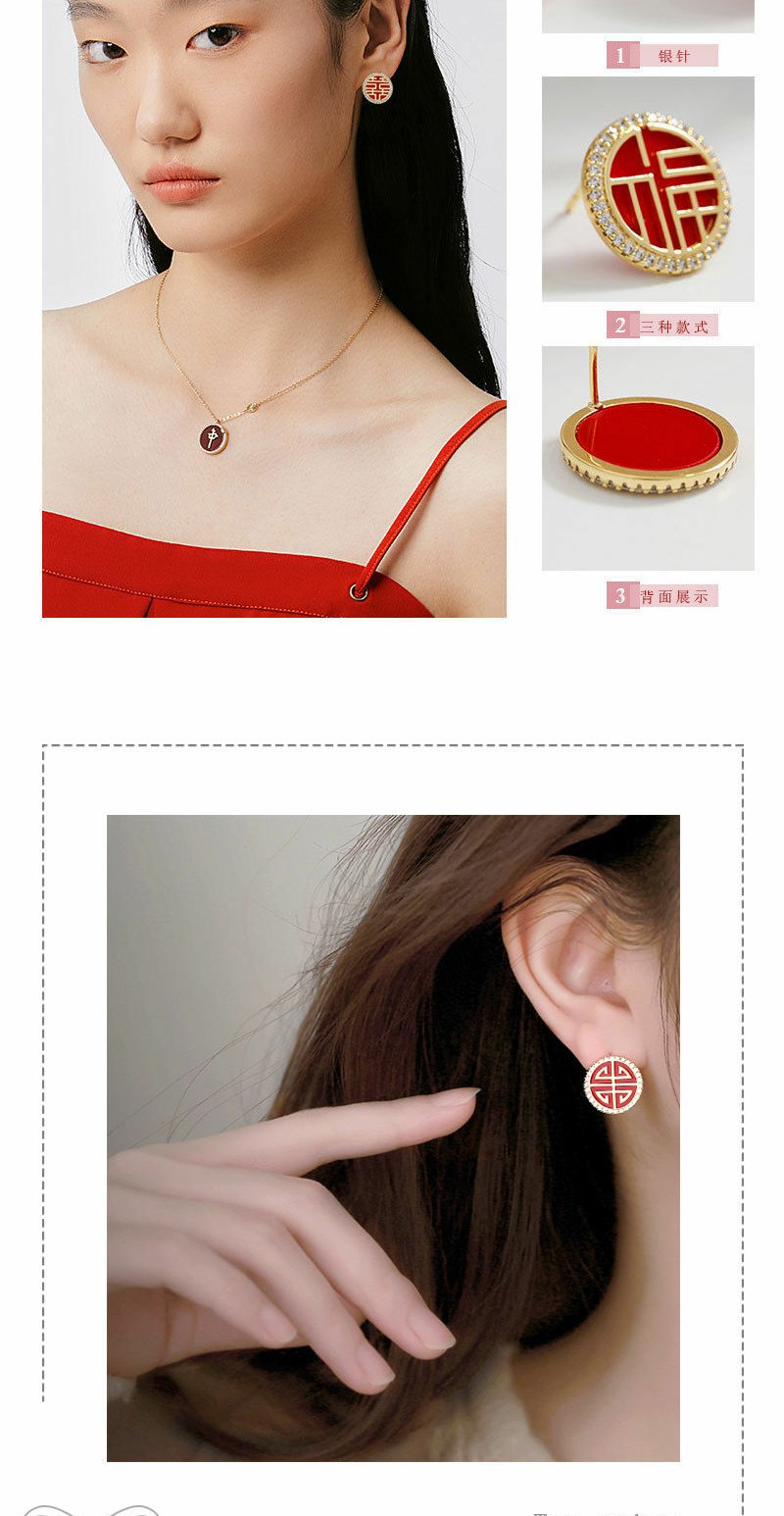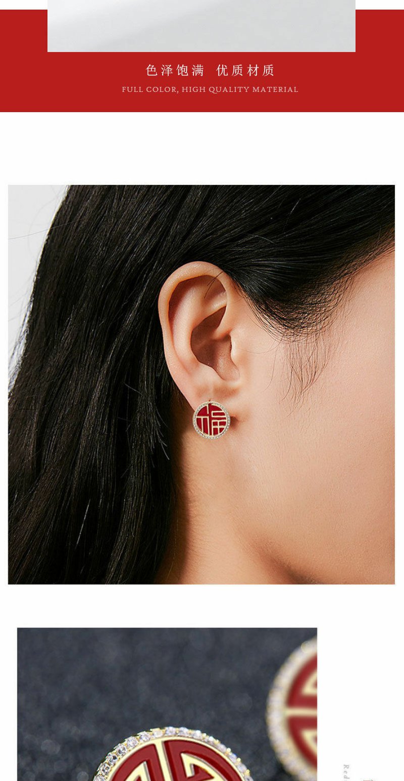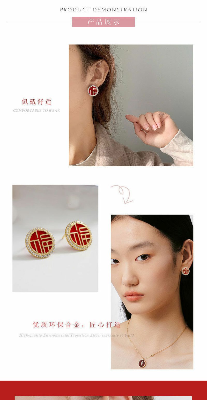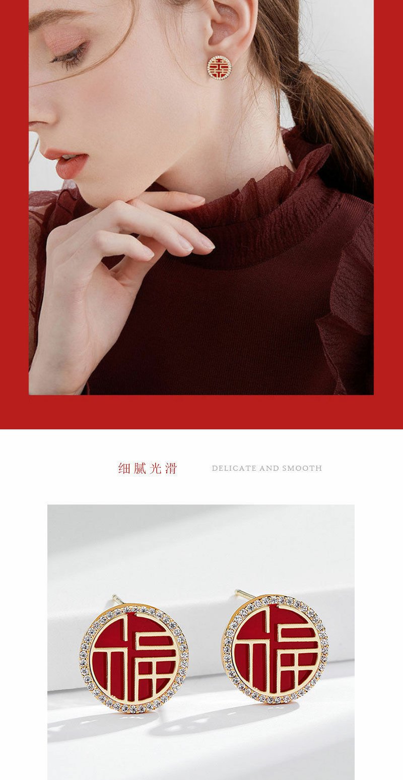 中国风新款S925银针红色喜福禄字耳钉短款国潮耳环新年喜庆耳饰
