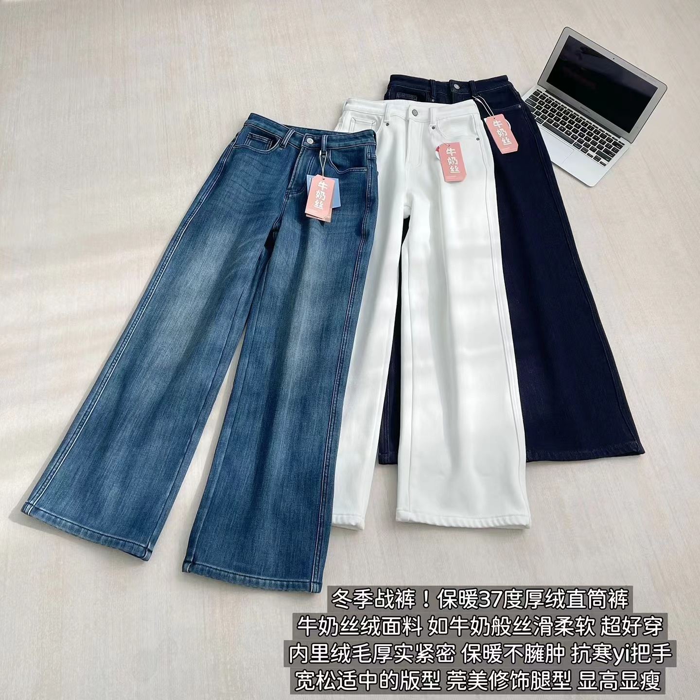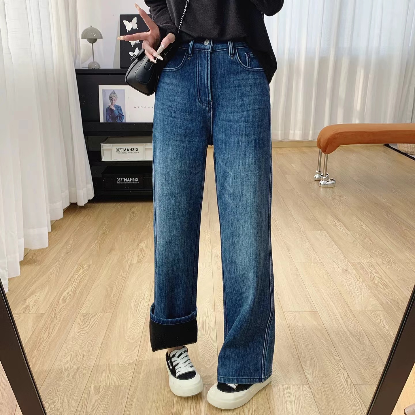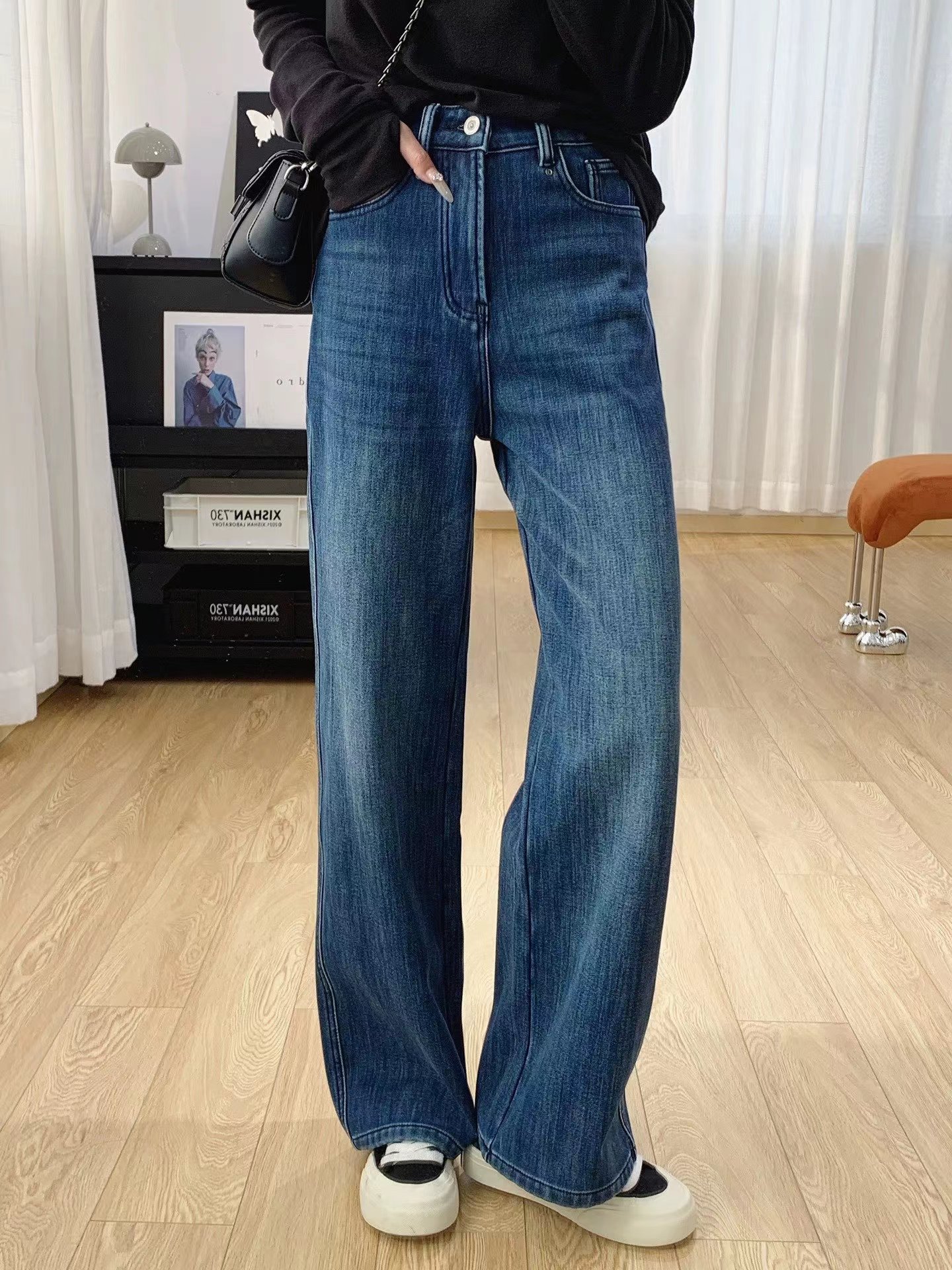 巨显瘦四面弹高腰加绒牛仔裤女秋冬裤子宽松直筒阔腿裤冬季长裤, 怕冷星人的本命牛仔裤来啦冬日刚需哦密密的一层牛奶丝绒顶得住冬天的冷风直吹它不是秋款的那种薄磨绒而是那种糯糯的暖肤绒密而柔软穿上也不会觉得腿胖一圈,暖而显瘦就对了冬天zui怕裤子紧绷,这条是做了四面弹的瞬间回弹弹性大上身不勒也不会紧自由自在无束缚0压感款式做的jing典直筒版型莞美藏住肉肉隐匿臀胯不自信和问题腿型巨藏拙显瘦视觉顺直双腿轻松穿出纤瘦骨感腿型很推荐怕冷又想要利落感的姑娘试试!