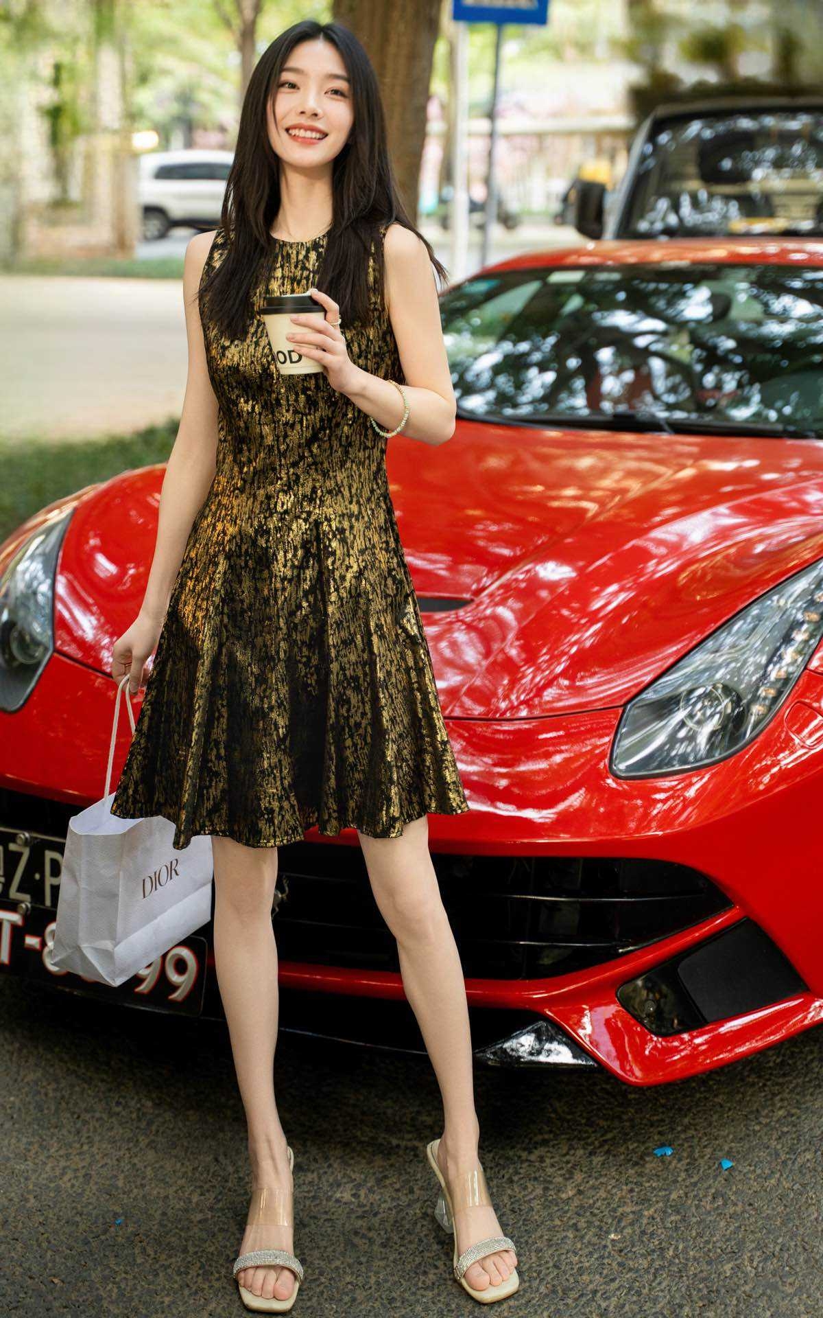 SZ2S125_赤金色_连衣裙_夏季_无袖圆领收腰大摆烫金提花短款 A 字_高级女装_BERNIEELEN 伯妮斯茵