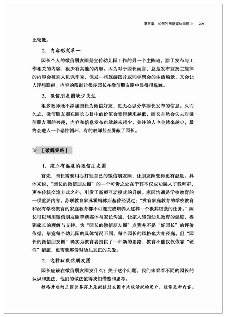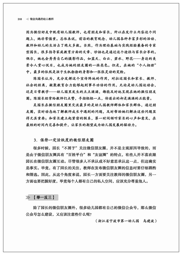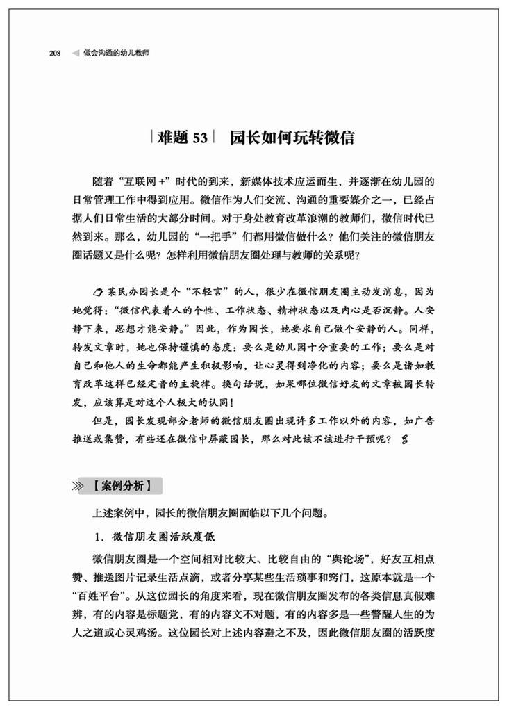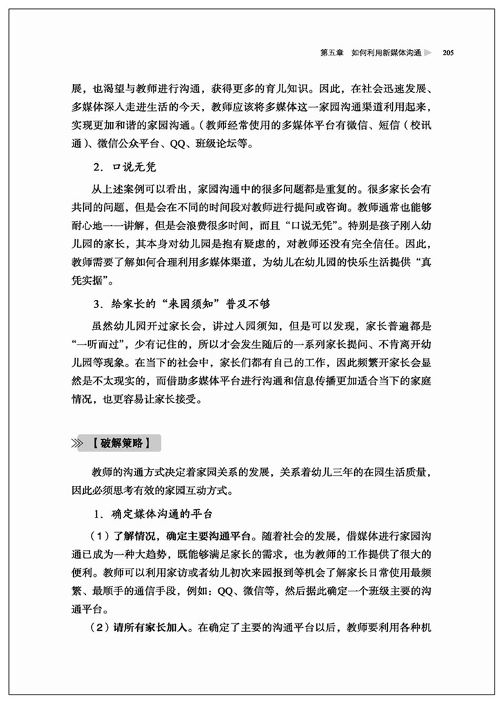 在实践中我发现,幼儿教师遇到的问题具有一定的共性。于是,我将这些问题收集起来,然后进行整理,梳理出教师最为关心的若干问题。因此,呈现在读者面前的这本书不仅解析了幼儿教师与幼儿、家长等沟通的难题,更为关键的是结合现实需求,对幼儿教师如何与同事、家人及利用新媒体等沟通也进行了探讨,让本书更富有时代感。