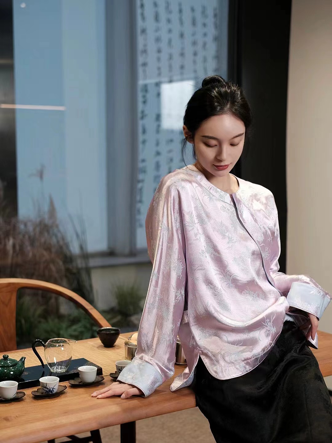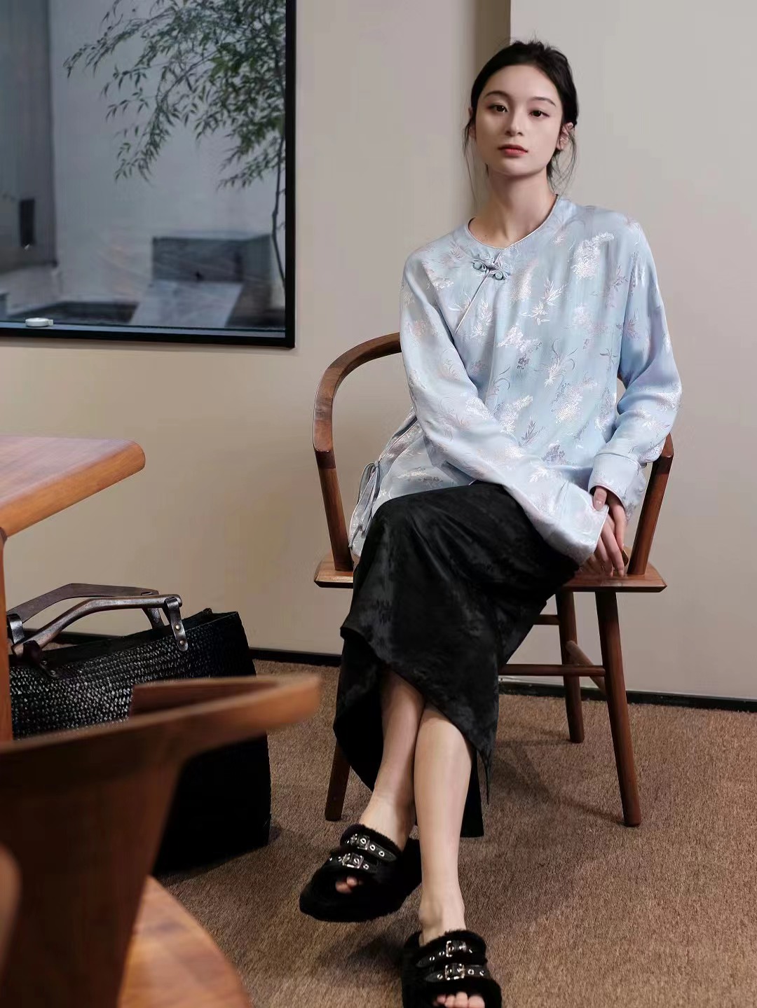 盛唐婧 |桑蚕丝重缎折枝玫瑰花直筒裤-黑色