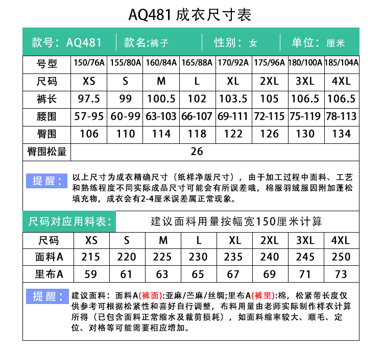 裁缝学苑AQ481款松紧腰带里布宽松阔腿裤纸样裙裤女装休闲裤打版裁剪图