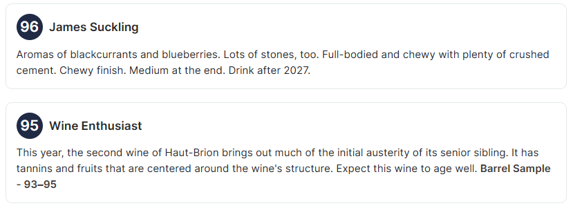 “小奥比昂展现出超越正牌的早期严厉感,围绕着葡萄酒结构的单宁和水果,预计陈年后将更出色。”