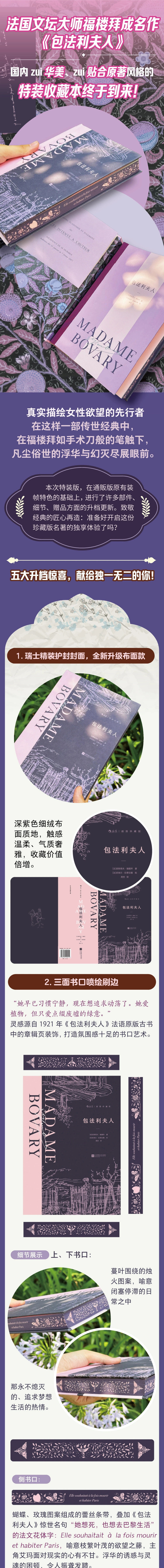 《包法利夫人(插图珍藏版)》原名《包法利夫人:外省风俗》,是奠定福楼拜文学地位的代表作品,现实主义文学的开山之作。该小说于1856年10月在《巴黎评论》上首次连载时曾遭到删减,巴黎的检察官更是以内容“违反公序良俗和宗教伦理”为由进行了抨击。1857年1月的法庭审判使小说名声大噪。1857年2月福楼拜被无罪释放后,《包法利夫人》于1857年4月正式出版。