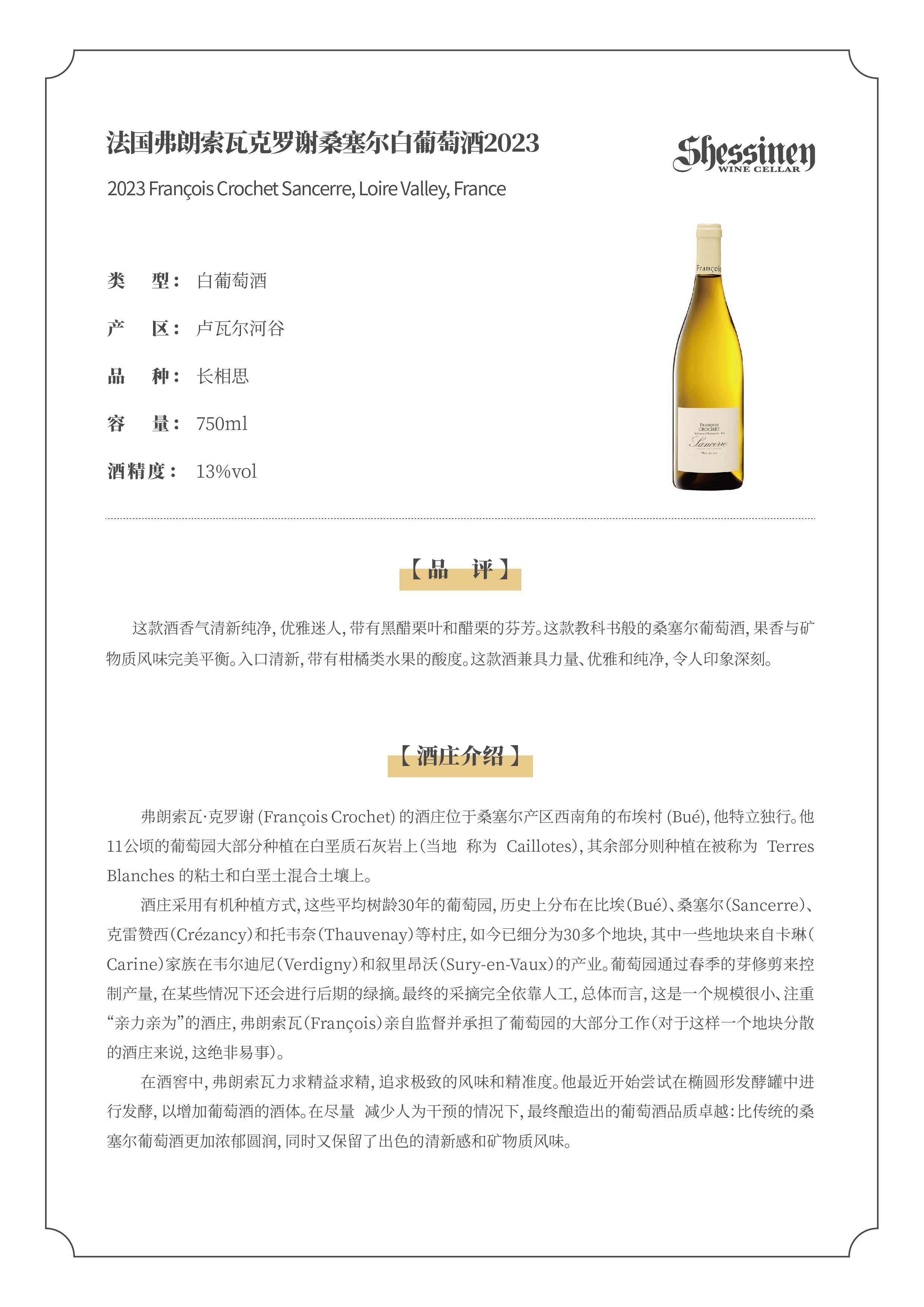 法国卢瓦尔河谷弗朗索瓦克罗谢桑塞尔白葡萄酒2023