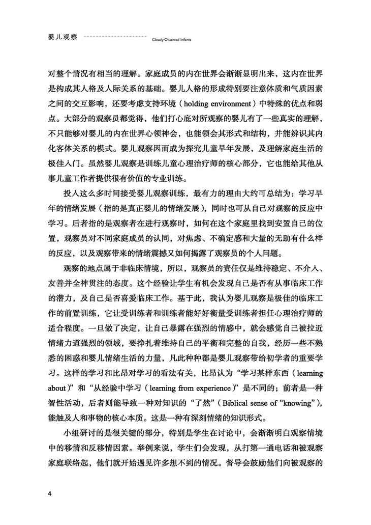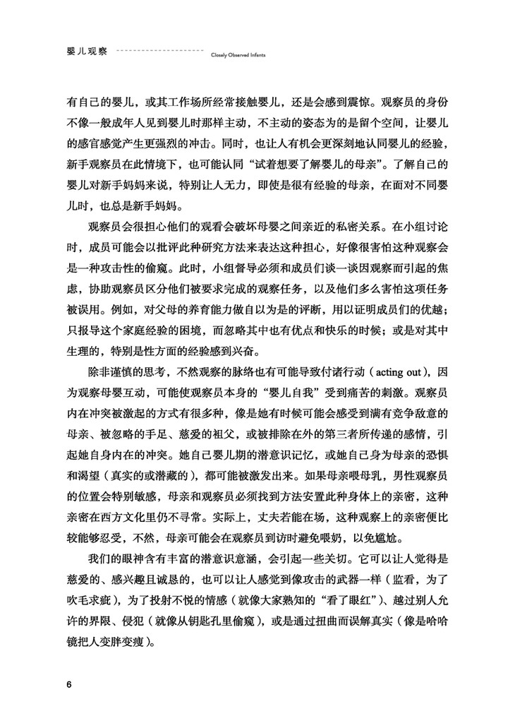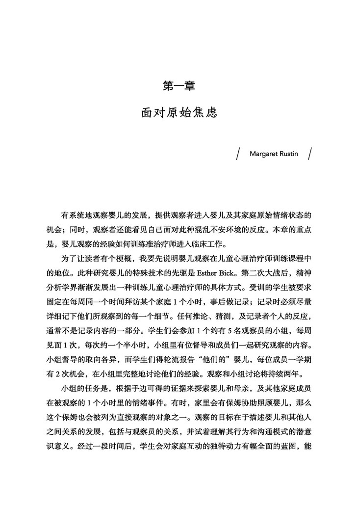 本书是Tavistock中心心理治疗师养成训练课程之一,也是精神分析师的必修课程。作者着眼细节之处,以不带预期以及理论知识的客观态度,巨细靡遗的观察并记录了婴儿早期情绪发展及内在世界的形成过程,有助于读者了解婴儿与家人最原始的情绪互动,并观察自己在这一过程中的情绪反应。本书有着丰富的临床案例,是一本重要的经典著作,可以被视作学习精神分析的宝典。