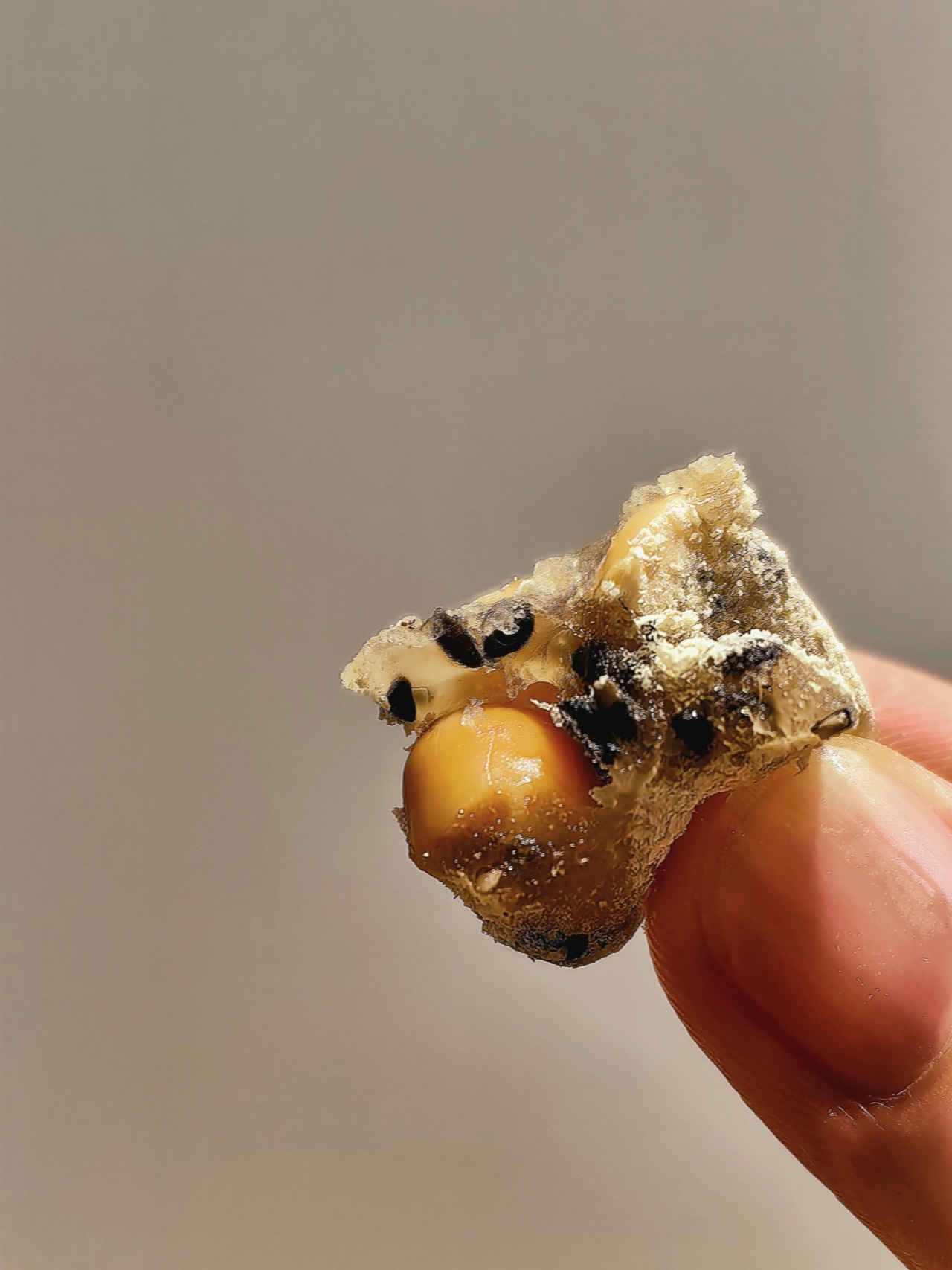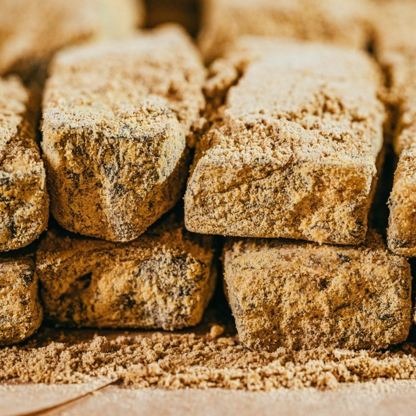 留海棠黄豆麻糕只用了麦芽糖、花生仁、黑芝麻、黄豆面、小麦粉、白砂糖和食用植物油,这些常见的食材在匠人的巧手下,幻化出了令人难以抗拒的美味。麦芽糖经过土灶熬制,不断以人力搅拌,使它熬成晶莹透亮,色如琥珀的状态,裹入黑芝麻与花生仁后,依然需要不断翻转,直至均匀、稠密、弹润,再由师傅数次反复擀压按摩,糕体才得以软糯绵密,然后滚入炒得喷香的熟黄豆面中,让小糕块儿蓬松金黄,盖上三层油纸静置半天,在热气消散过程中充分吸收豆香,变得软糯不散,温润浓郁!