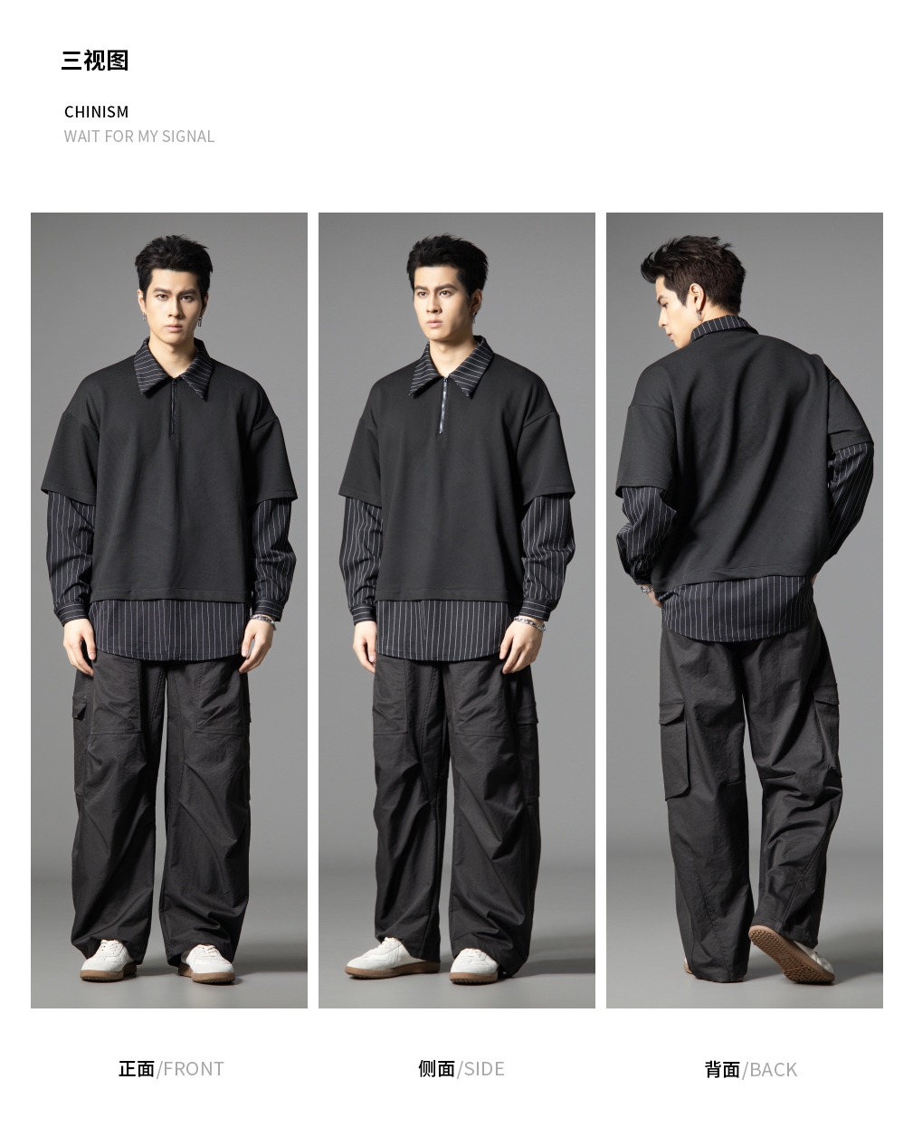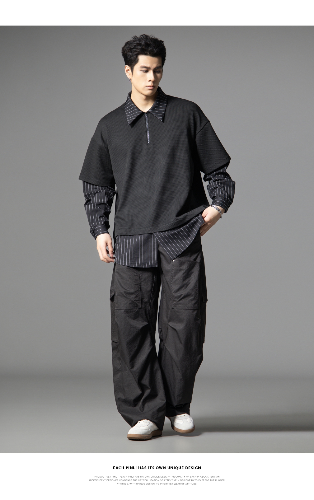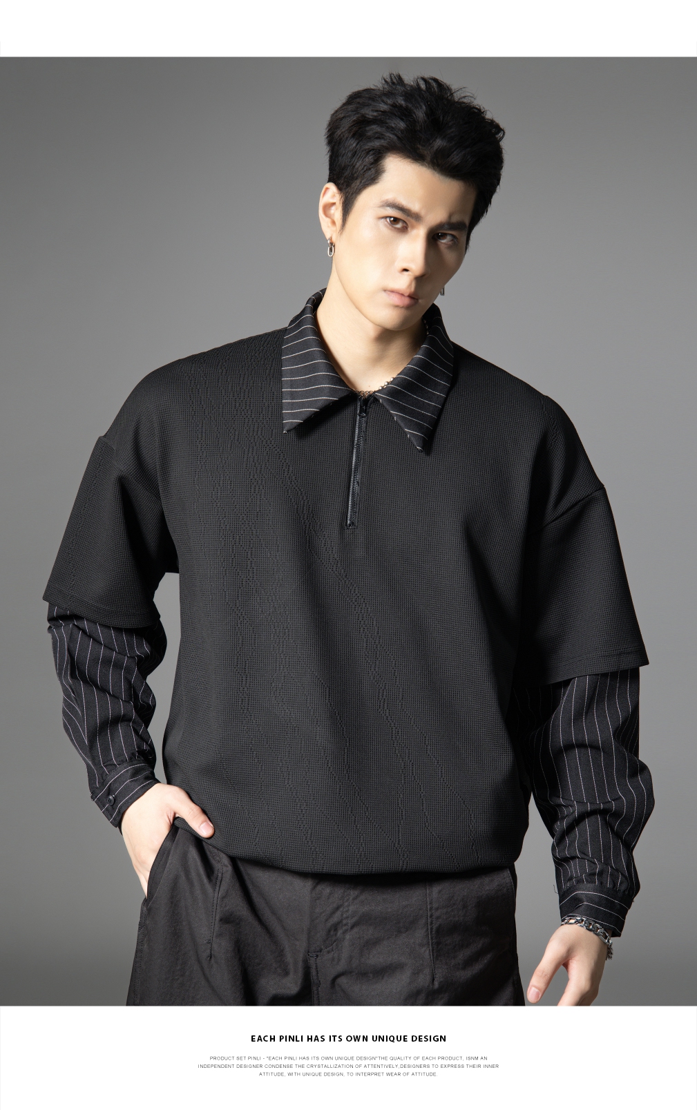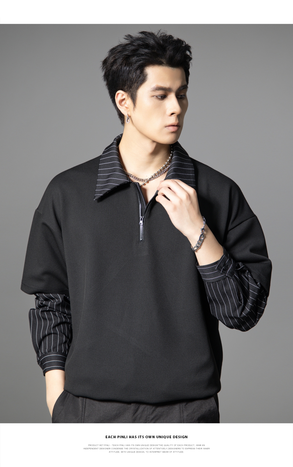 PINLI品立2025秋季新款衬衫领拼接条纹卫衣假两件宽松休闲上衣潮B253109053
