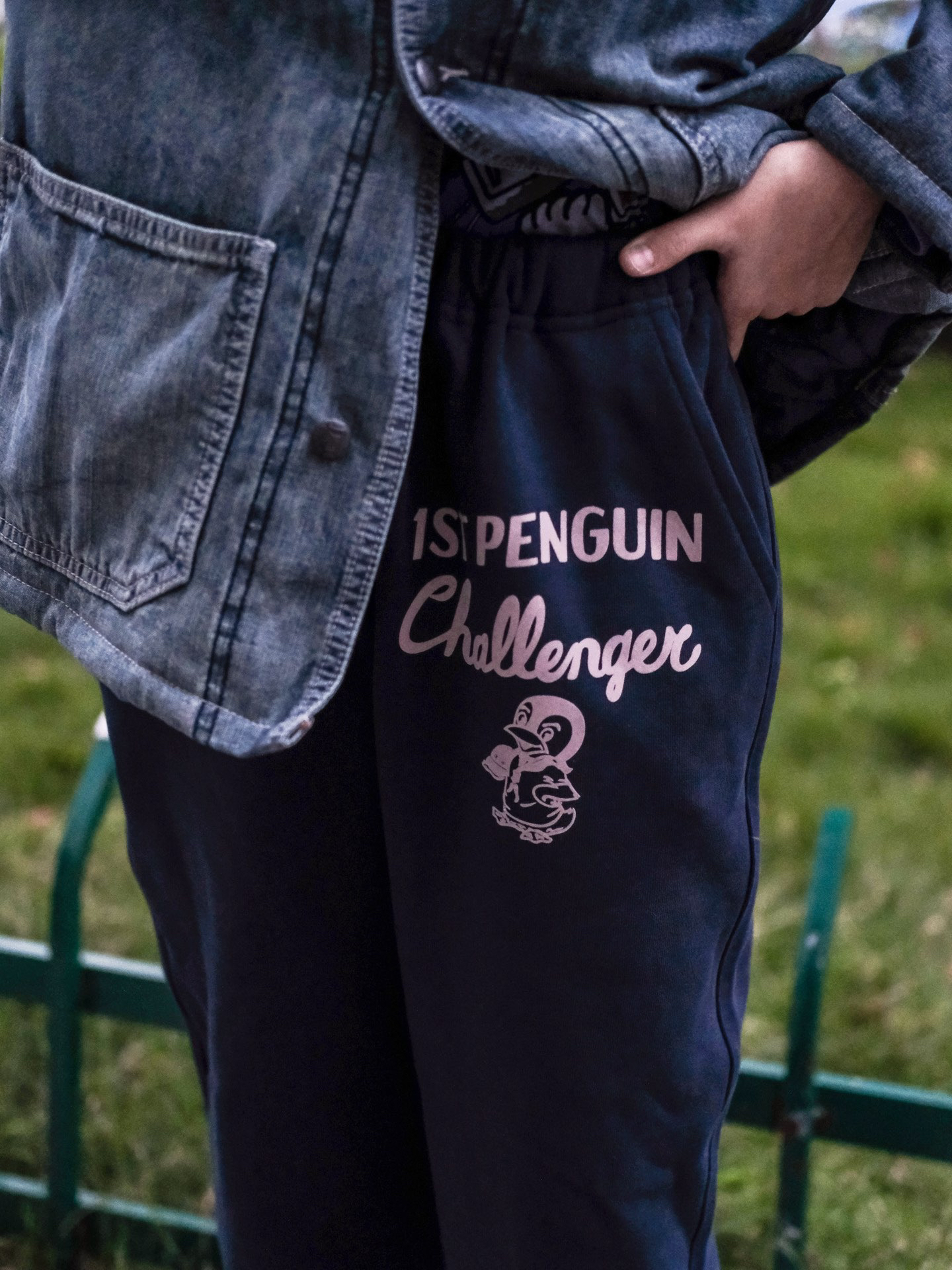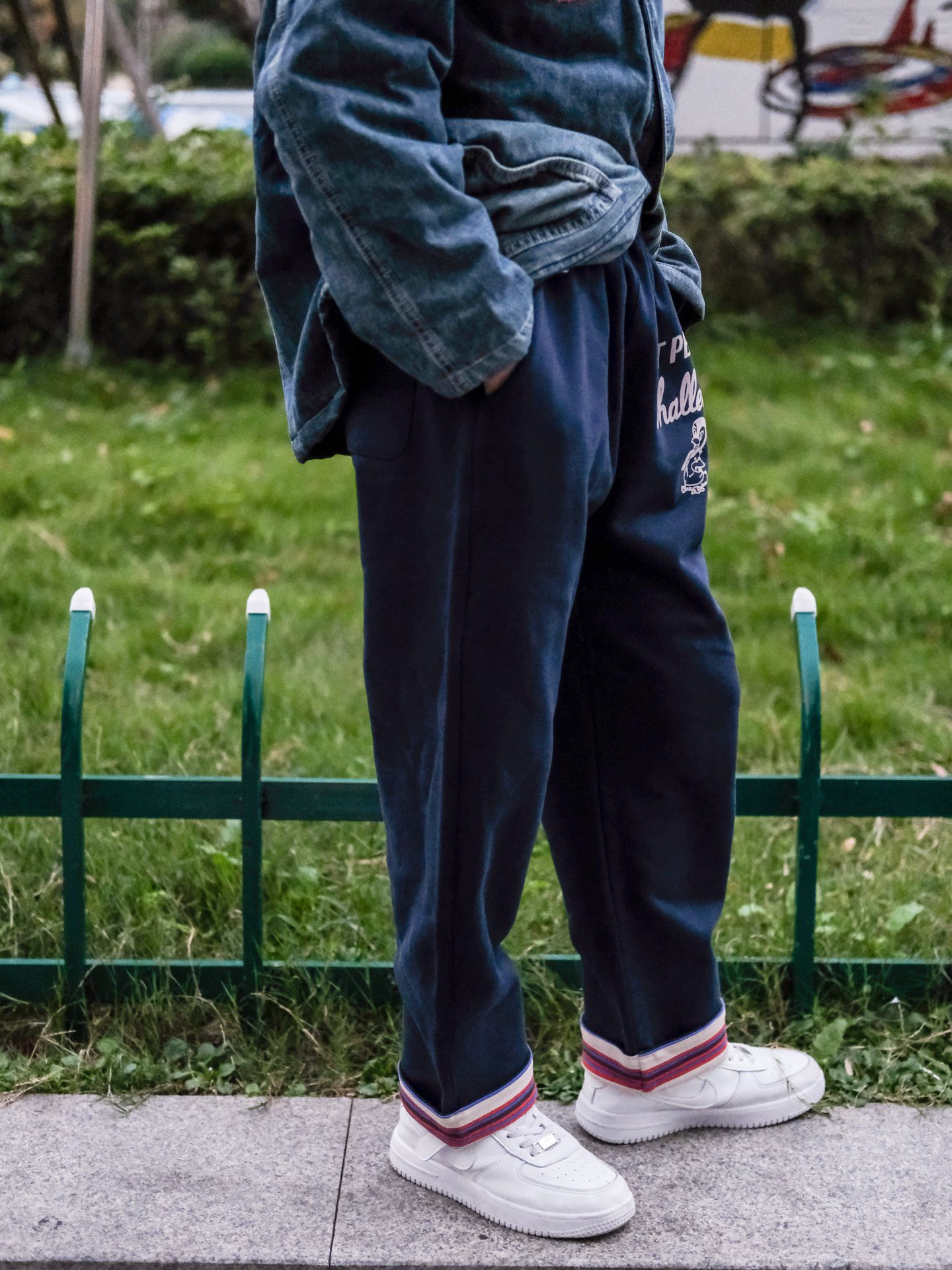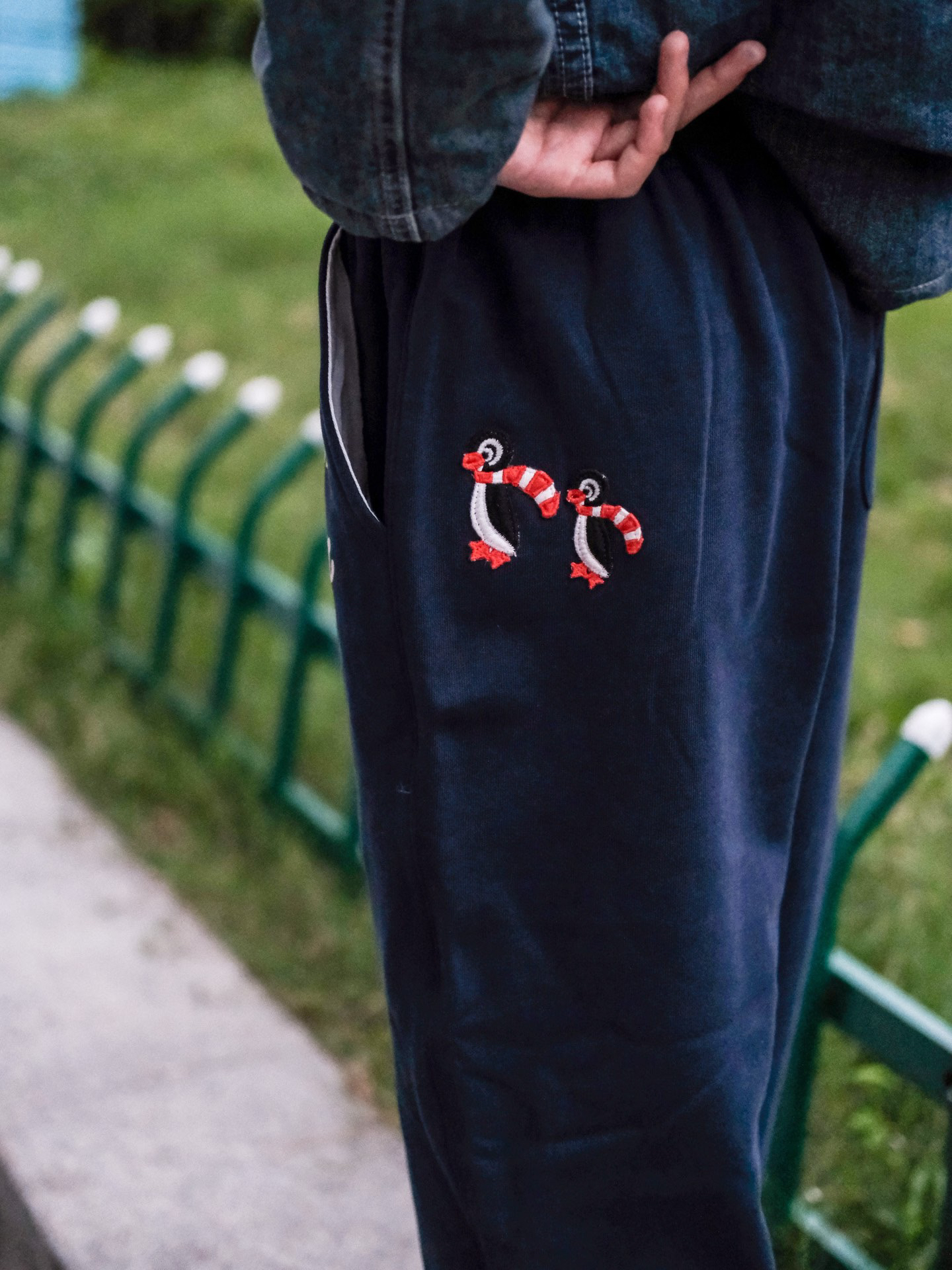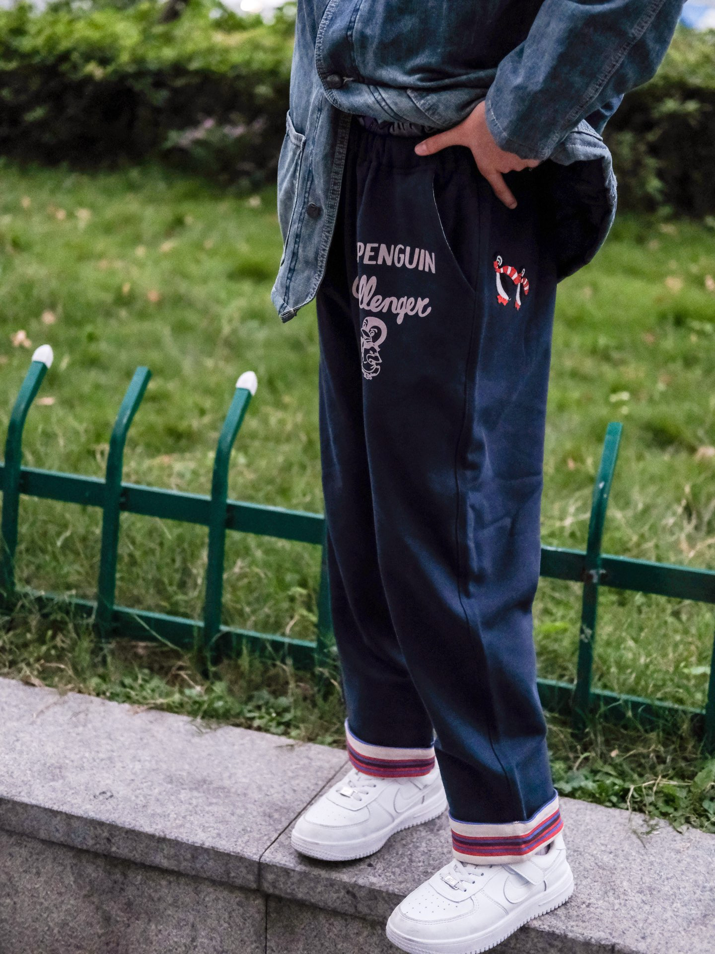 2024秋冬DD同款日系企鹅加绒卫裤!印花立体刺绣彩色条纹轻抓绒运动长裤!