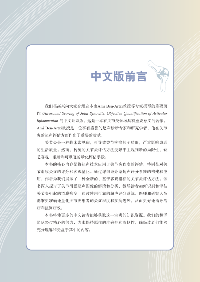 本书的核心内容是将超声技术应用于关节炎程度的评估,特别是对关节滑膜炎症的评分和客观量化。通过详细地介绍超声评分系统的构建和应用,作者为我们展示了一种全新的、基于客观指标的关节炎评估方法。该书深入探讨了关节滑膜超声图像的解读和分析,教导读者如何识别和评估关节炎引起的滑膜病变。通过使用可靠的超声评分系统,医师和研究人员能够更准确地量化关节炎患者的炎症程度和疾病进展,从而更好地指导治疗和监测疗效。