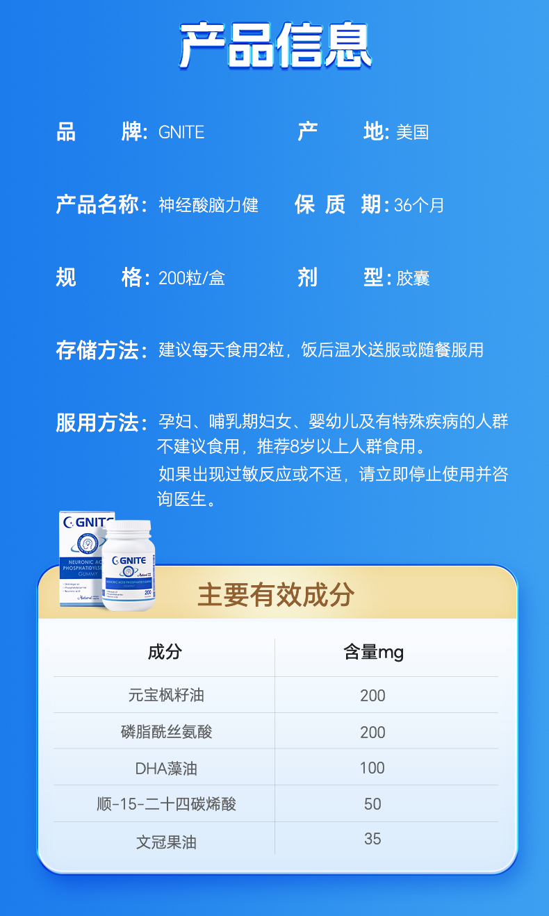 【品名】美国进口GNITE神经酸脑力健 【规格】200颗/瓶 【保质期】36个月 【产地】美国 【发货地】郑州 【发货快递】中通 【不发货区域】新疆、西藏、内蒙、港澳台地区不发 【发货时效】48小时,节假日顺延 |