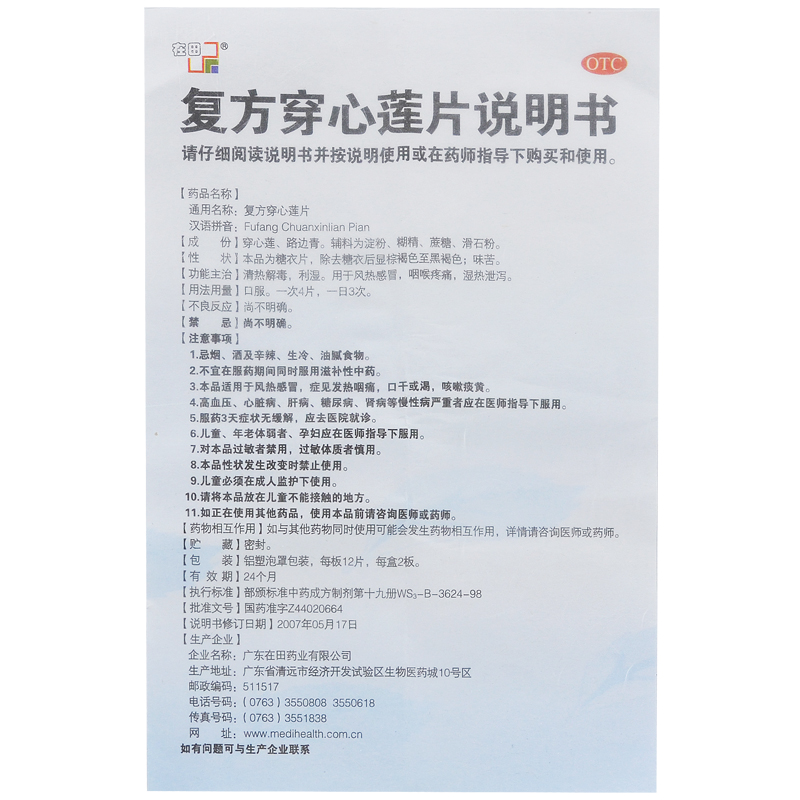 在田 复方穿心莲 24片/盒