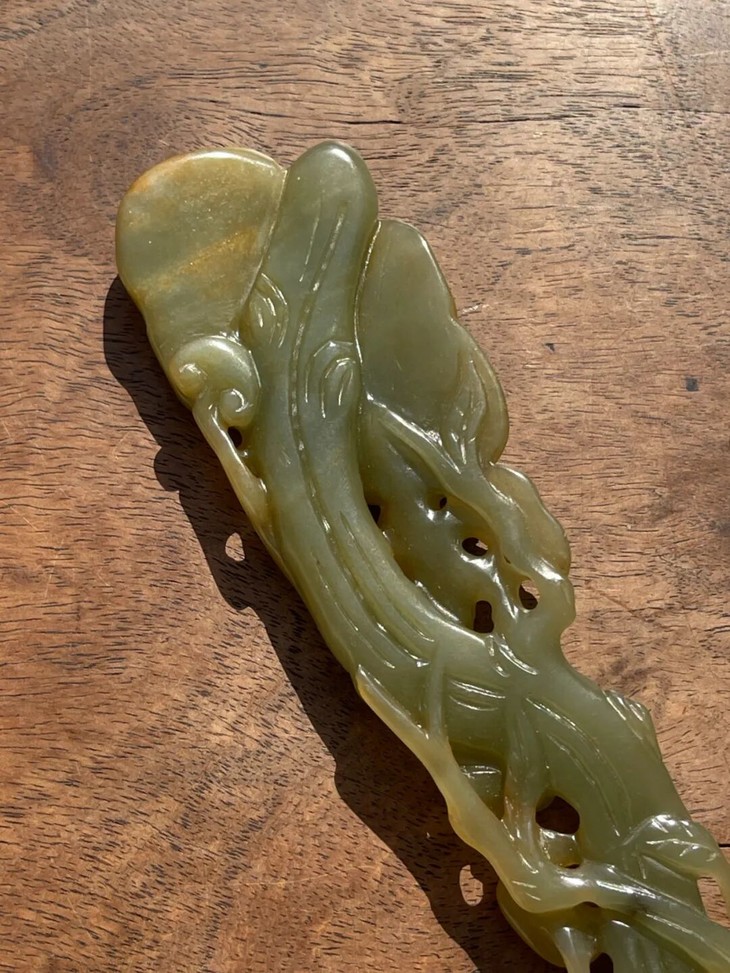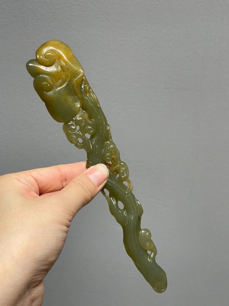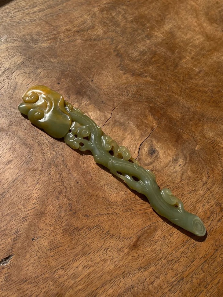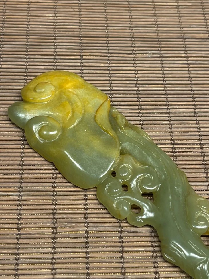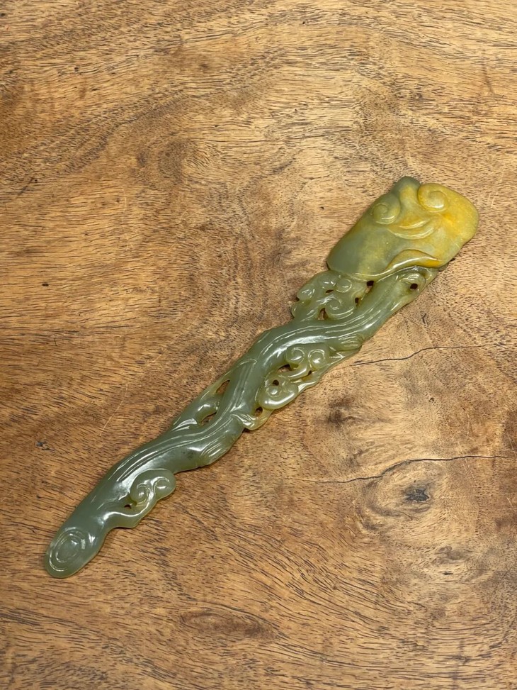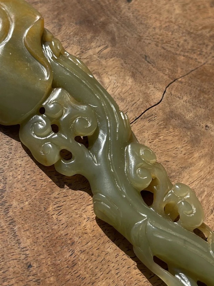 这是一件以天然和田青黄玉镂空雕琢而成灵芝形如意摆件,以材质温润、比重高的青黄色和田玉镂空雕琢而成造型独特的灵芝长柄如意摆件,尺寸不小、长达二十厘米,仿生天然灵芝造型典雅贵气,以精湛之镂雕技艺生动描绘灵芝与枝干长柄,形式生动流畅,刀法娴熟简洁流畅,是近代卓越玉雕匠人的佳作。