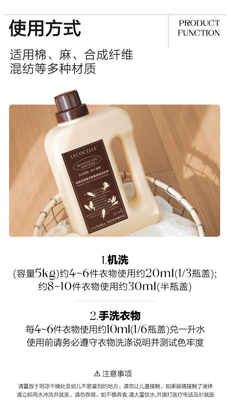 使用方法也十分便捷:机洗时,4-6件衣物使用约20ml(1/3瓶盖),8-10件约30ml(半瓶盖);手洗时,每4-6件衣物用约10ml(1/6瓶盖)兑一升水就可以。洗完的衣物干净柔软,香气持久,外出时仿佛自带体香,一天都不散!