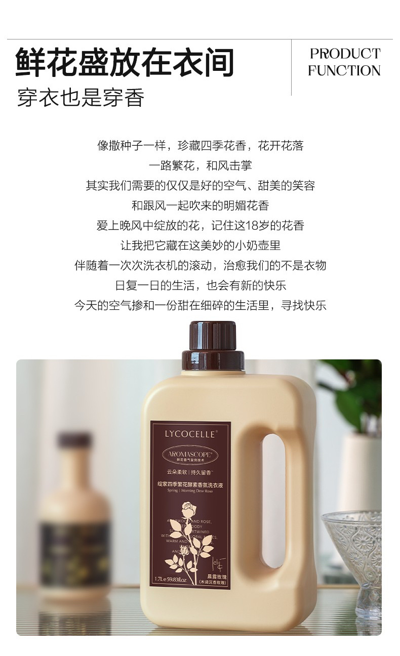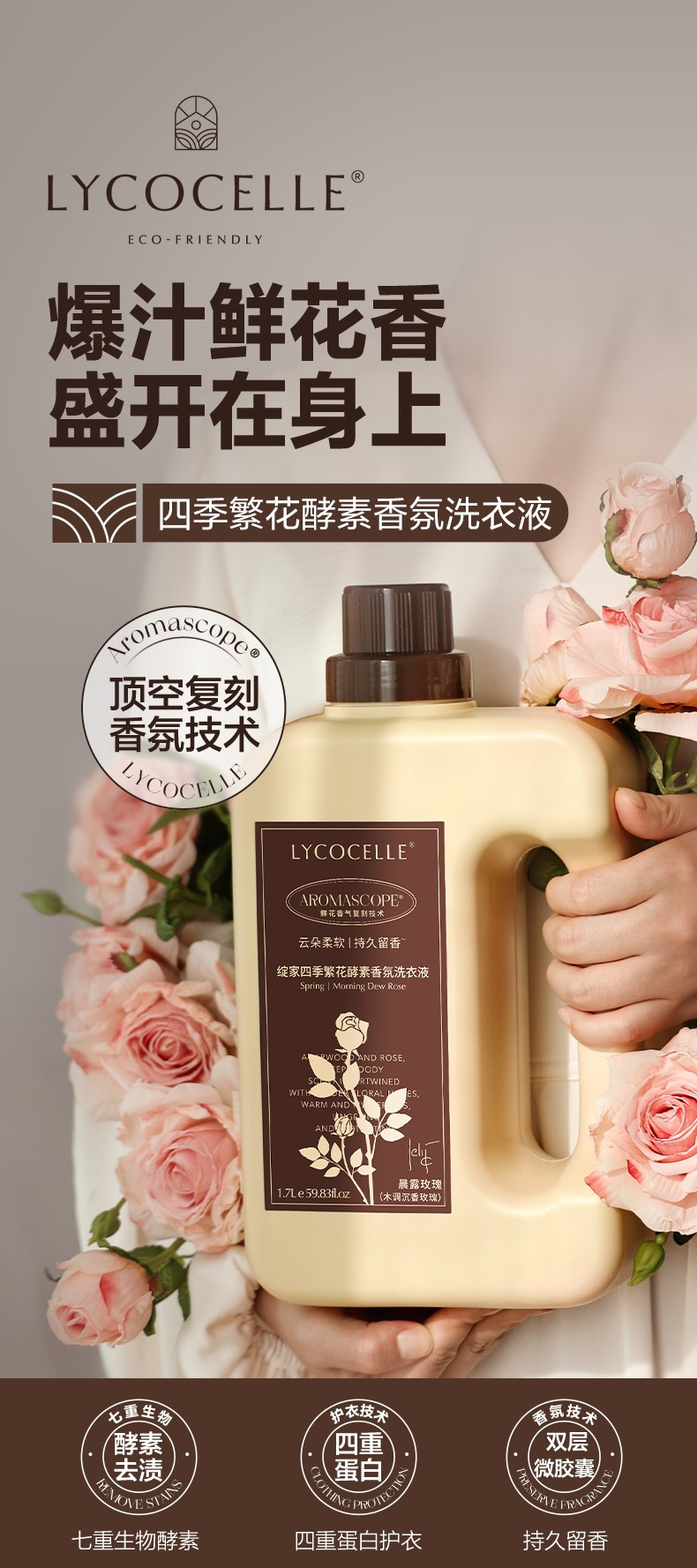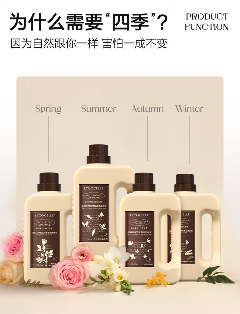 四季繁花香氛洗衣液的魅力,源于先进的Aromascope®顶空复刻香氛技术,精准还原鲜花娇嫩绽放时的香气,努力保留每朵花"18岁"时的芬芳状态。配合微胶囊PopScent®科技,让精油实现72小时持久散香,牢牢捕捉四季繁花盛开的瞬间。而且,都是来自高奢线调香师团队——顾正青、Jacob Varela、Catherine Selig和Sylvie Fischer,将海派文化与法国香氛艺术巧妙融合,打造独一无二的体验。