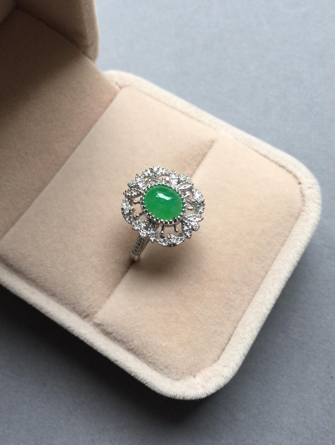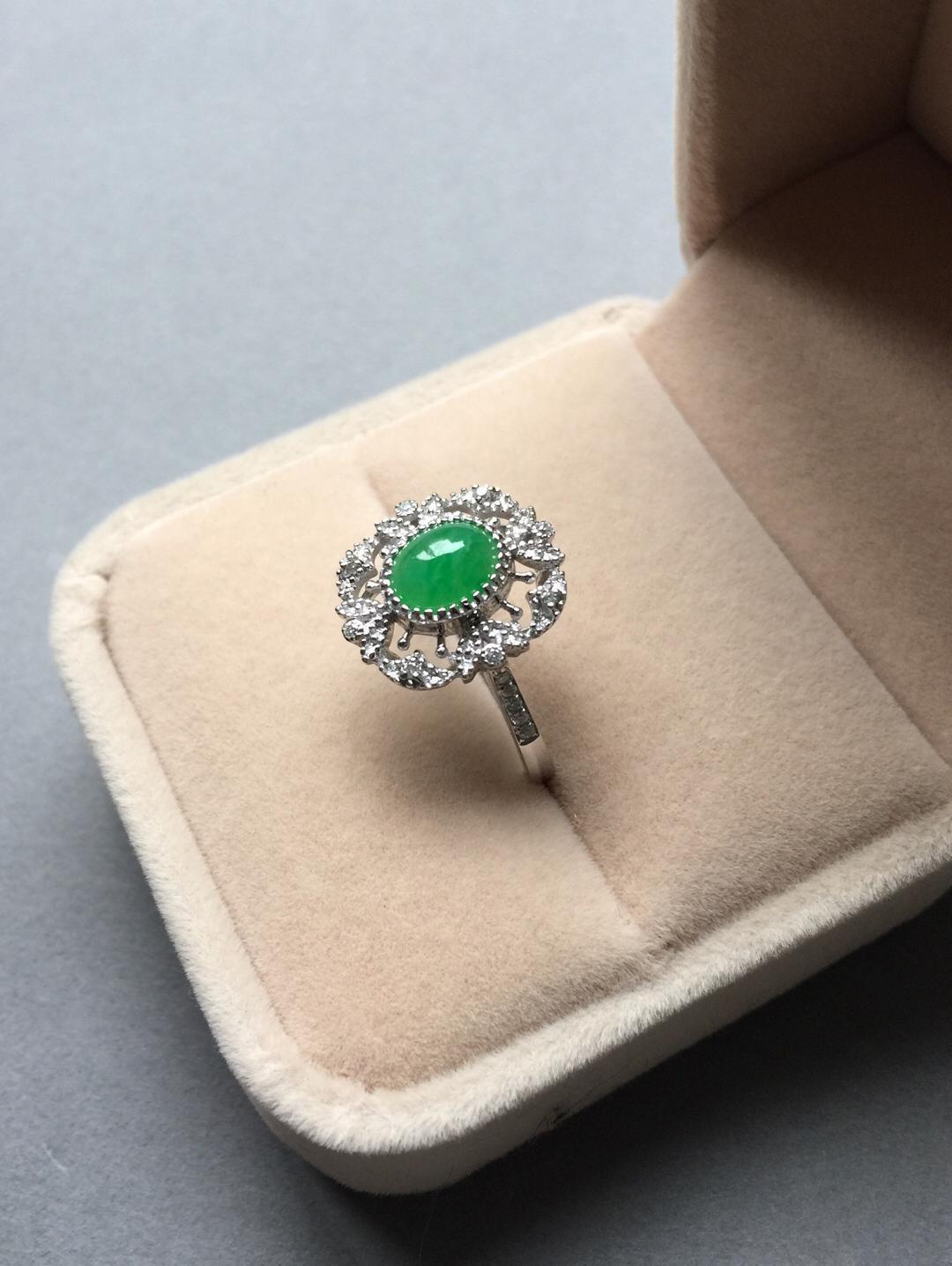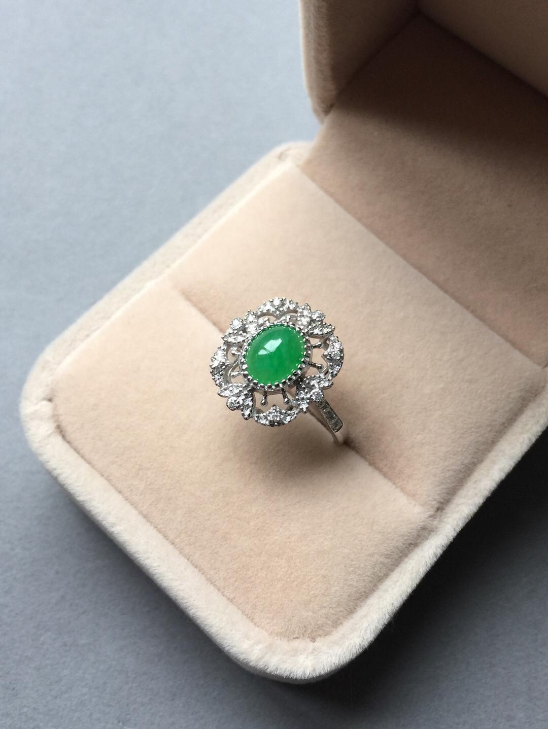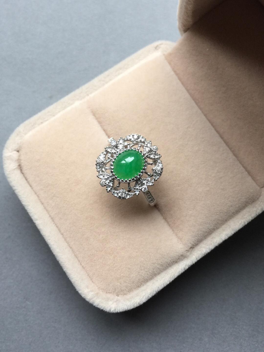 款式别致的冰种阳绿翡翠蛋面戒指,种水好,绿色艳丽,艳阳绿,娇艳欲滴的感觉让人一见倾心,戒指的款式设计融入了西方古董首饰的灵感,东西合璧的独特韵味,让翡翠瞬间变得时尚起来,上手效果独好看,精品推荐,蛋面8.1*6.2*3.5mm,圈口13可以免费改大小