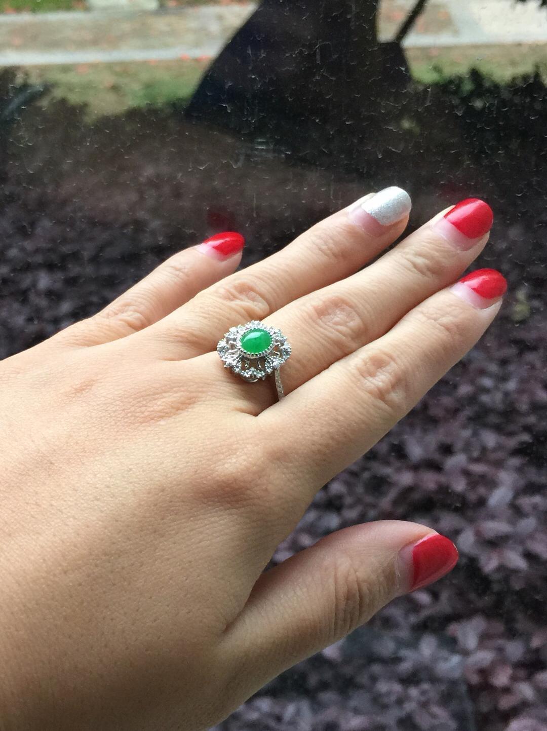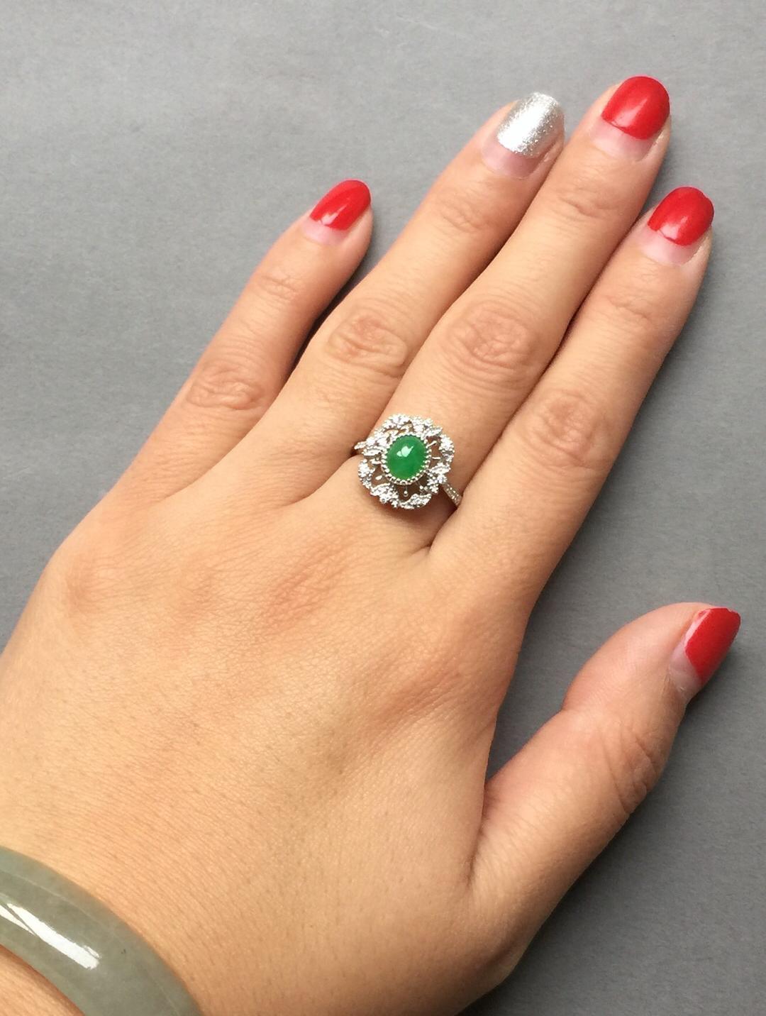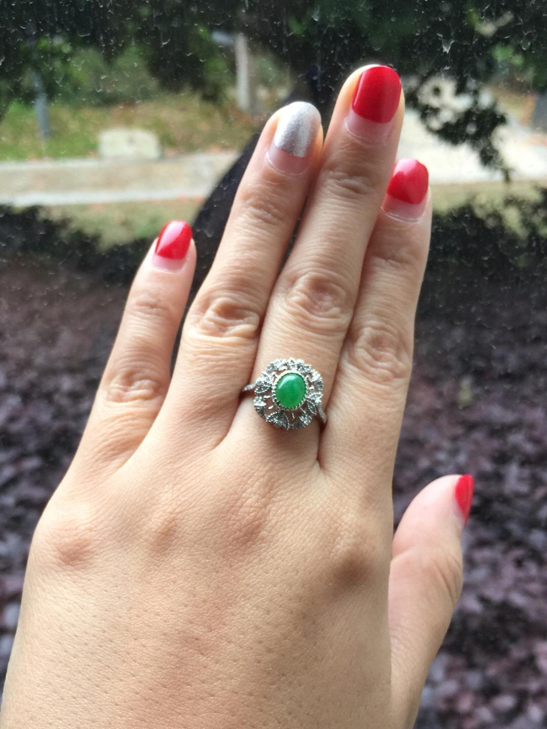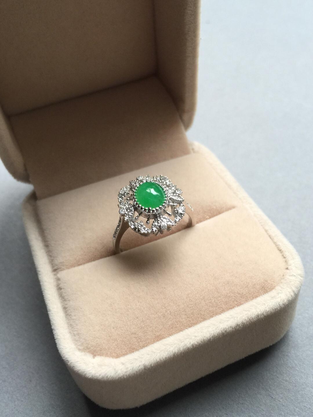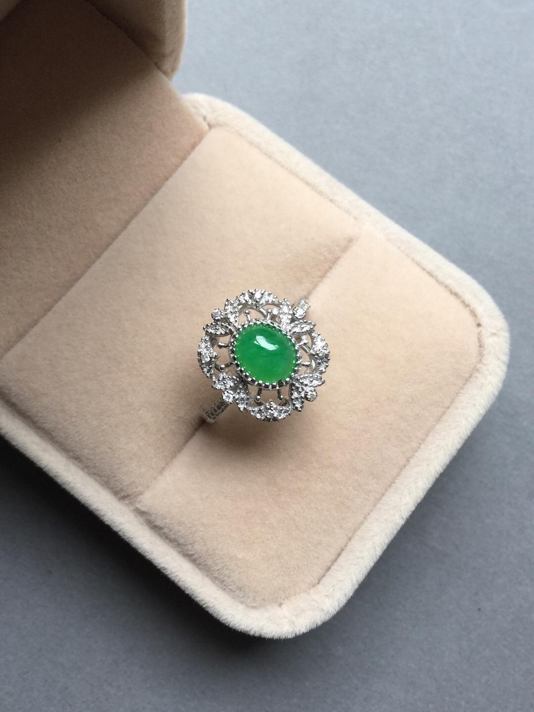 款式别致的冰种阳绿翡翠蛋面戒指,种水好,绿色艳丽,艳阳绿,娇艳欲滴的感觉让人一见倾心,戒指的款式设计融入了西方古董首饰的灵感,东西合璧的独特韵味,让翡翠瞬间变得时尚起来,上手效果独好看,精品推荐,蛋面8.1*6.2*3.5mm,圈口13可以免费改大小