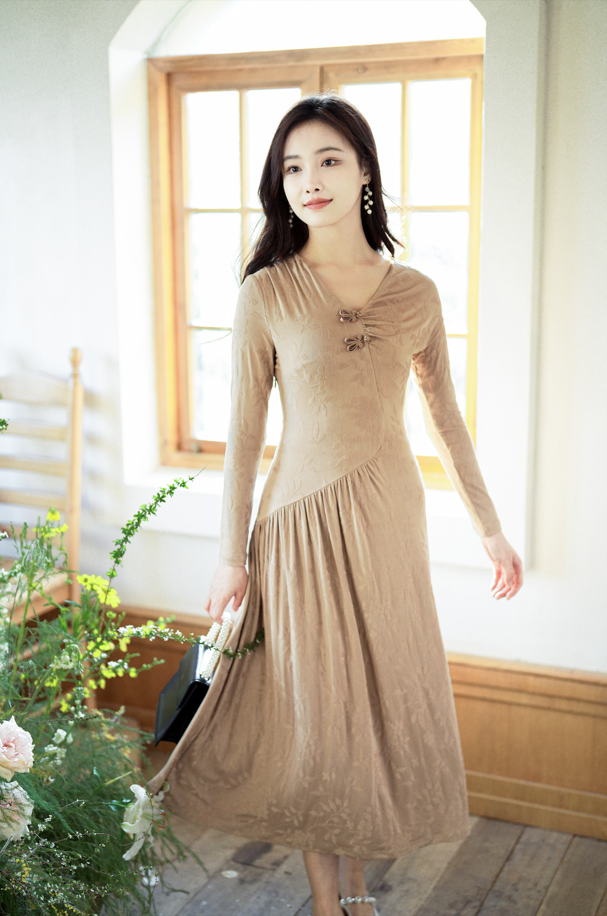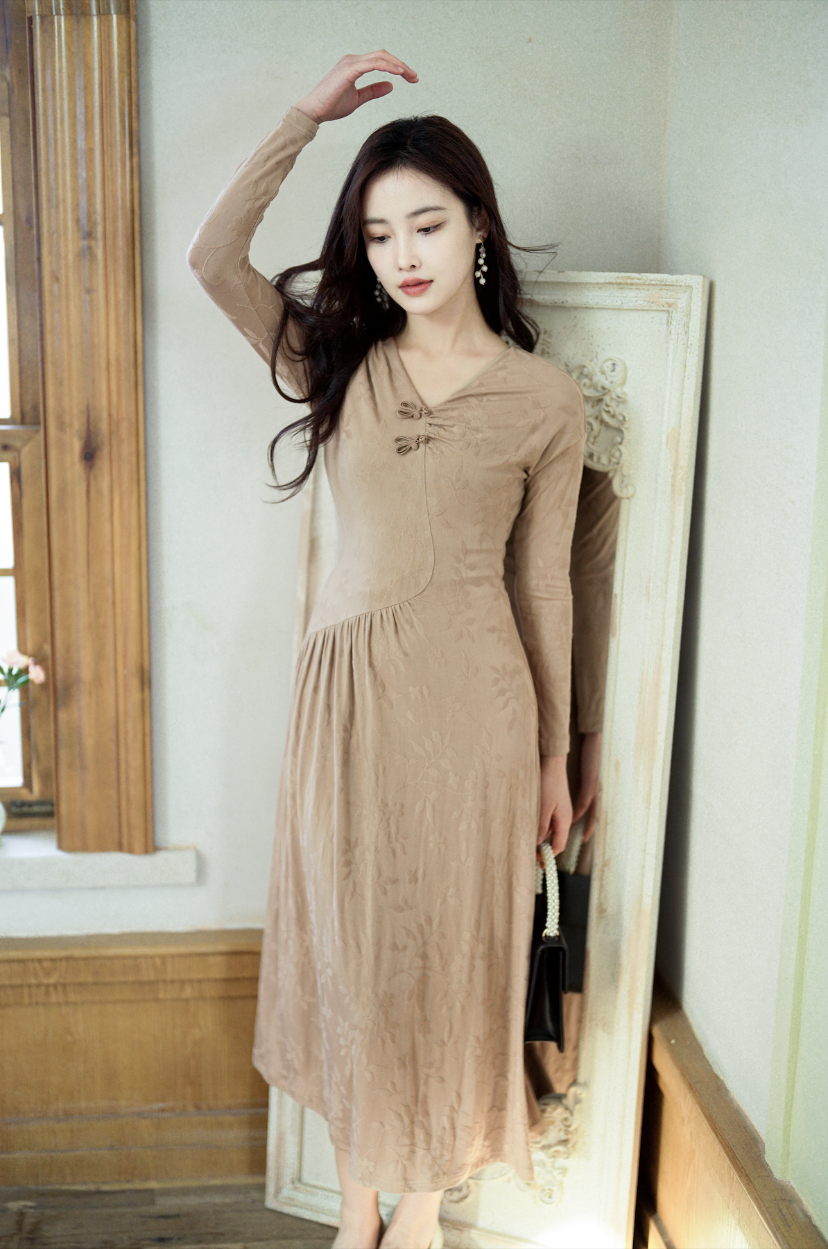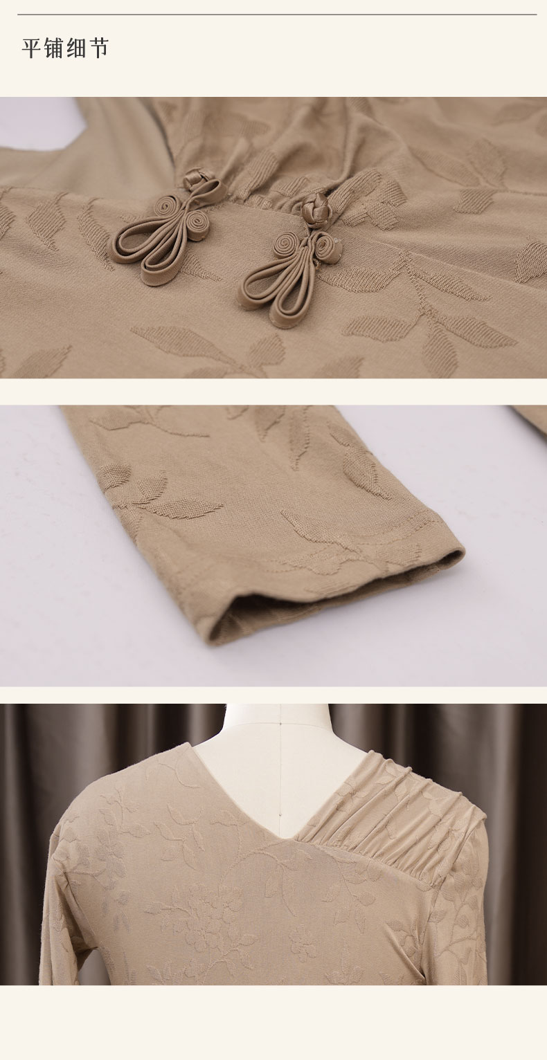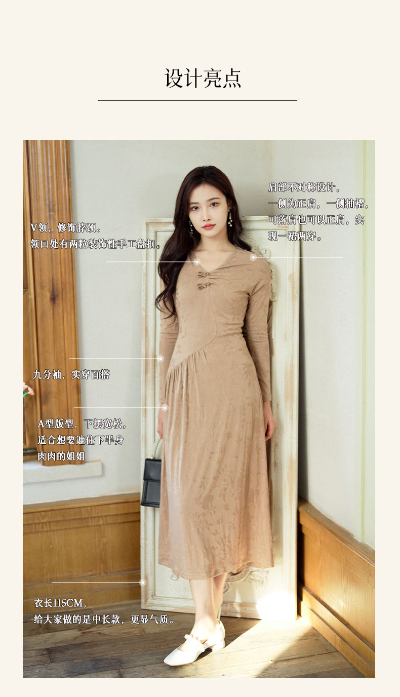 3.V领,修饰脖颈。领口处有两粒装饰性手工盘扣。