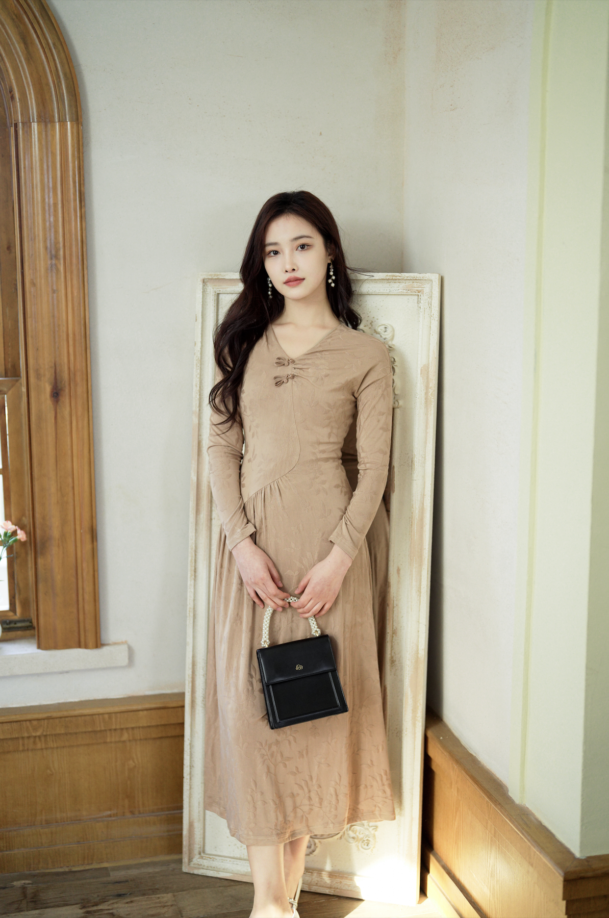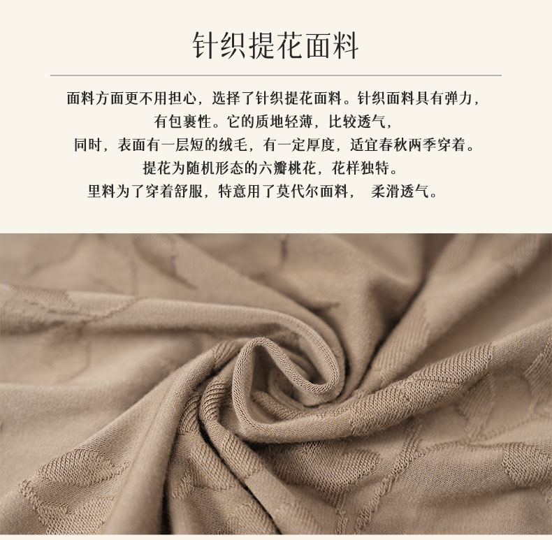 面料方面更不用担心,选择了针织提花面料。针织面料具有弹力,有包裹性。它的质地轻薄,比较透气,同时,表面有一层短的绒毛,有一定厚度,适宜春秋两季穿着。提花为随机形态的六瓣桃花,花样独特。