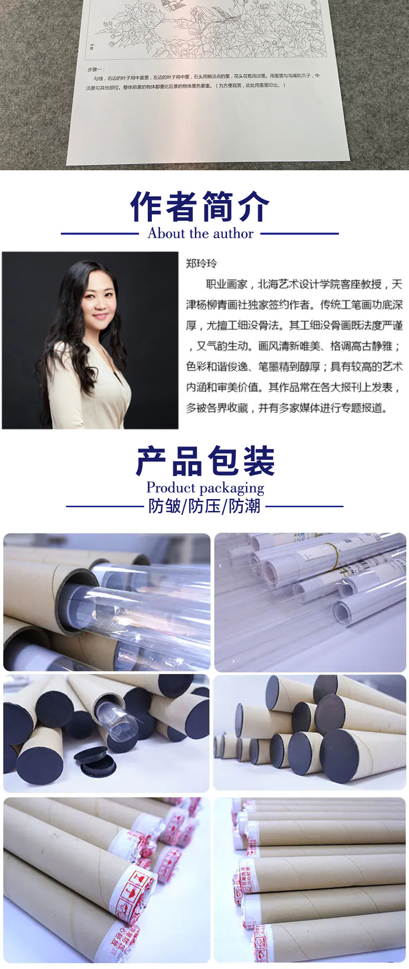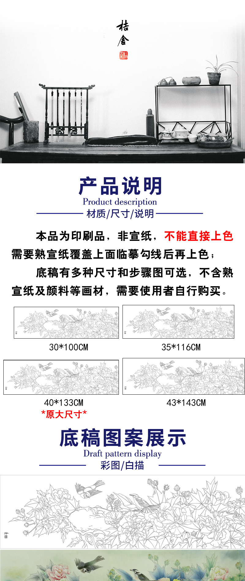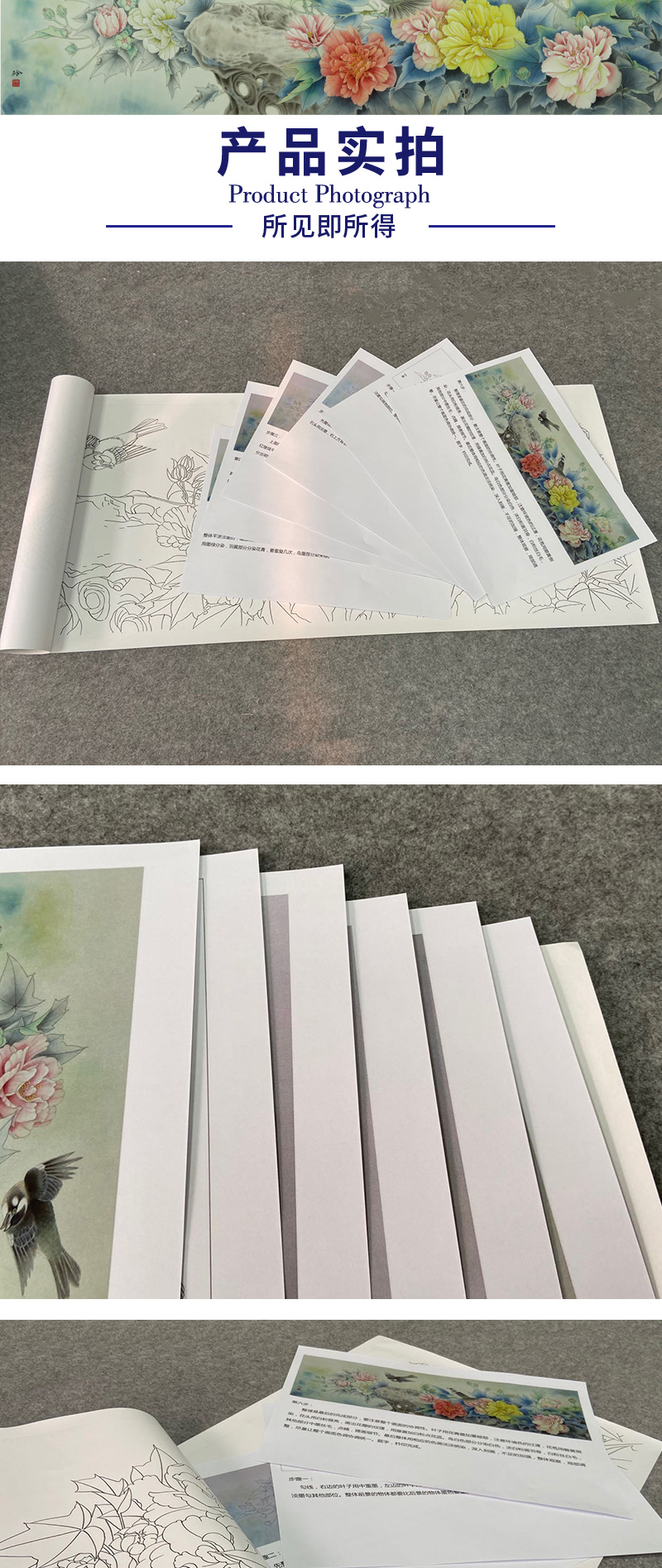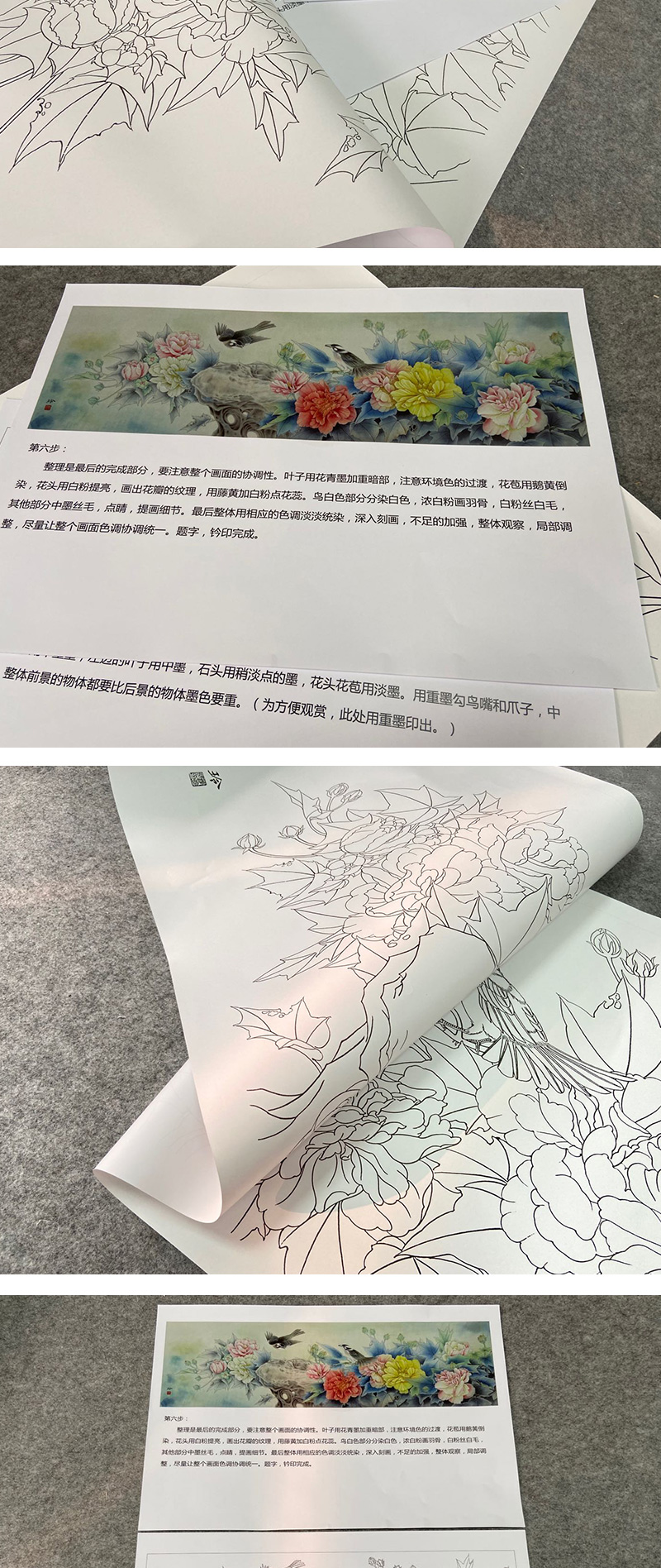 【有步骤、大彩图】郑玲玲横幅工笔花鸟画白描稿《雍容华贵》牡丹初学者临摹花鸟线稿ZL93