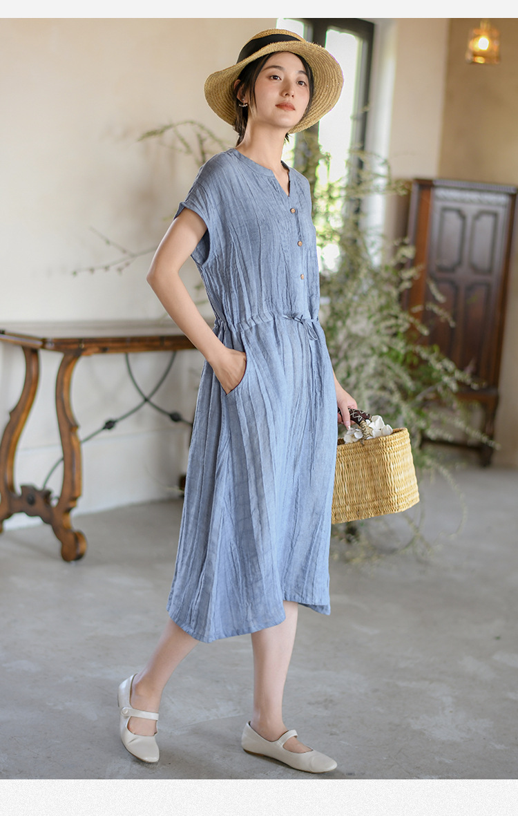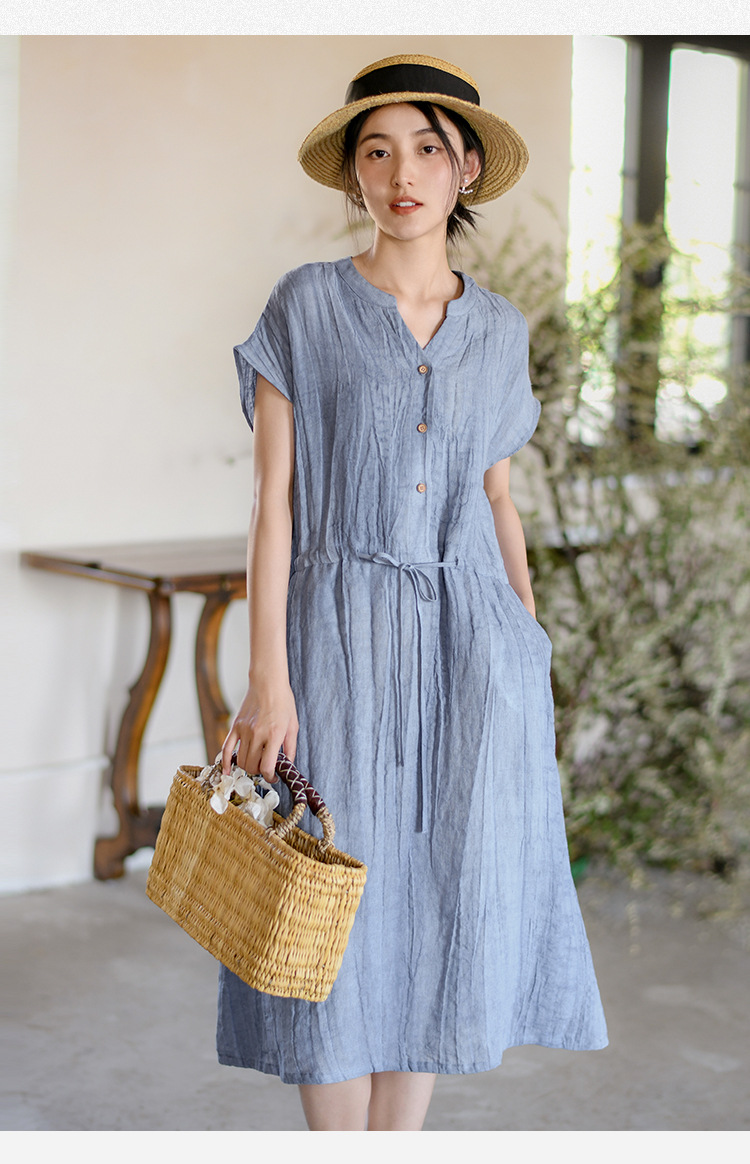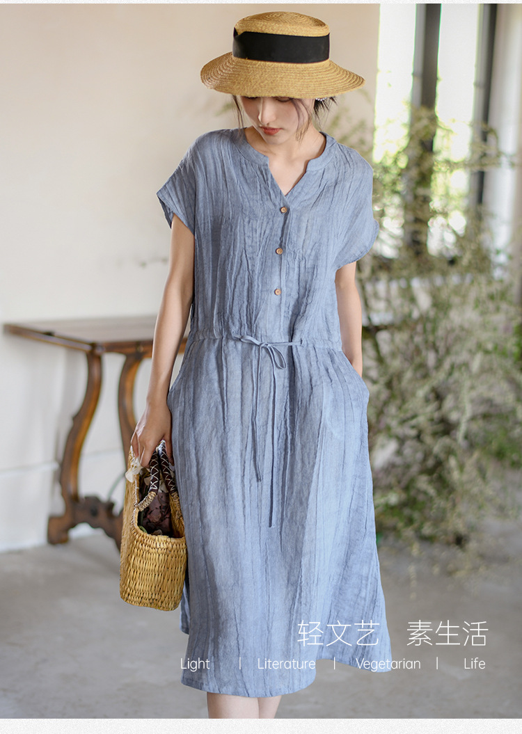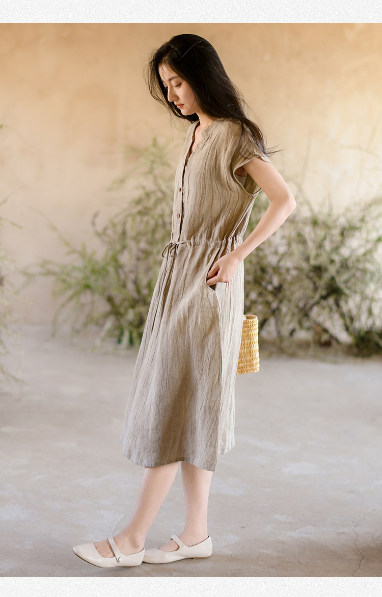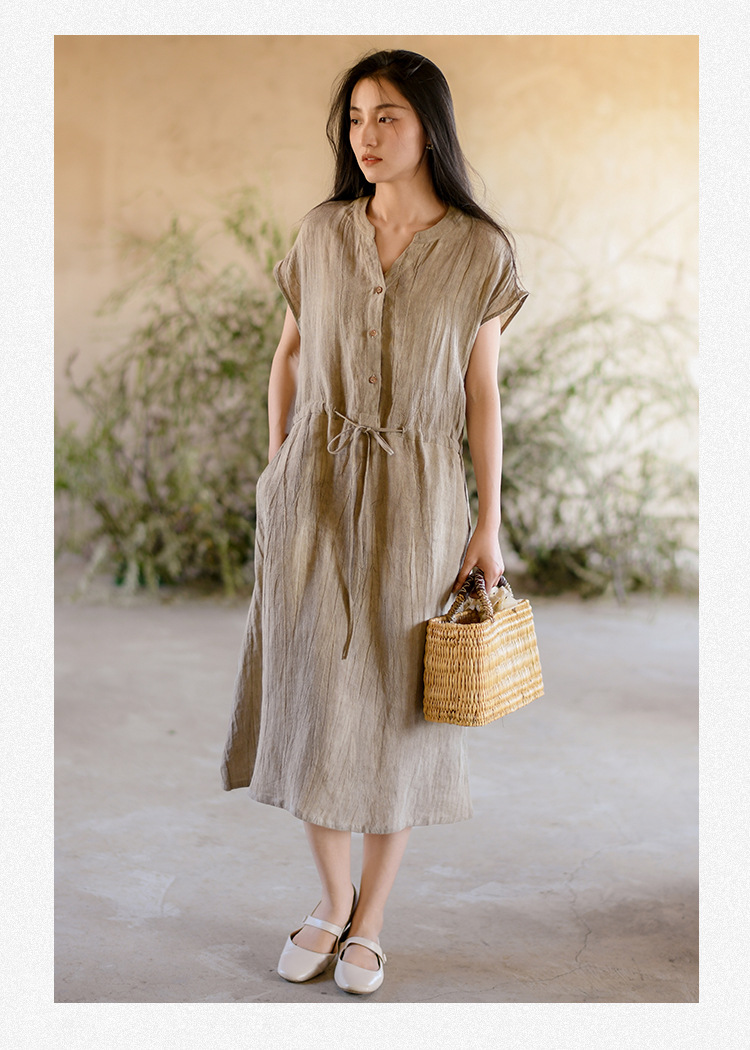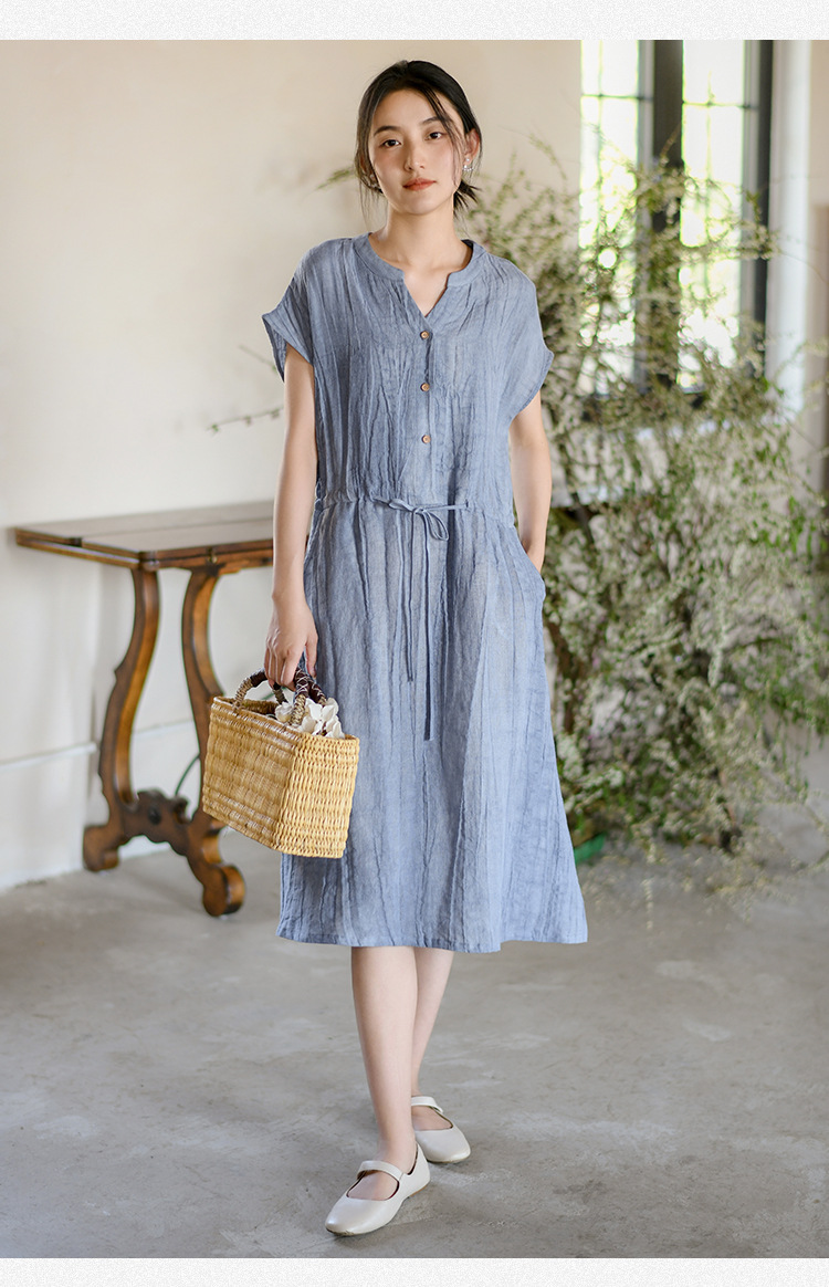 丁摩 新中式女装夏季短袖亚麻连衣裙女收腰显瘦高级感国风裙子4ZF-63002