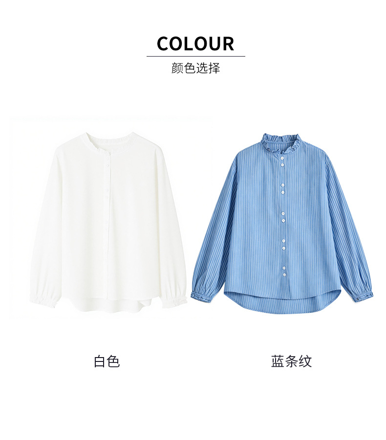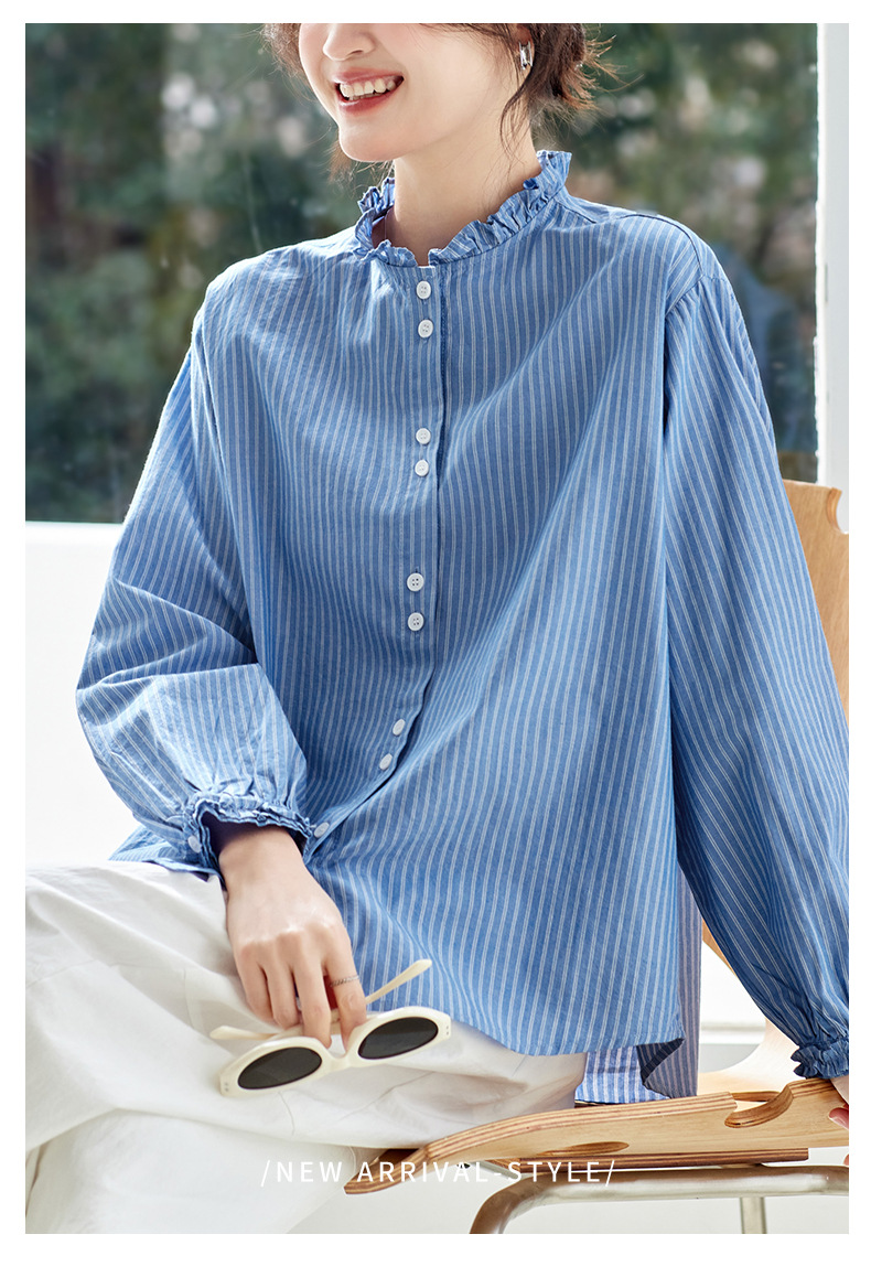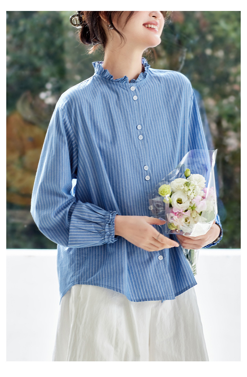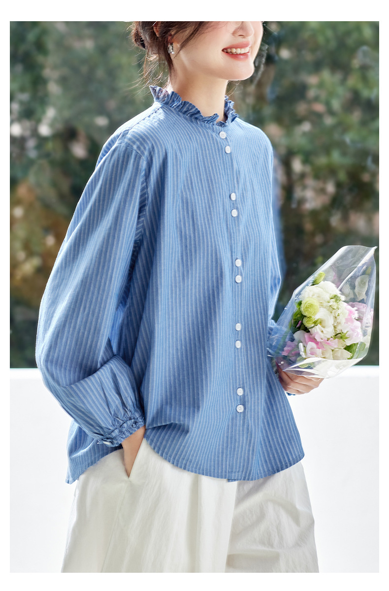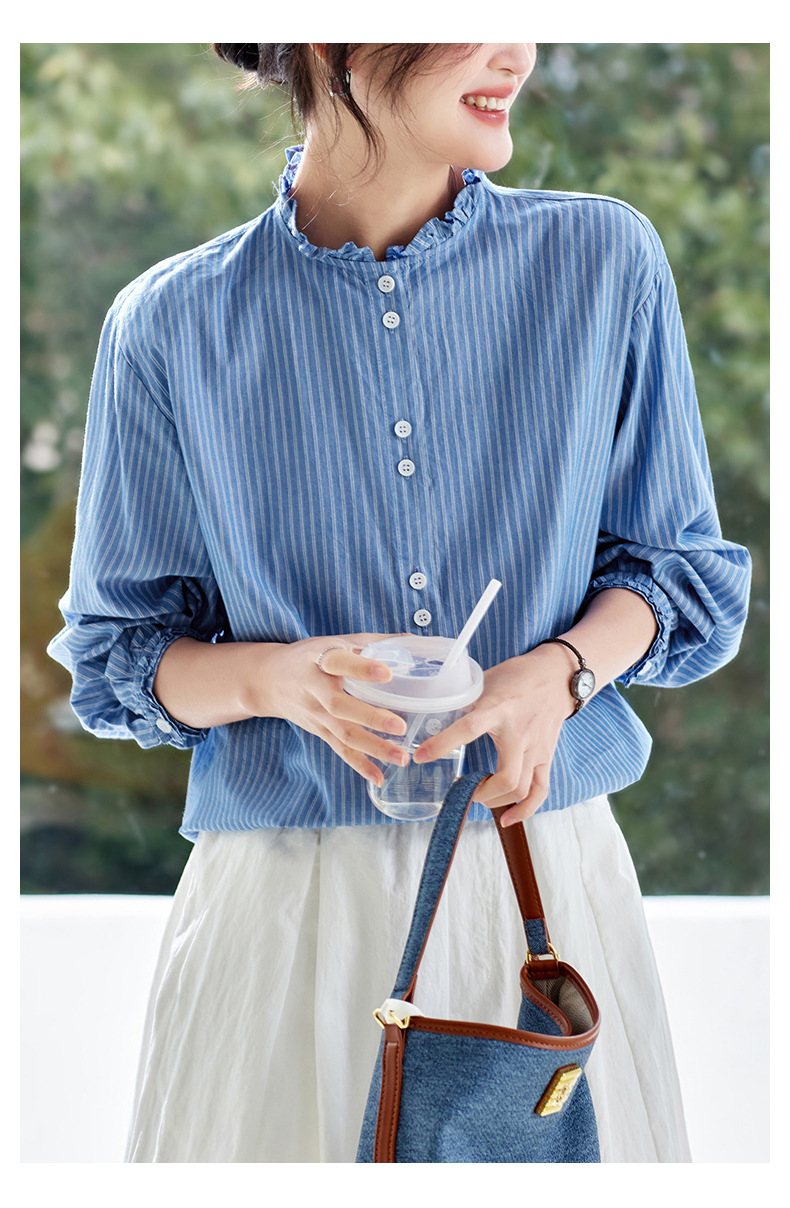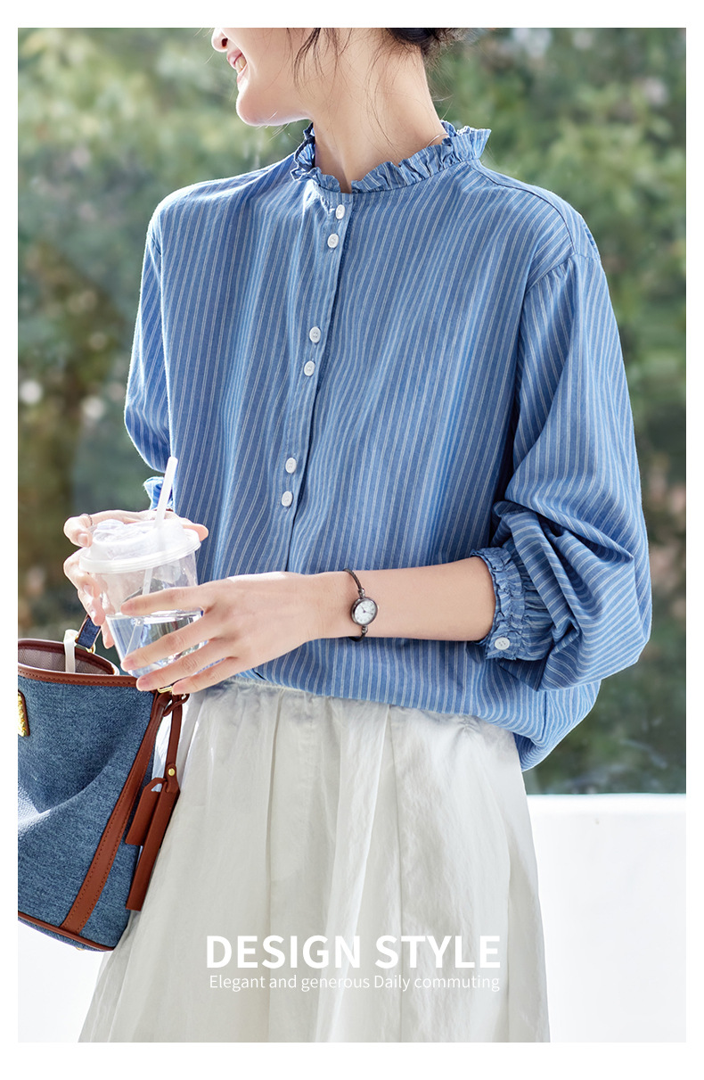丁摩 蓝色条纹衬衫女长袖春装新款木耳领内搭叠穿上衣衬衣6ZF-61041