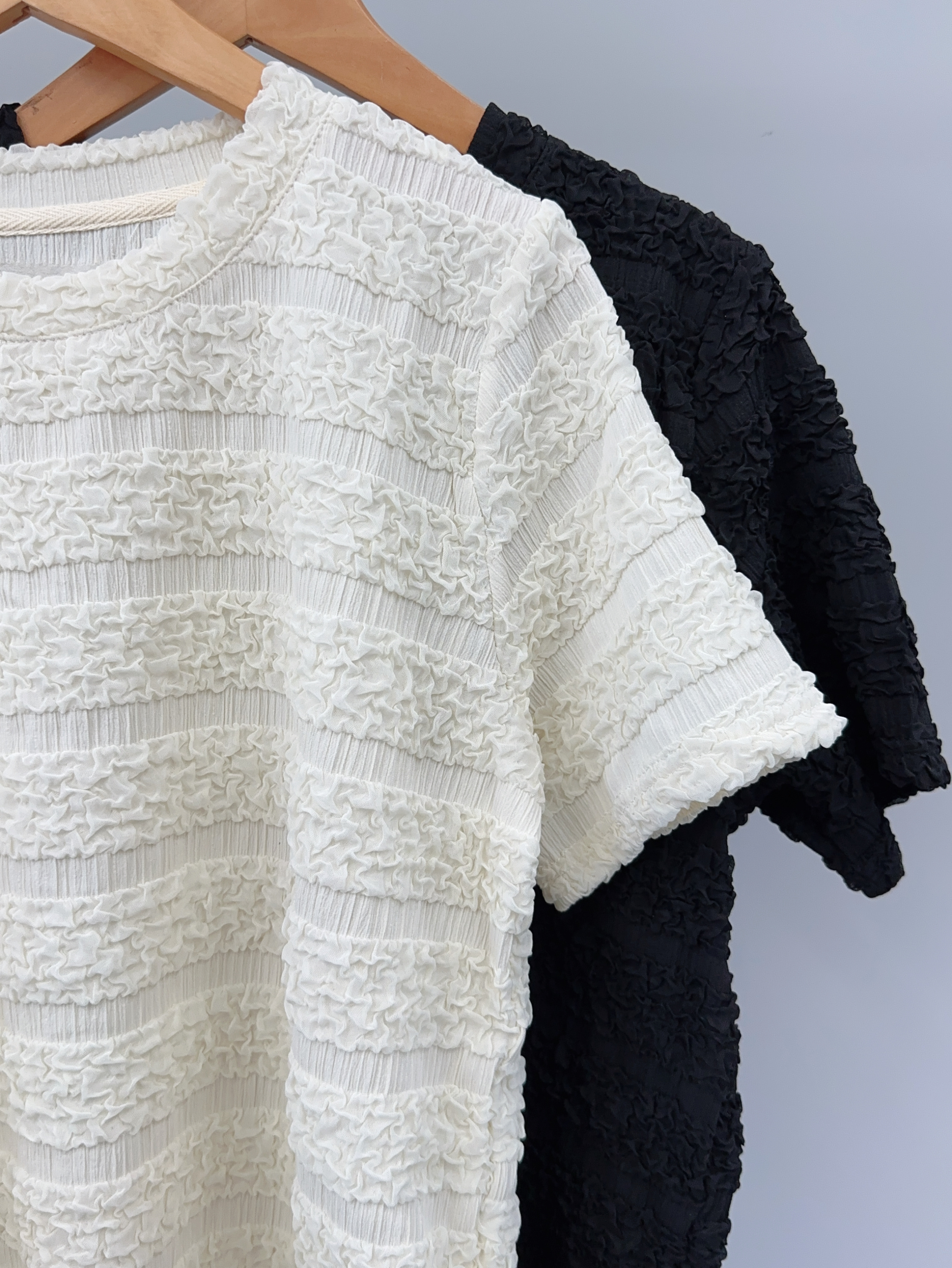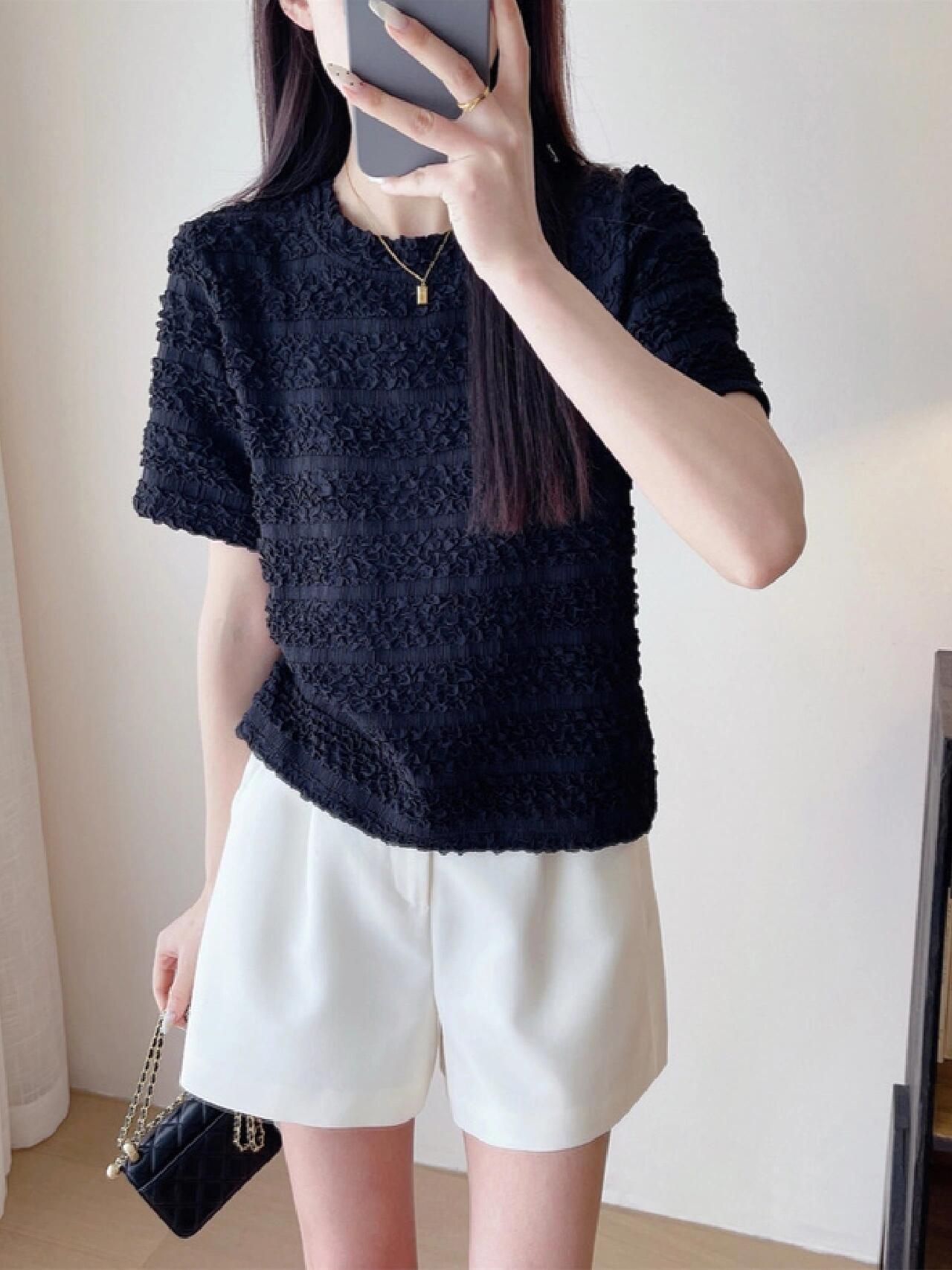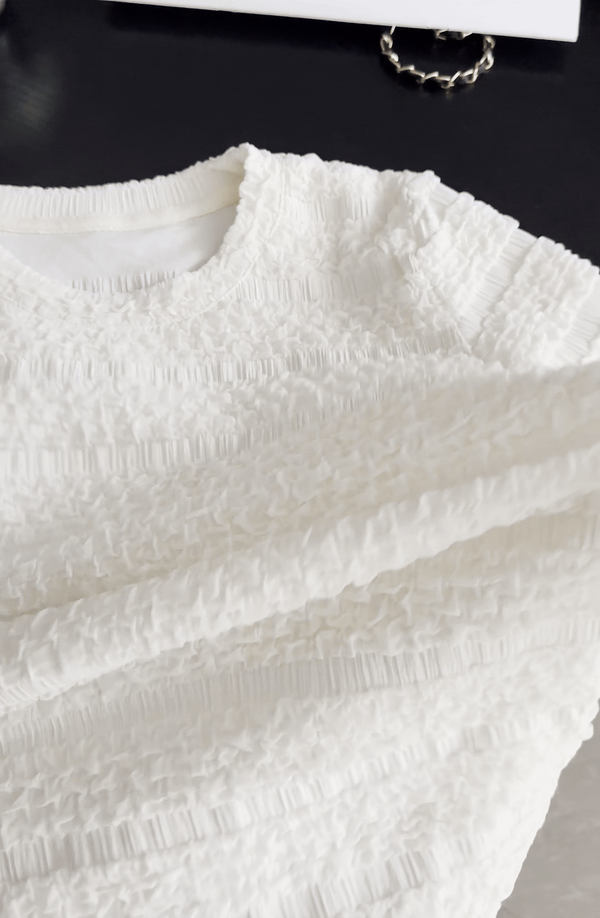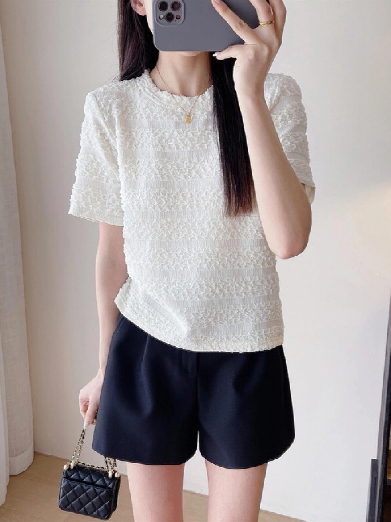 【樱西玛ENXIMANE 重工褶皱肌理感网纱短袖T】经典圆领正肩短款设计 舒适百搭 细腻柔软 不会闷热