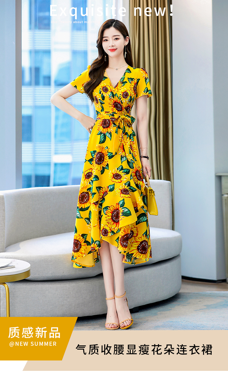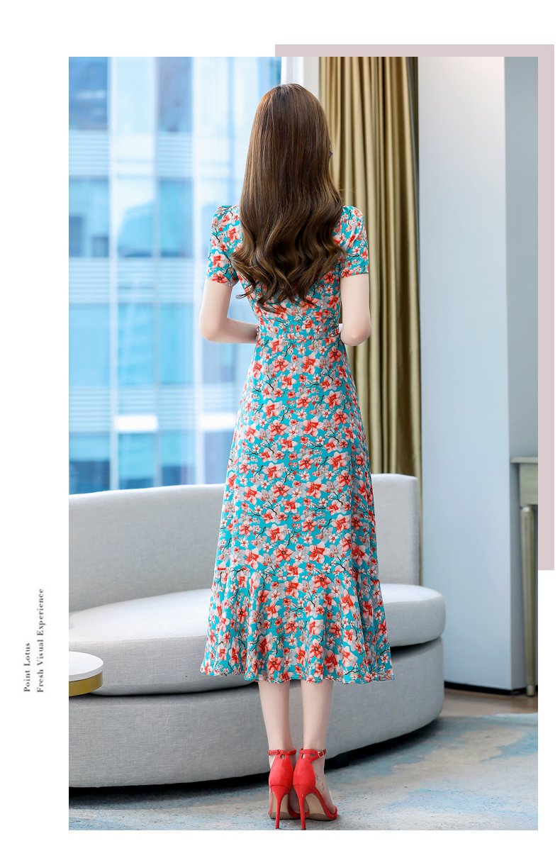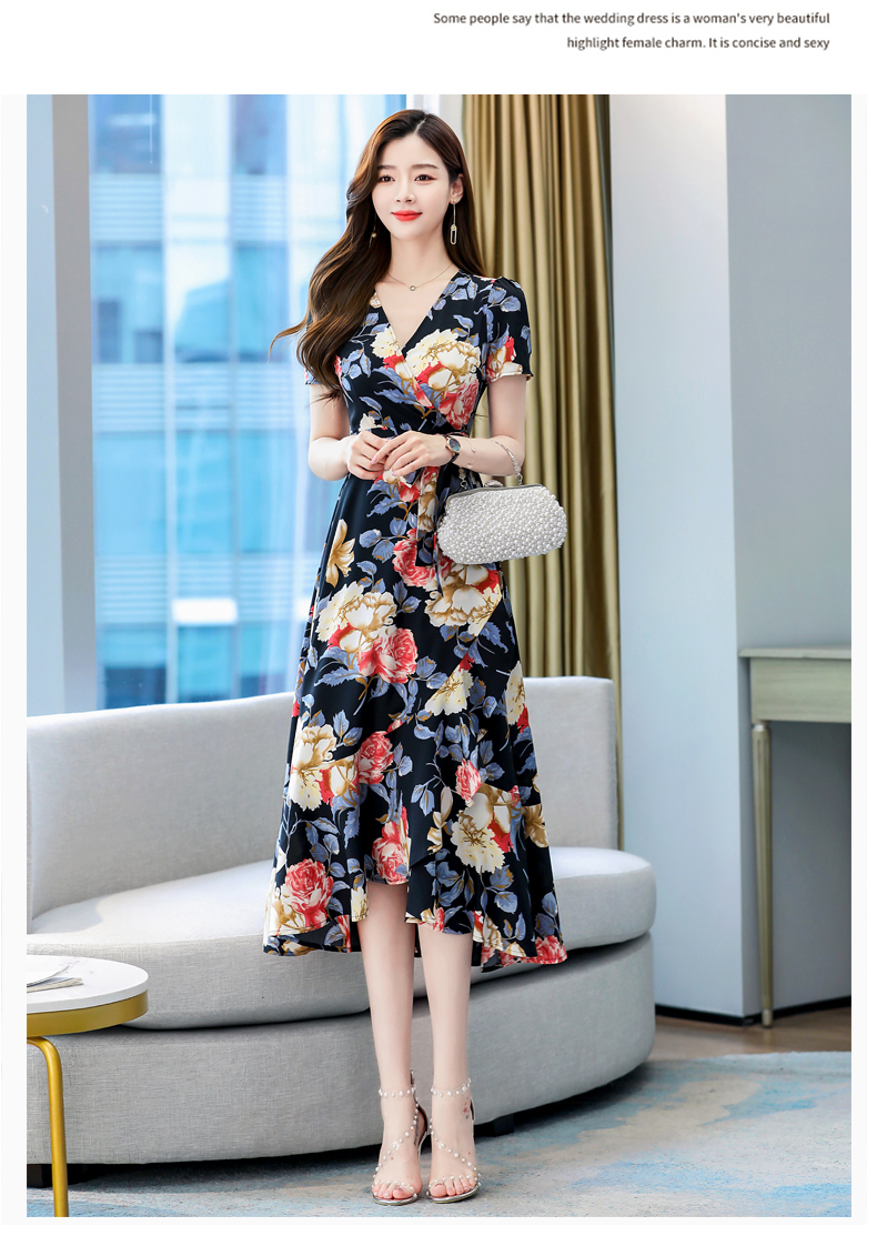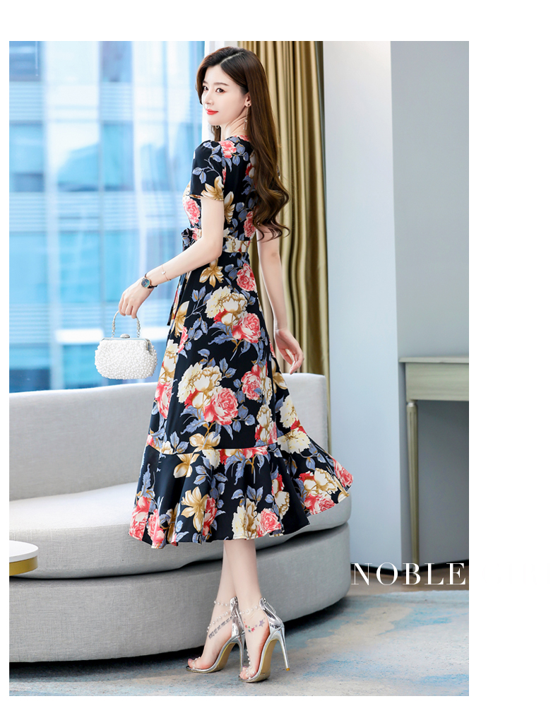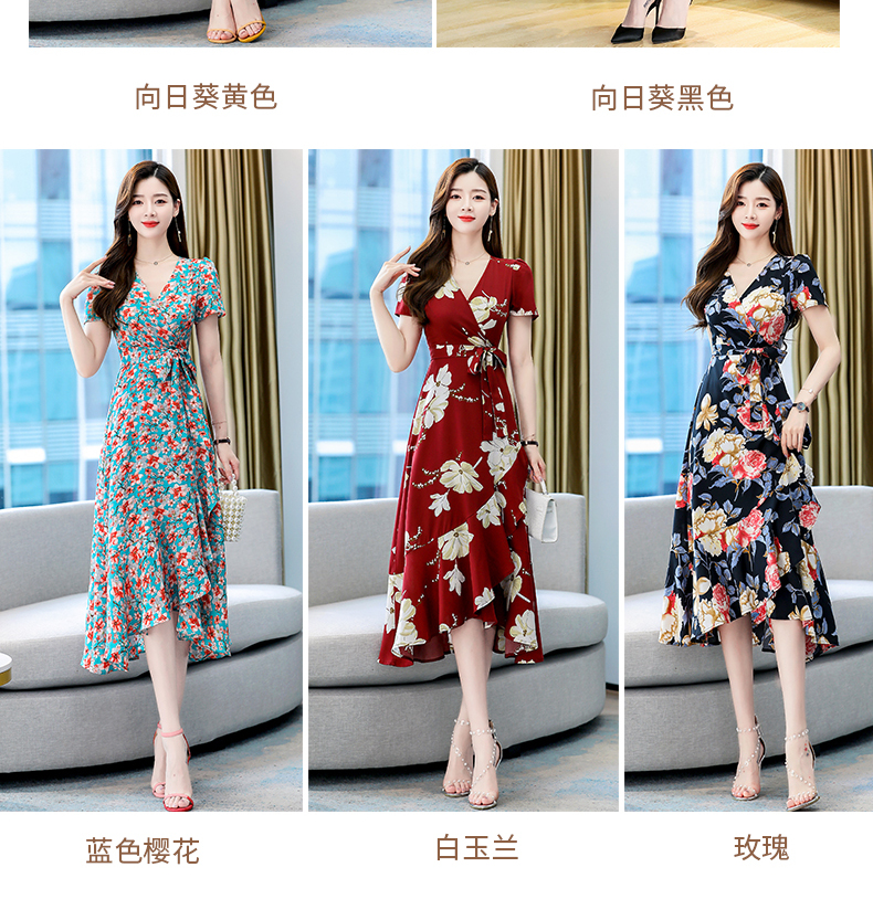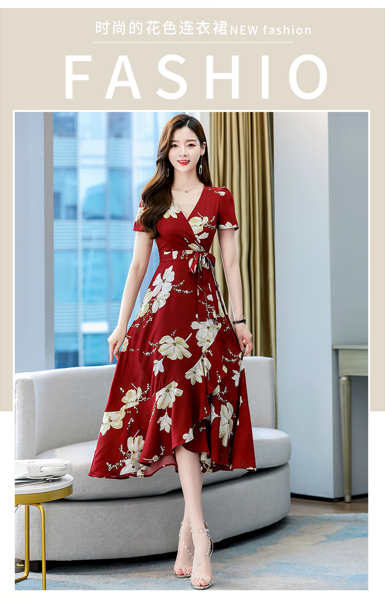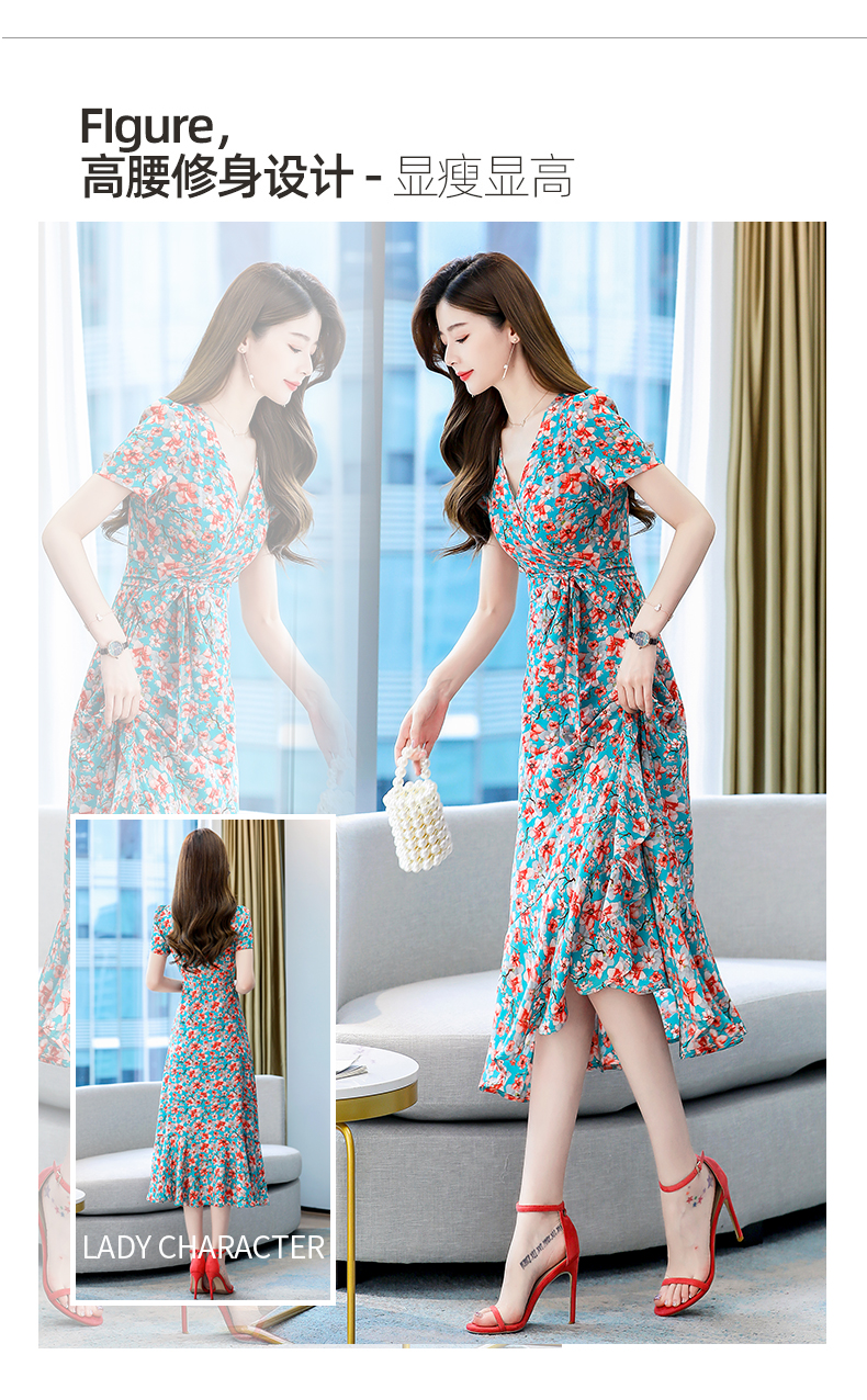 新款花朵连衣裙法式短袖V领雪纺修身高腰显瘦长裙大码HAYR72161