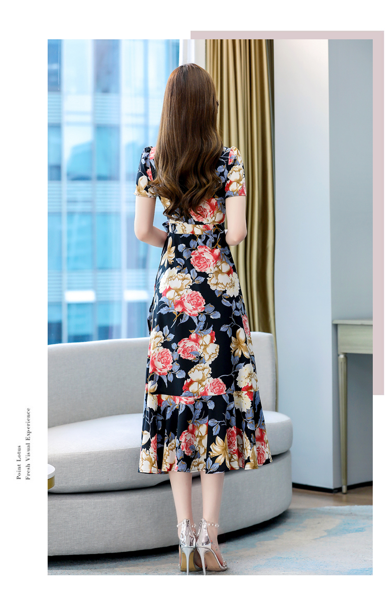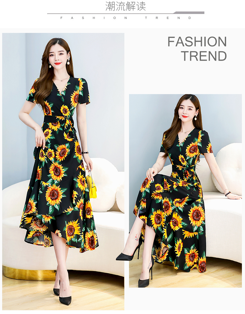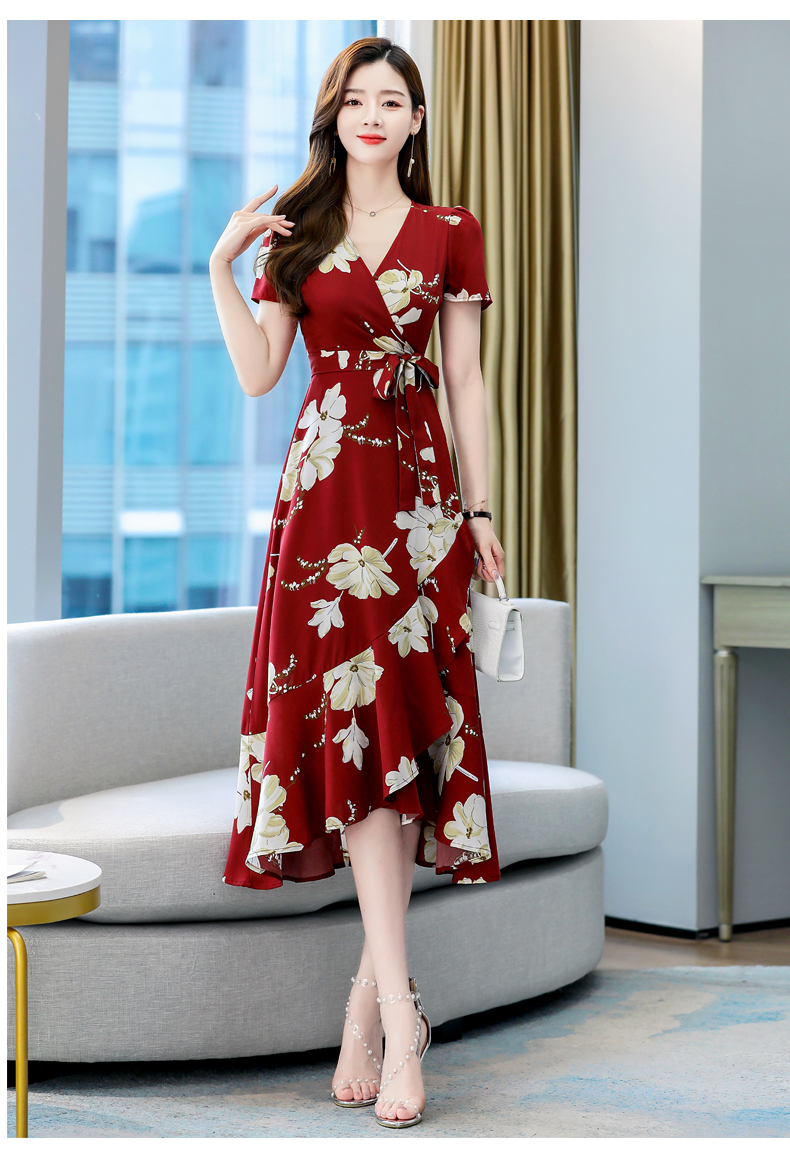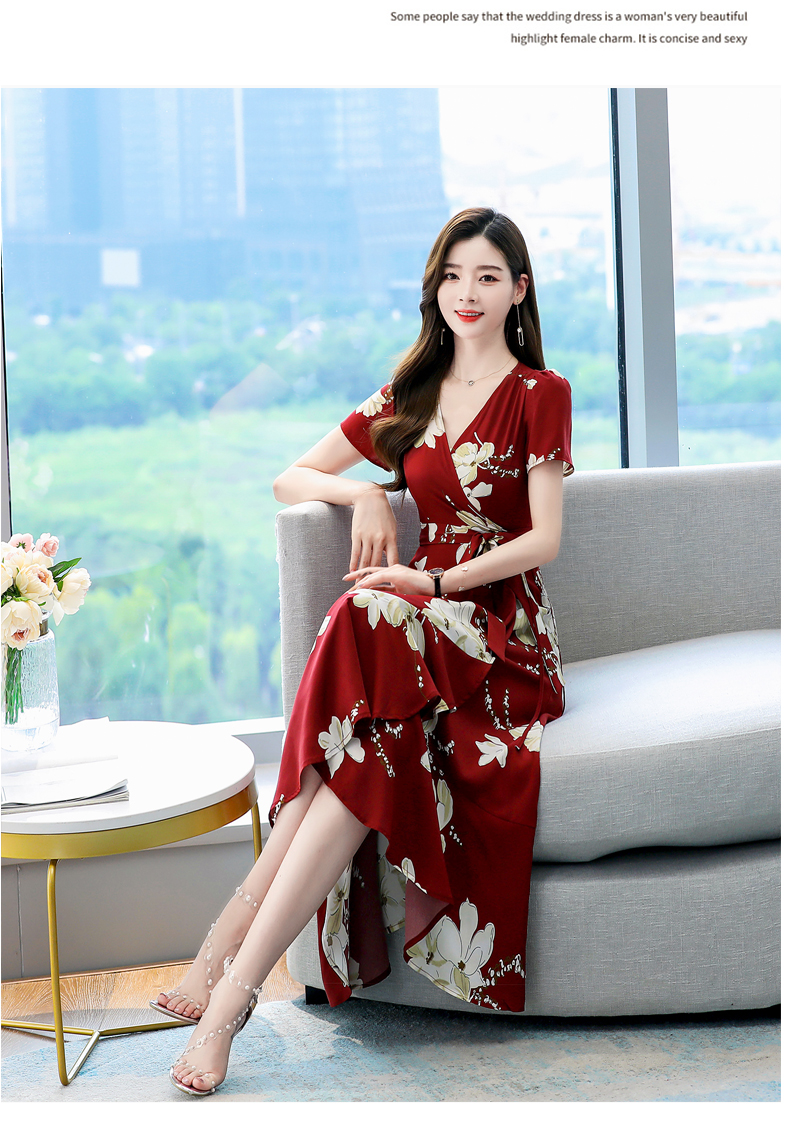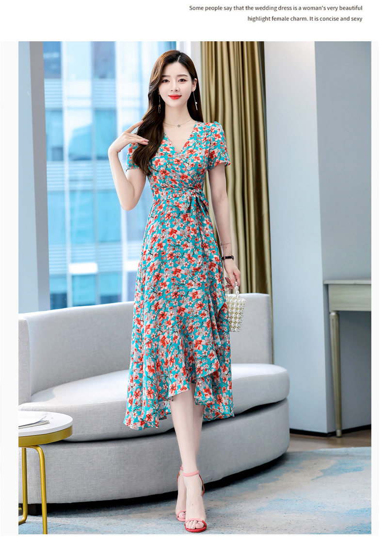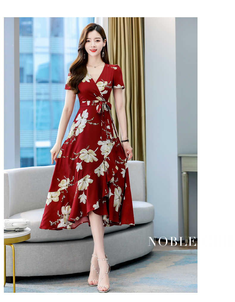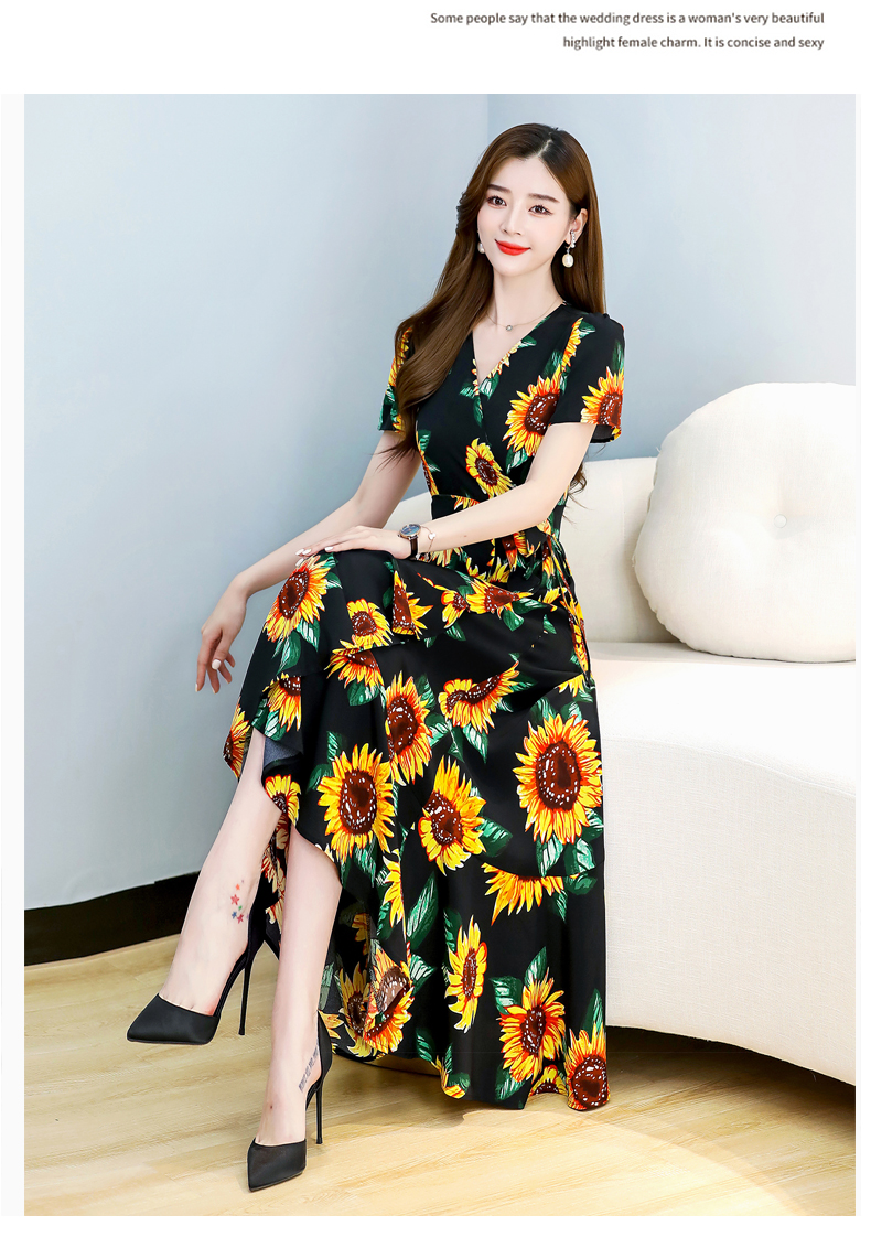新款花朵连衣裙法式短袖V领雪纺修身高腰显瘦长裙大码HAYR72161